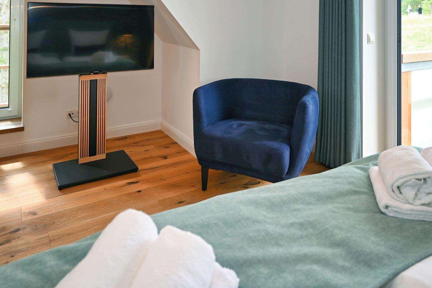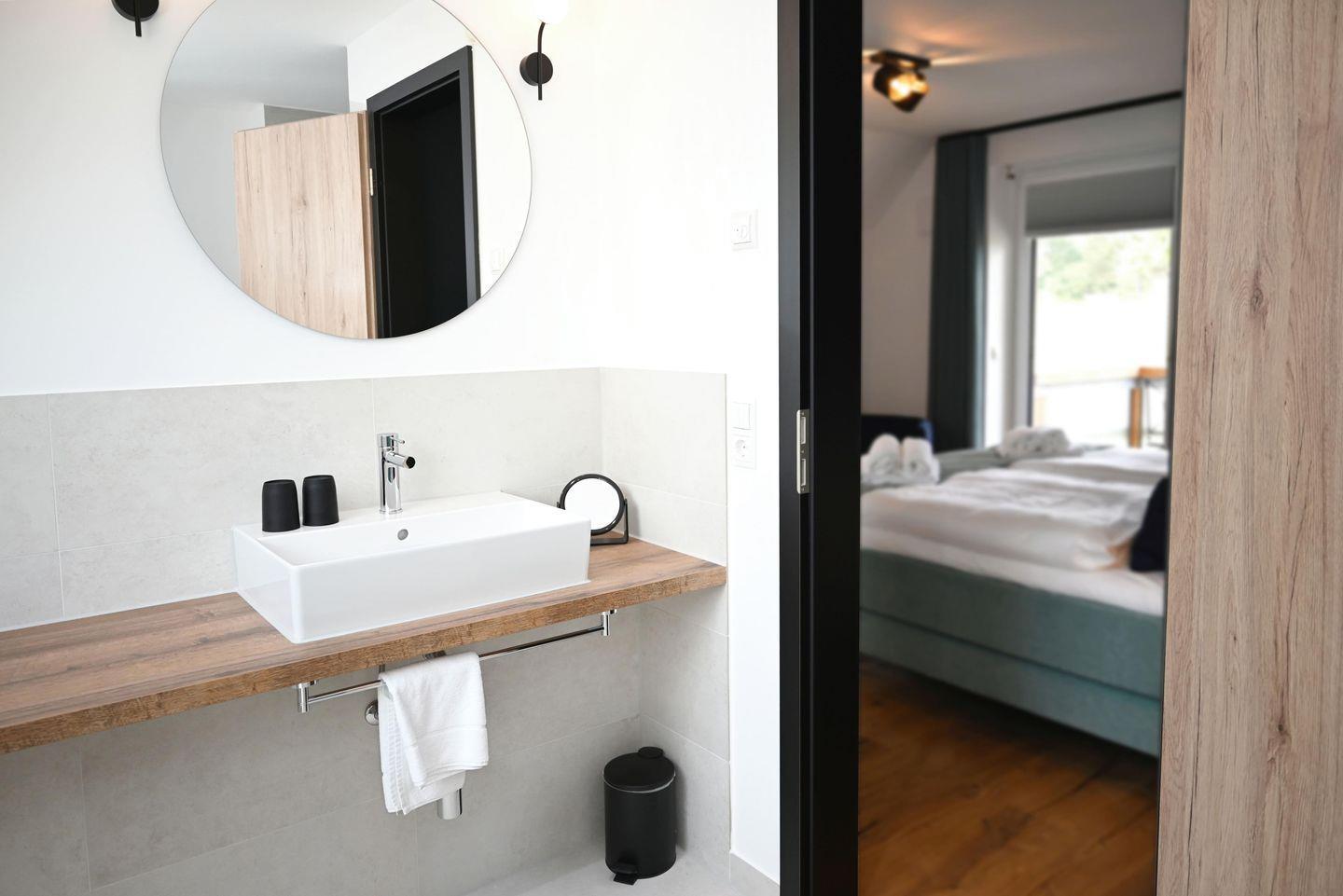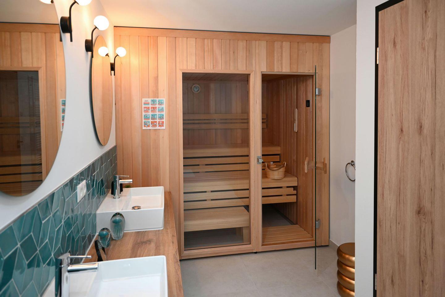 Im hellen Obergeschoss befindet sich ein großes Schlafzimmer mit komfortablen Doppelbett mit eigenem Balkon sowie ein geräumiges Badezimmer. Für erholsame Stunden sorgt Ihr privater Wellnessbereich mit Sauna und Bad im Untergeschoss. Es besteht eine weitere Schlafmöglichkeit für bis zu 2 Personen. In einem separaten Raum stehen zusätzlich eine Waschmaschine und ein Trockner zur Verfügung.