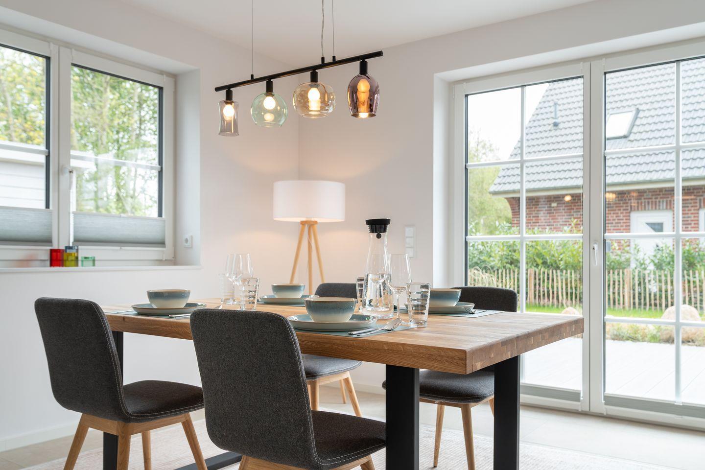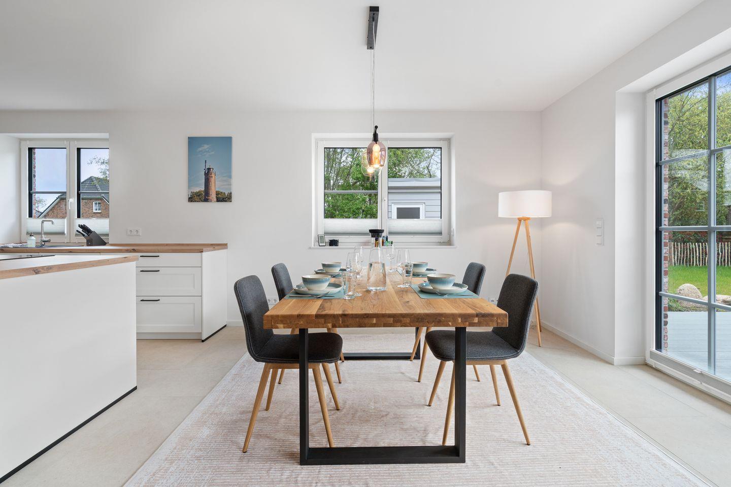 Das Herzstück der Unterkunft ist die offene Küche, die harmonisch mit dem Wohnzimmer verbunden ist und zum gemeinsamen Kochen und Entspannen einlädt. Die moderne Küche ist mit einem Induktionsherd, Backofen, Kühlschrank mit Gefrierfach und Geschirrspüler ausgestattet. Ein Wasserkocher und eine Kaffeemaschine sorgen für den perfekten Start in den Tag