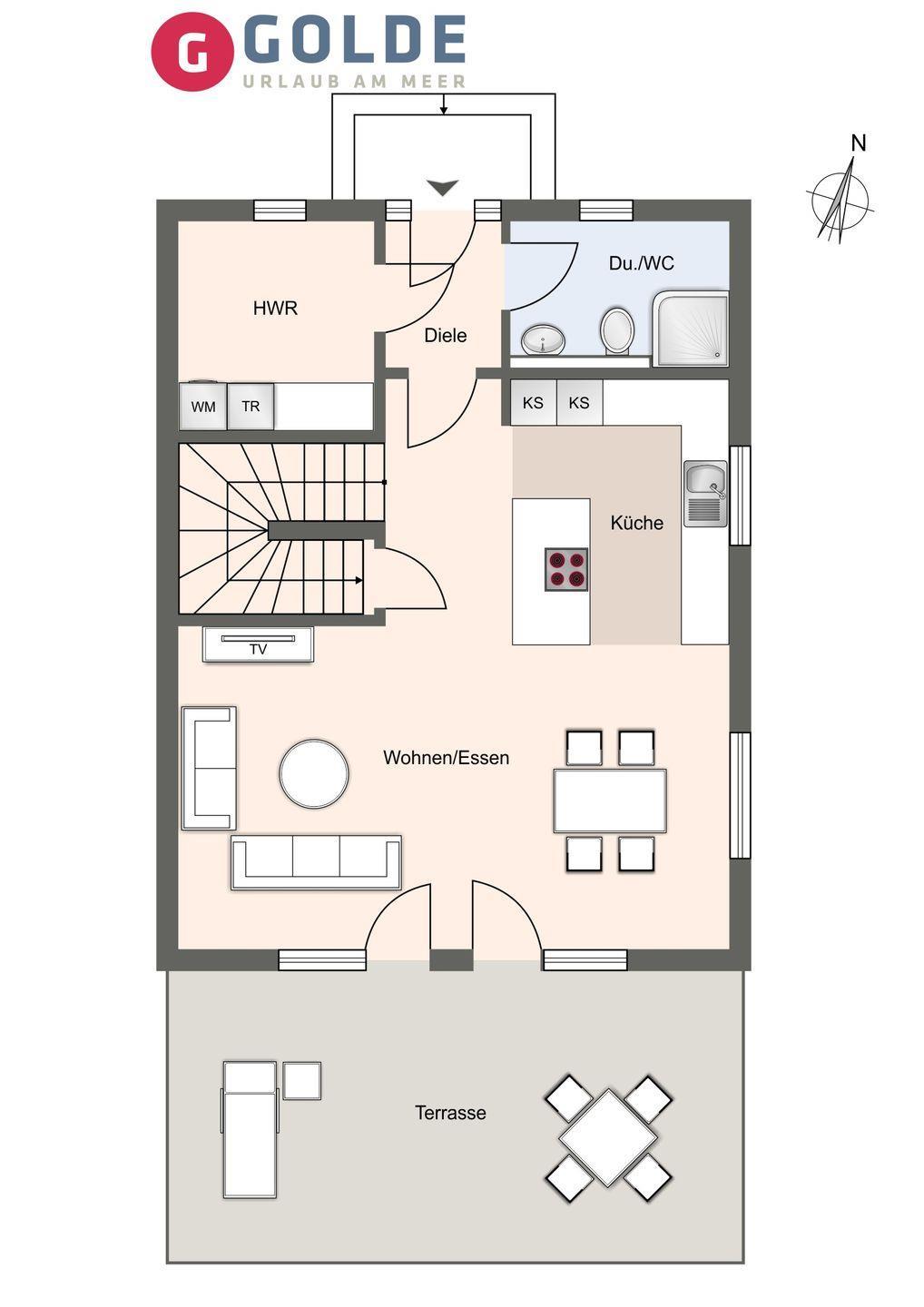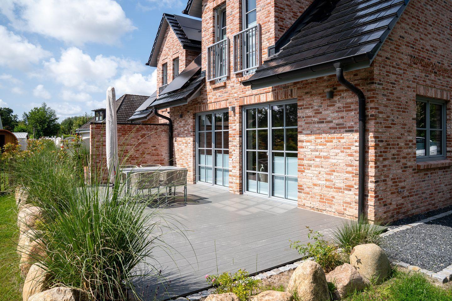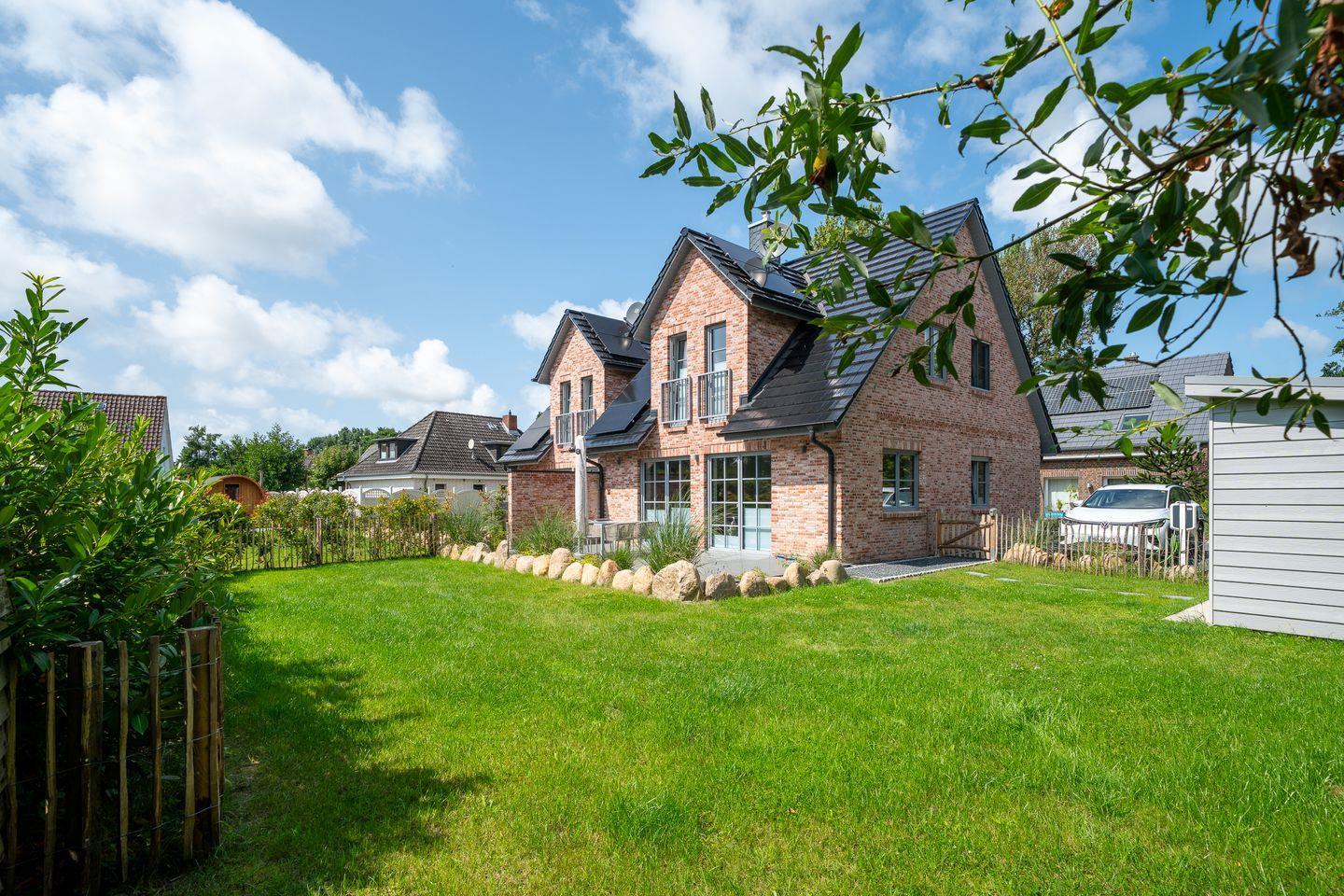 Die Terrasse im eingezäunten Garten lädt zum Entspannen ein und bietet die Möglichkeit, die frische Nordseeluft zu genießen. Ein Sichtschutz garantiert Ihnen Privatsphäre. Zudem steht Ihnen auch ein Gartenhaus zur Verfügung, wo Sie Ihre E-Bikes sicher verschließen und kostenfrei laden können.