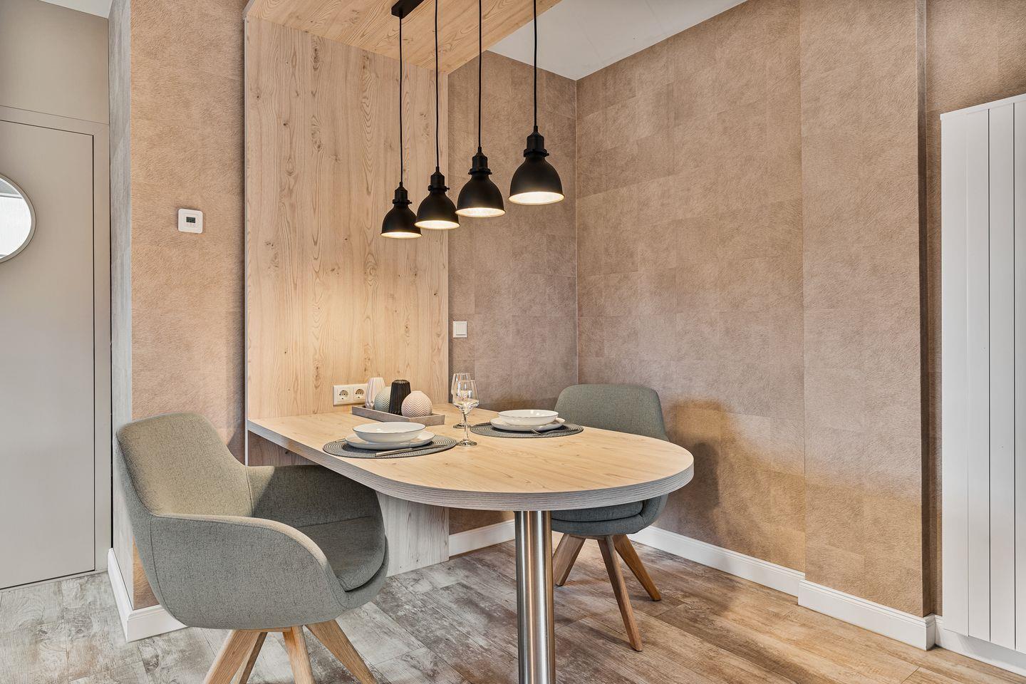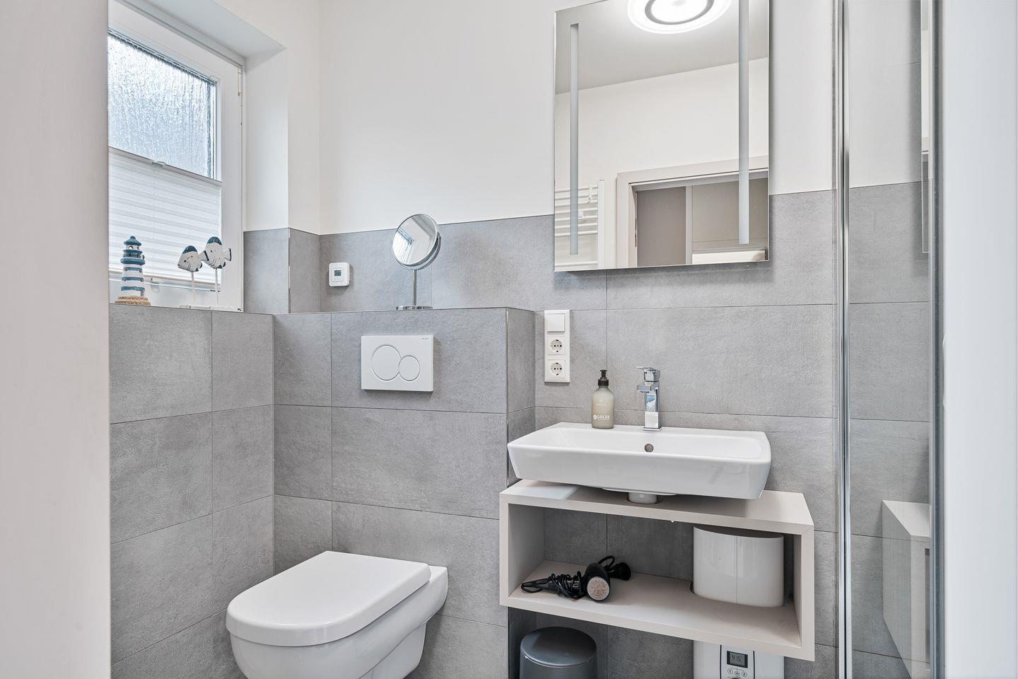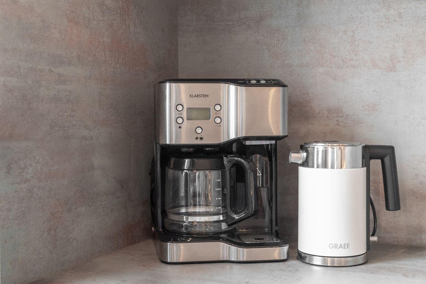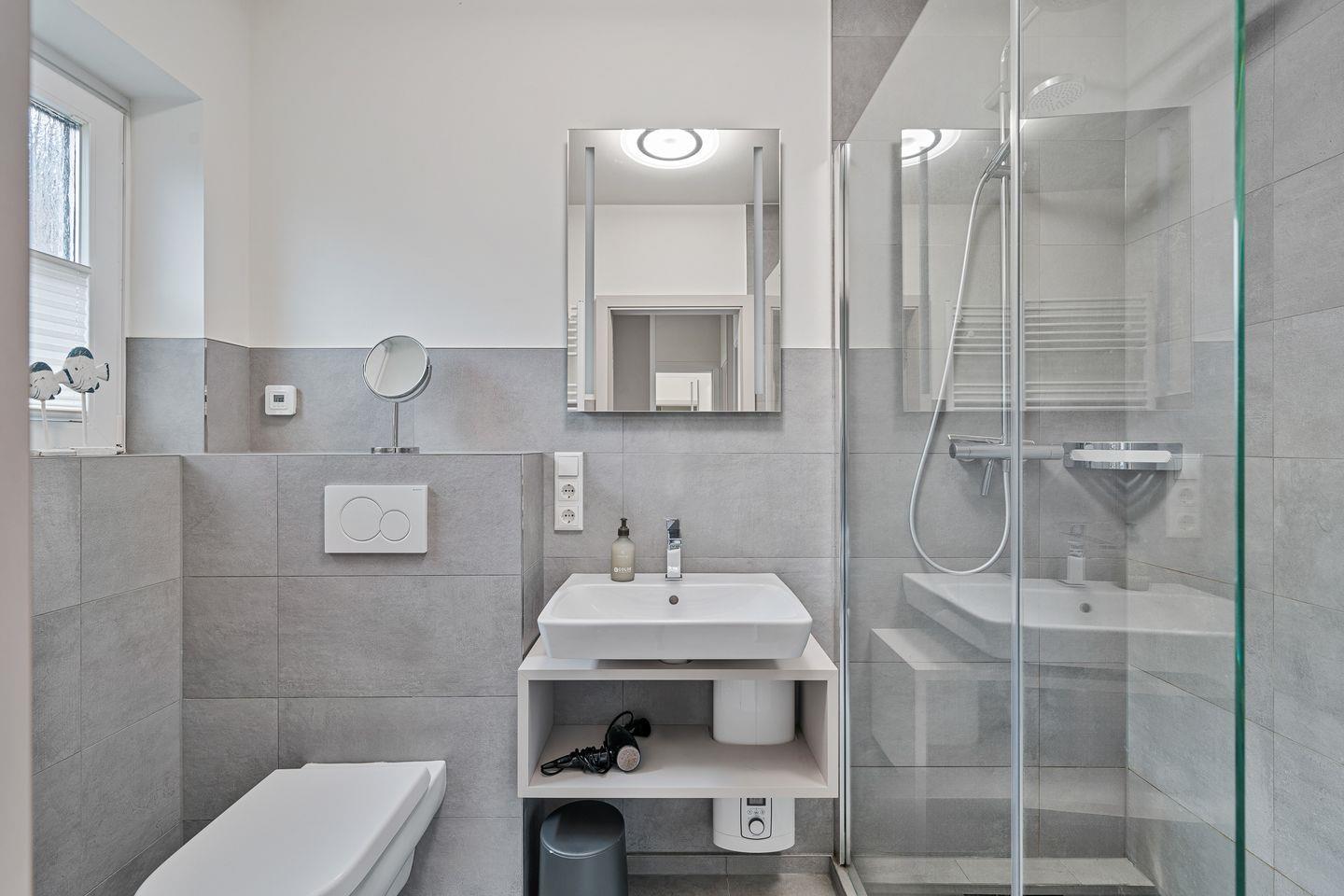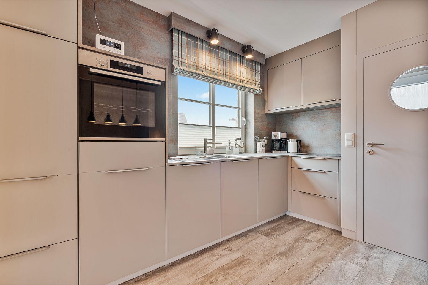 Die offene, moderne Einbauküche lässt keine Wünsche offen: Ausgestattet mit Backofen, Geschirrspüler, Kühlschrank mit Gefrierfach und Kaffeemaschine bietet sie alles, was man zum Kochen und Genießen braucht. Ein kleiner Flur führt Sie in das stilvoll gestaltete Duschbad mit WC.
