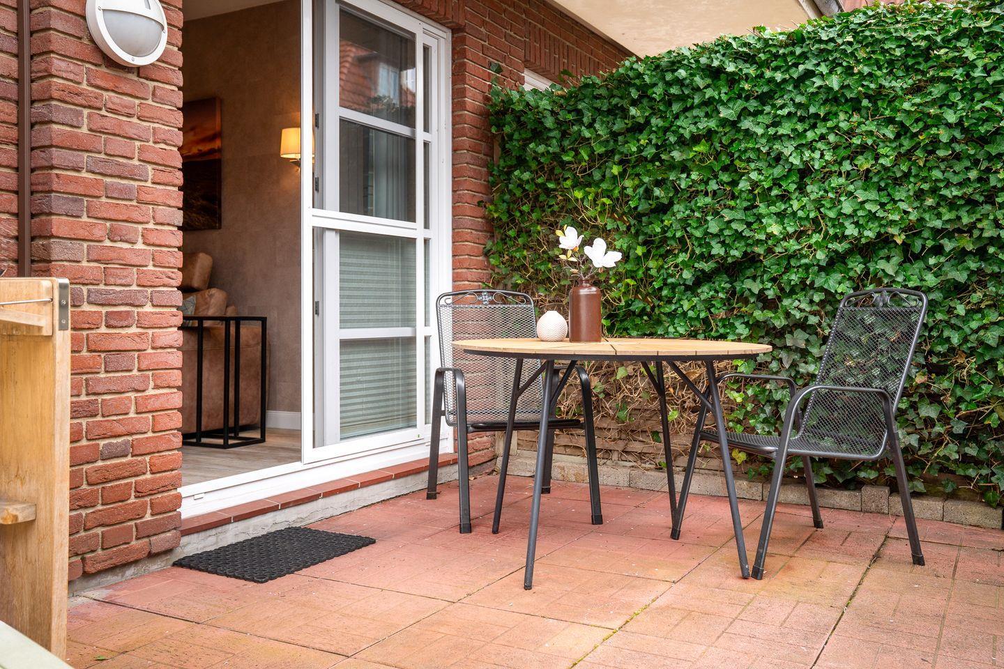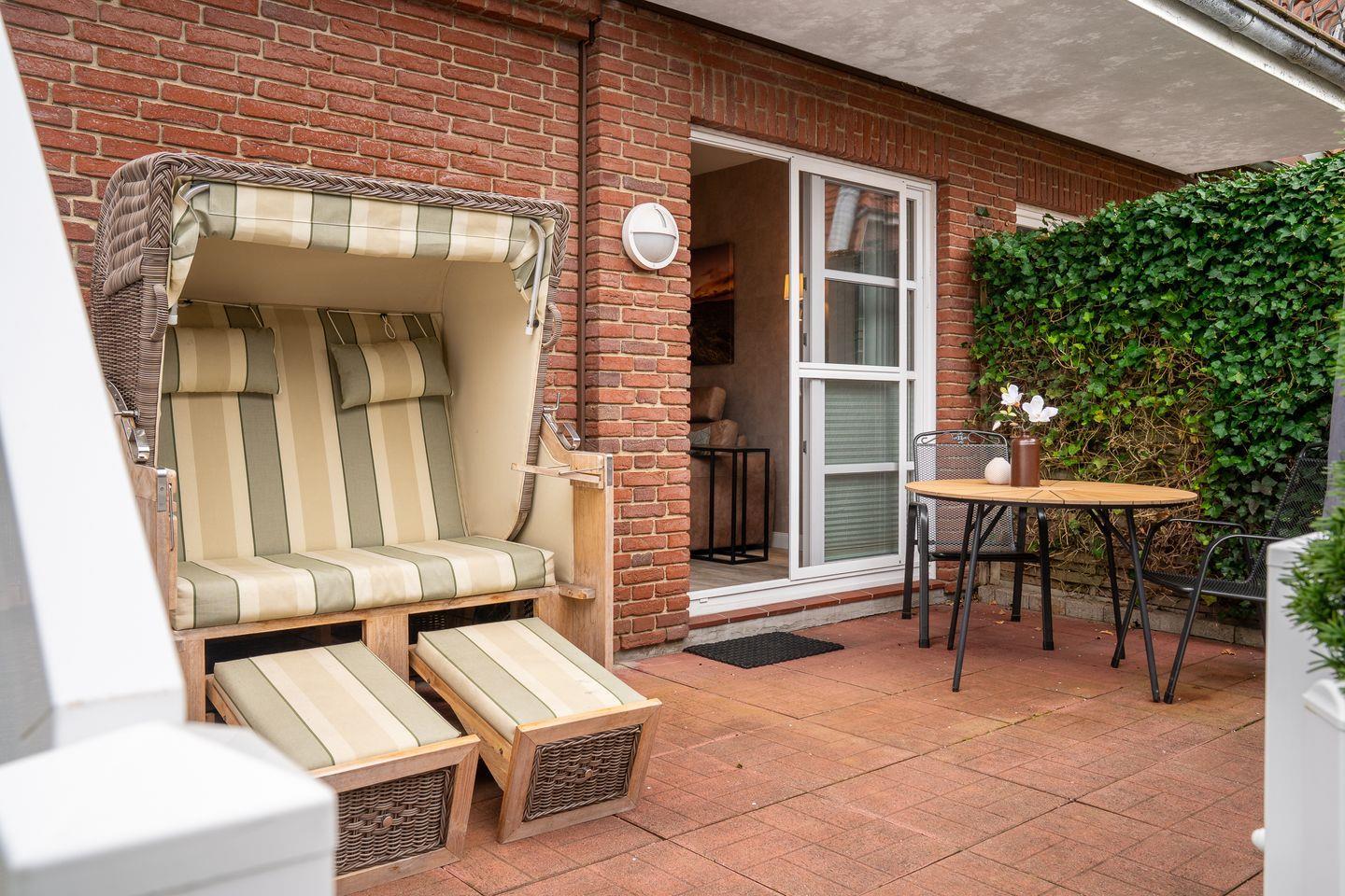 Die sonnige Terrasse mit einem gemütlichen Strandkorb bietet den perfekten Ort, um die Seele baumeln zu lassen.