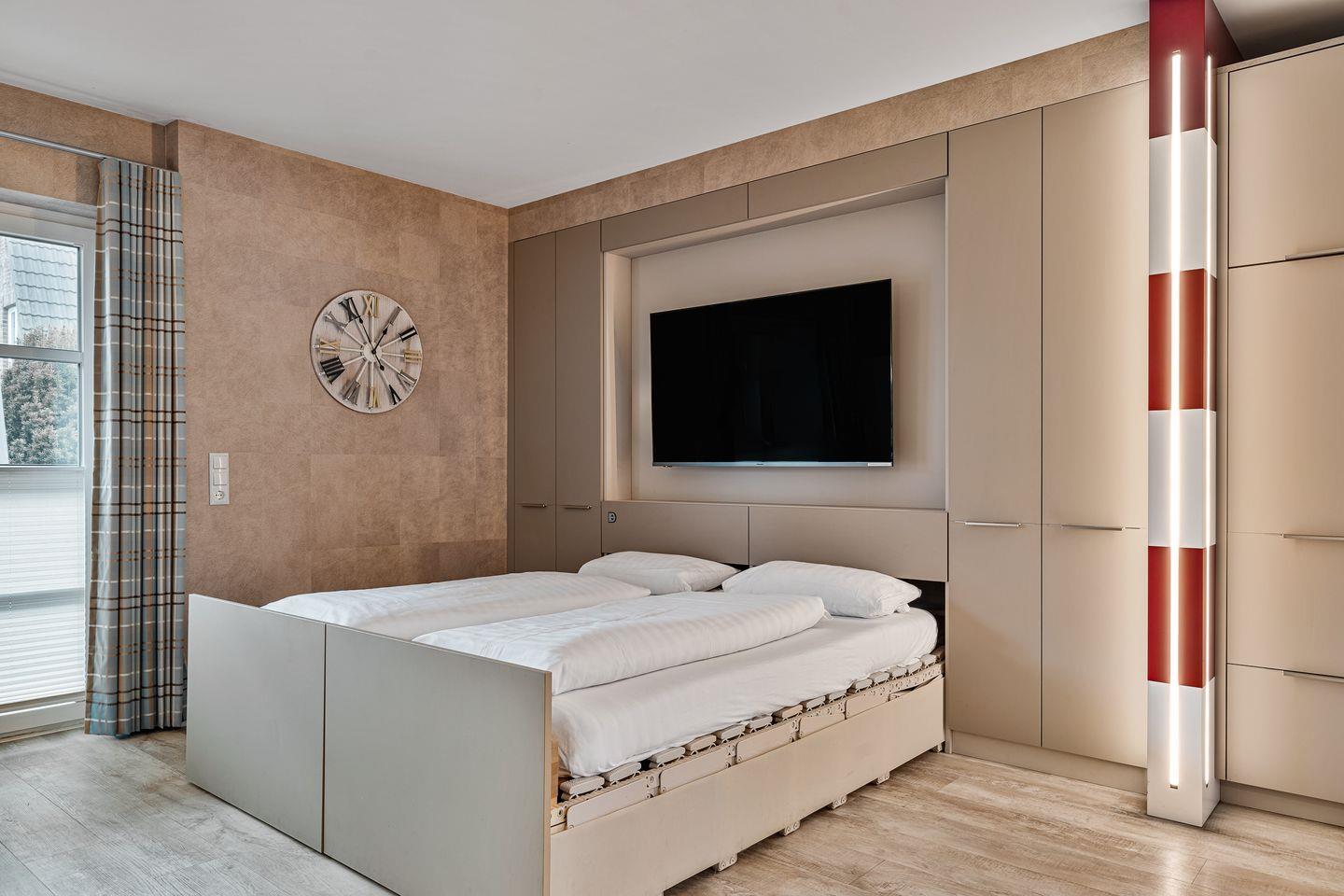 Der einladende Wohnbereich überzeugt mit einer gemütlichen Essecke und einem hochwertigen Ledersofa mit elektrischer Relaxfunktion – ideal für entspannte Abende zu zweit. Ein clever integriertes Belitec-Schrankbett verwandelt den Raum bei Bedarf in ein behagliches Schlafzimmer. Tagsüber lässt sich das Bett dezent im Schrank verstauen, wodurch ein großzügiges Wohnambiente entsteht.