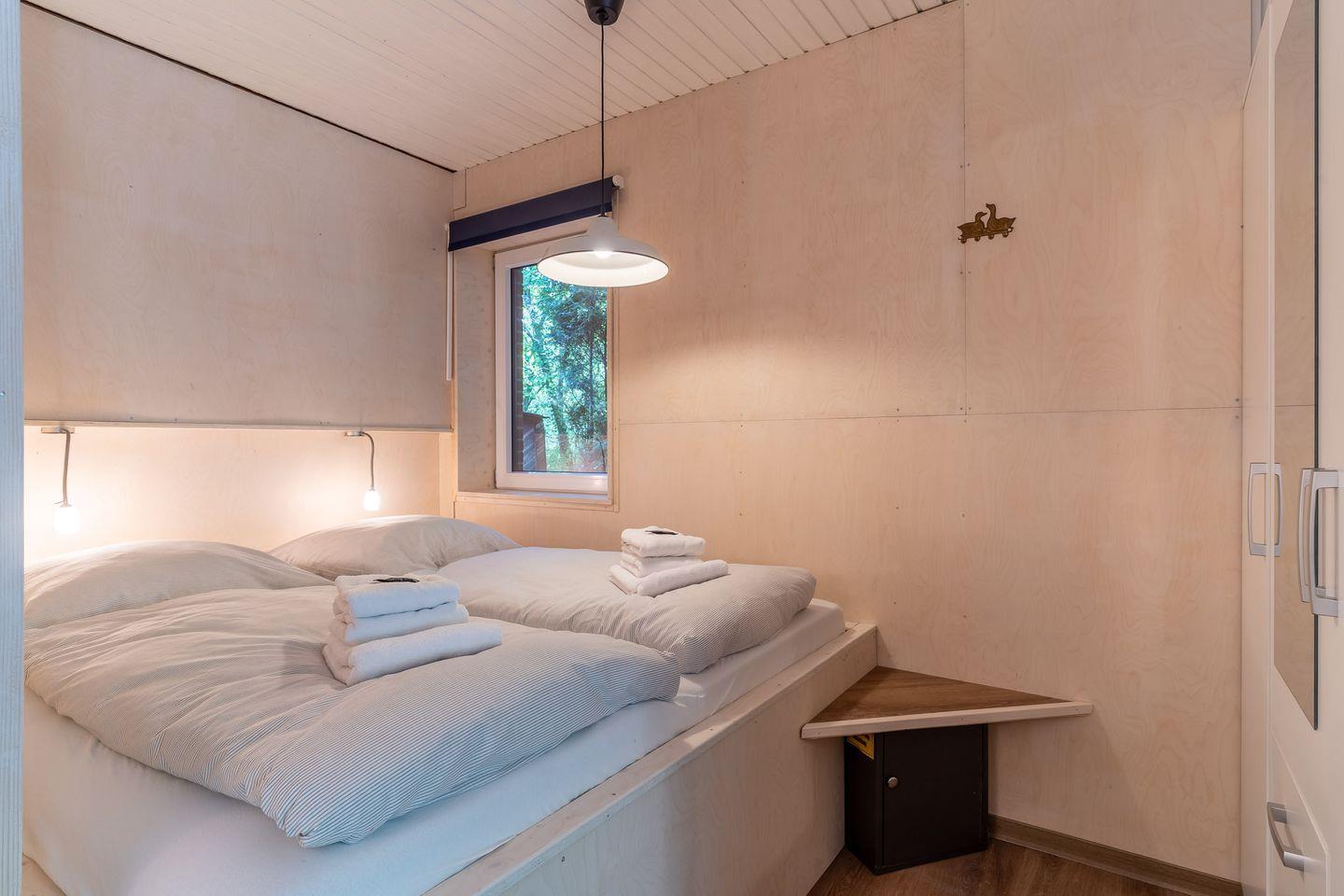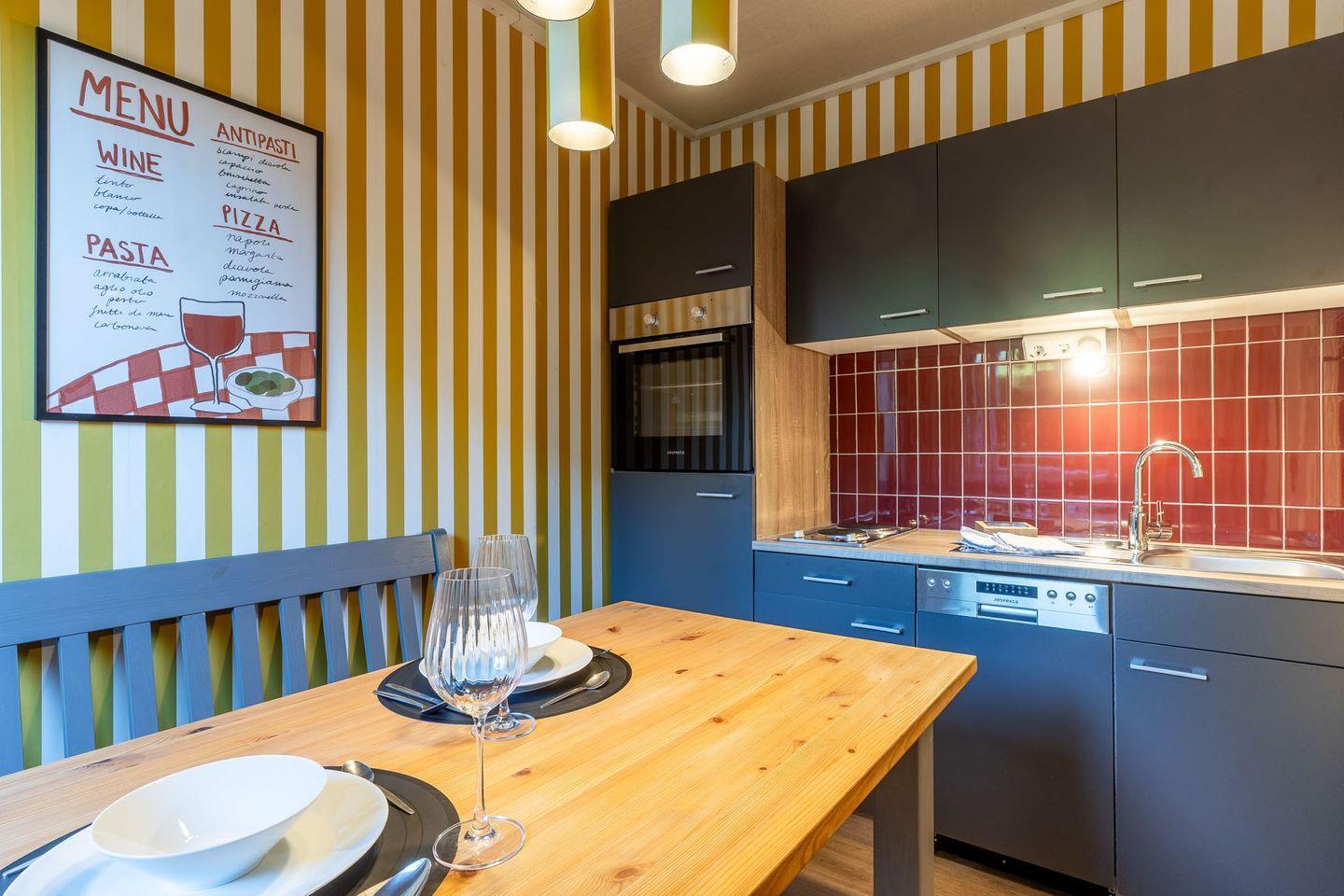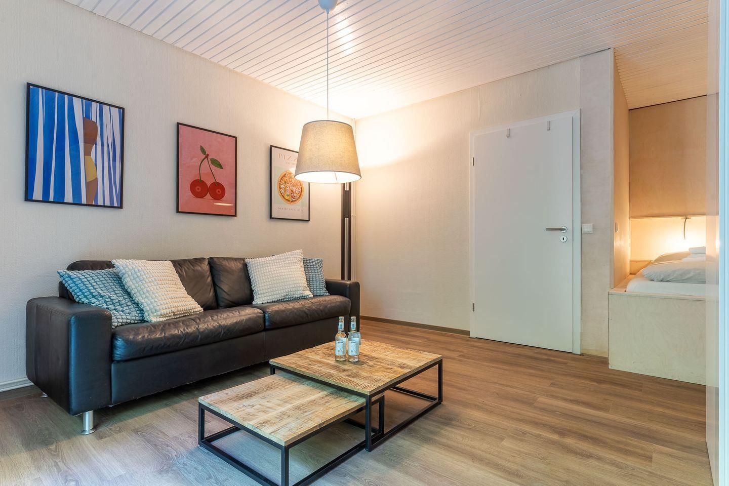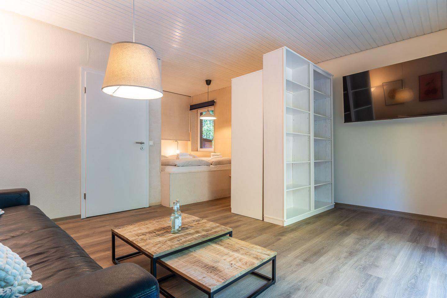Der helle Wohn-Schlafbereich verfügt über ein komfortables Doppelbett (1,80 x 2,00 m), einen Essplatz und eine gemütliche Sitzecke. Die separate Küche ist komplett ausgestattet (2er Kochfeld, Backofen, Kühlschrank, Kaffeemaschine etc.) – ideal für Selbstversorger.