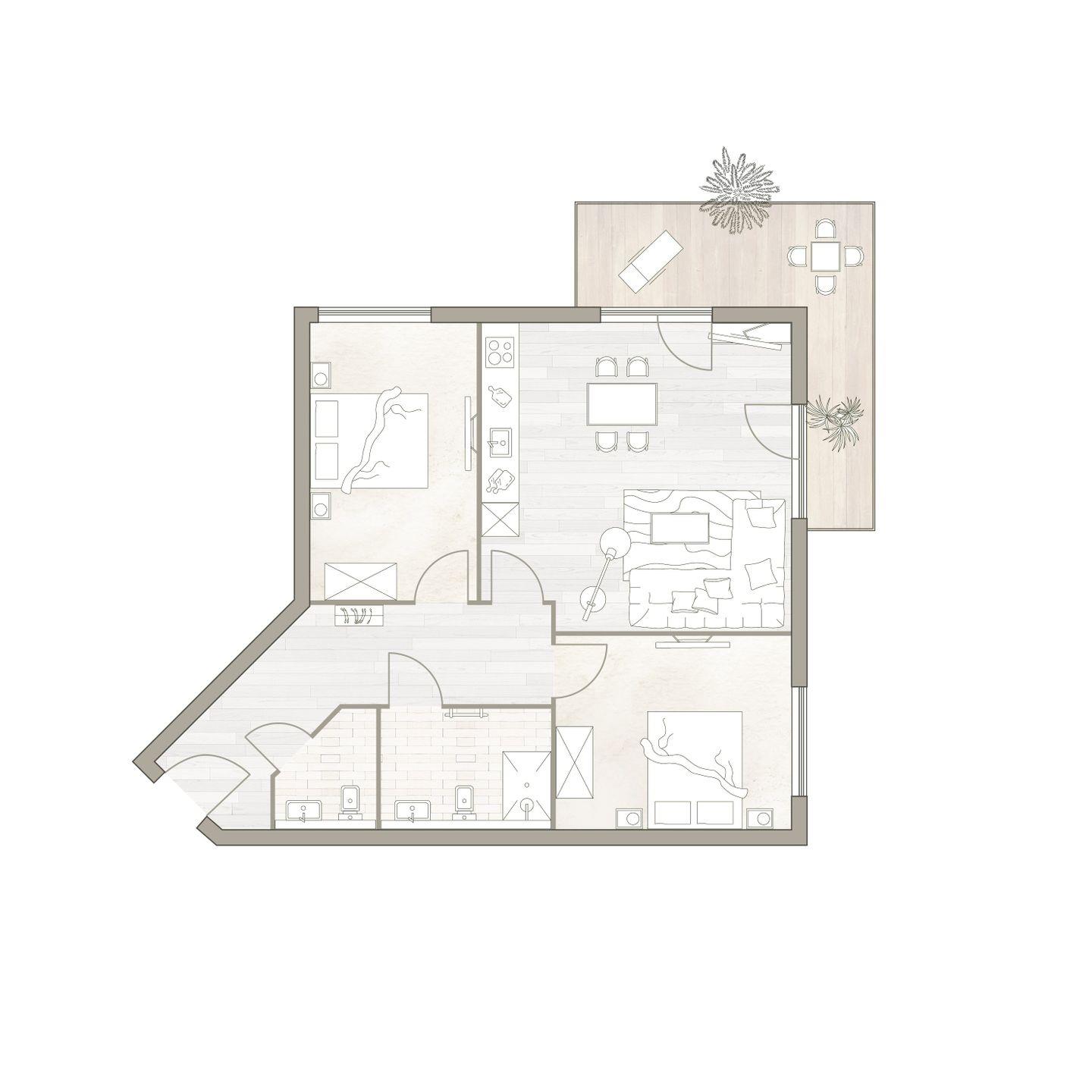 Der offen gestaltete Wohn-Essbereich mit integrierter Küche wird von zwei Seiten mit Tageslicht durchflutet. Der große Esstisch ist ein Ort zum Zusammensein ebenso wie die gemütliche Sofaecke in hellem Naturton. Auf der möblierten Terrasse lässt sich der Urlaubstag mit einem Frühstück in der Sonne beginnen. Die zwei Schlafzimmer sind mit je einem komfortablen Doppelbett, Schrank und Smart TV ausgestattet. Zudem verfügt das Apartment über ein modernes, mit anthrazitfarbenen Natursteinfliesen gestaltetes Badezimmer und ein separates WC.