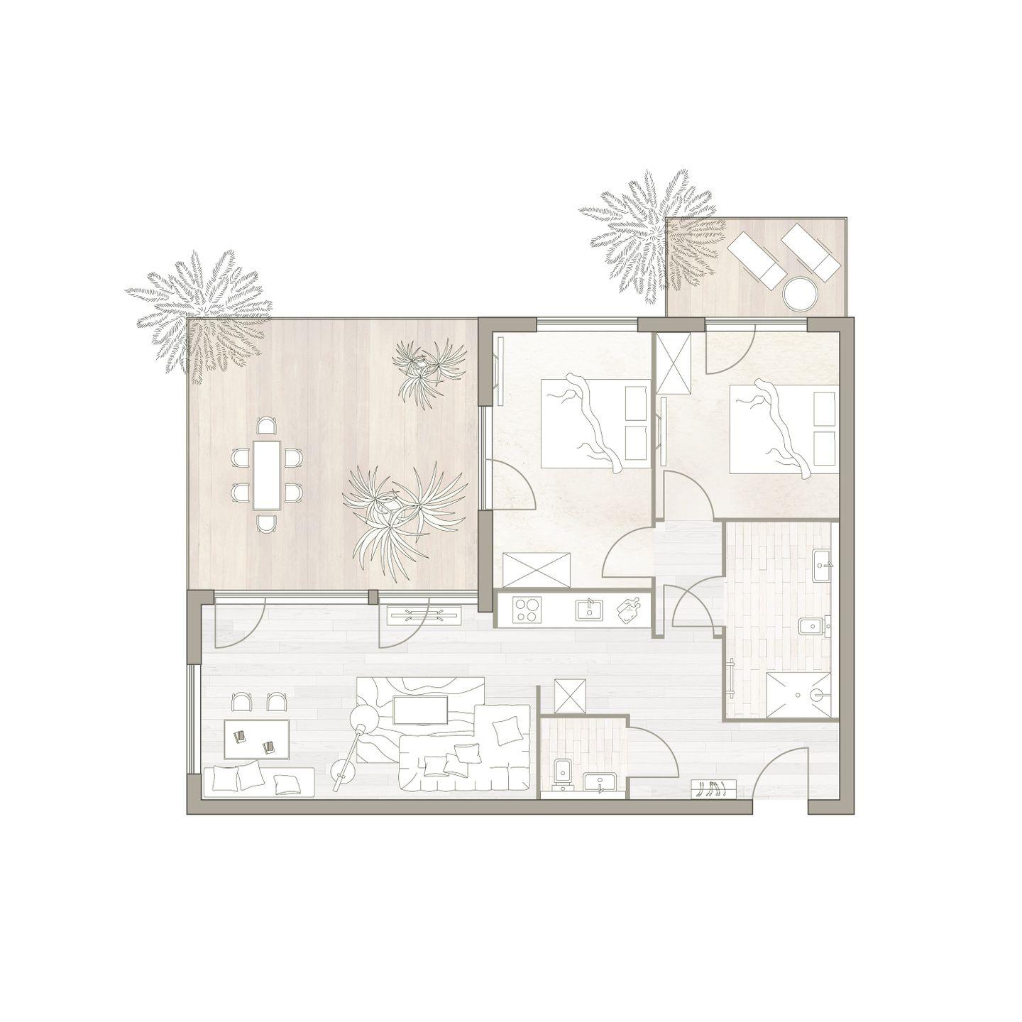 Der offen gestaltete Wohn-Essbereich mit integrierter Küche wird von zwei Seiten mit Tageslicht durchflutet. Der Essplatz ist ein Ort zum Zusammensein ebenso wie die gemütliche Sofaecke in hellem Naturton. Die große, möblierte Dachterrasse in Nord-West/Nord-Ost-Lage bietet Raum für entspannte Momente. Die zwei Schlafzimmer sind mit je einem komfortablen Doppelbett, Schrank und Smart TV ausgestattet, eines der Zimmer zudem mit einem eigenen Balkon. Ein stilvolles Badezimmer und ein separates WC ergänzen die durchdachte Raumaufteilung.