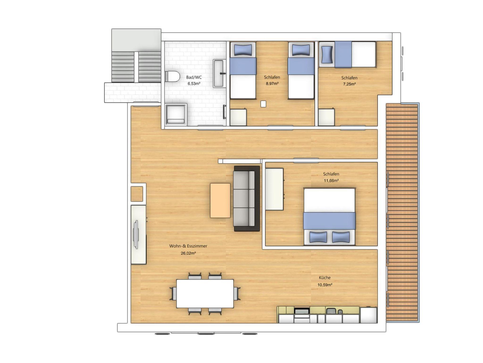 Die Wohnung hat einen seperaten Eingang mit eigenem Treppenhaus und befindet sich im 1. Stock.