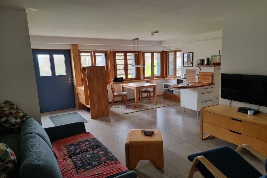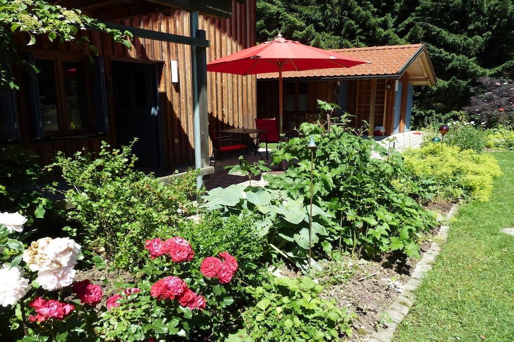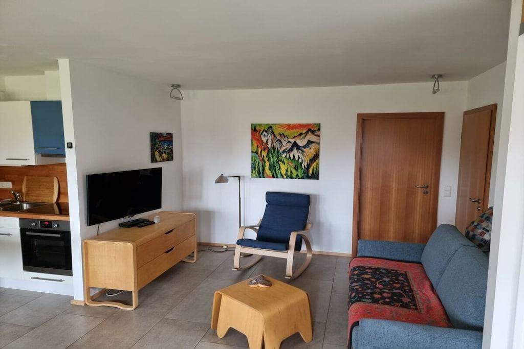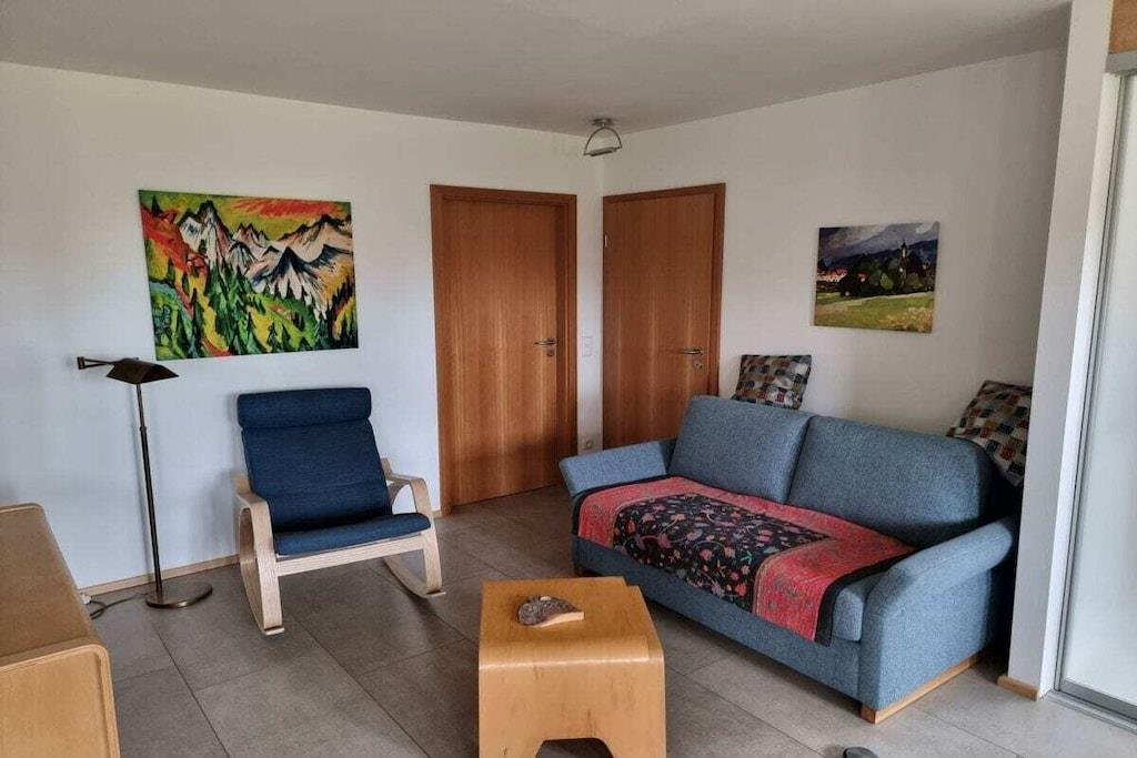 Moderne ferieleilighet (bygd i 2013), 40 kvadratmeter, stue med åpen planløsning, komfortabelt kjøkken (induksjonstopp, stekeovn, oppvaskmaskin, kjøleskap), separat soveplass med en 160 cm seng, bad med dusj. Reiseseng og barnestol tilgjengelig på forespørsel. Stor hage rett ved kanten av et naturreservat, privat terrasse. Badstuen ligger i hagehuset. Sofaen i stuen kan gjøres om til en seng med en 120 cm lamellbunn, noe som gir en tredje soveplass. Du finner oss også direkte på ferienwohnung-ammergauer-alpen.de