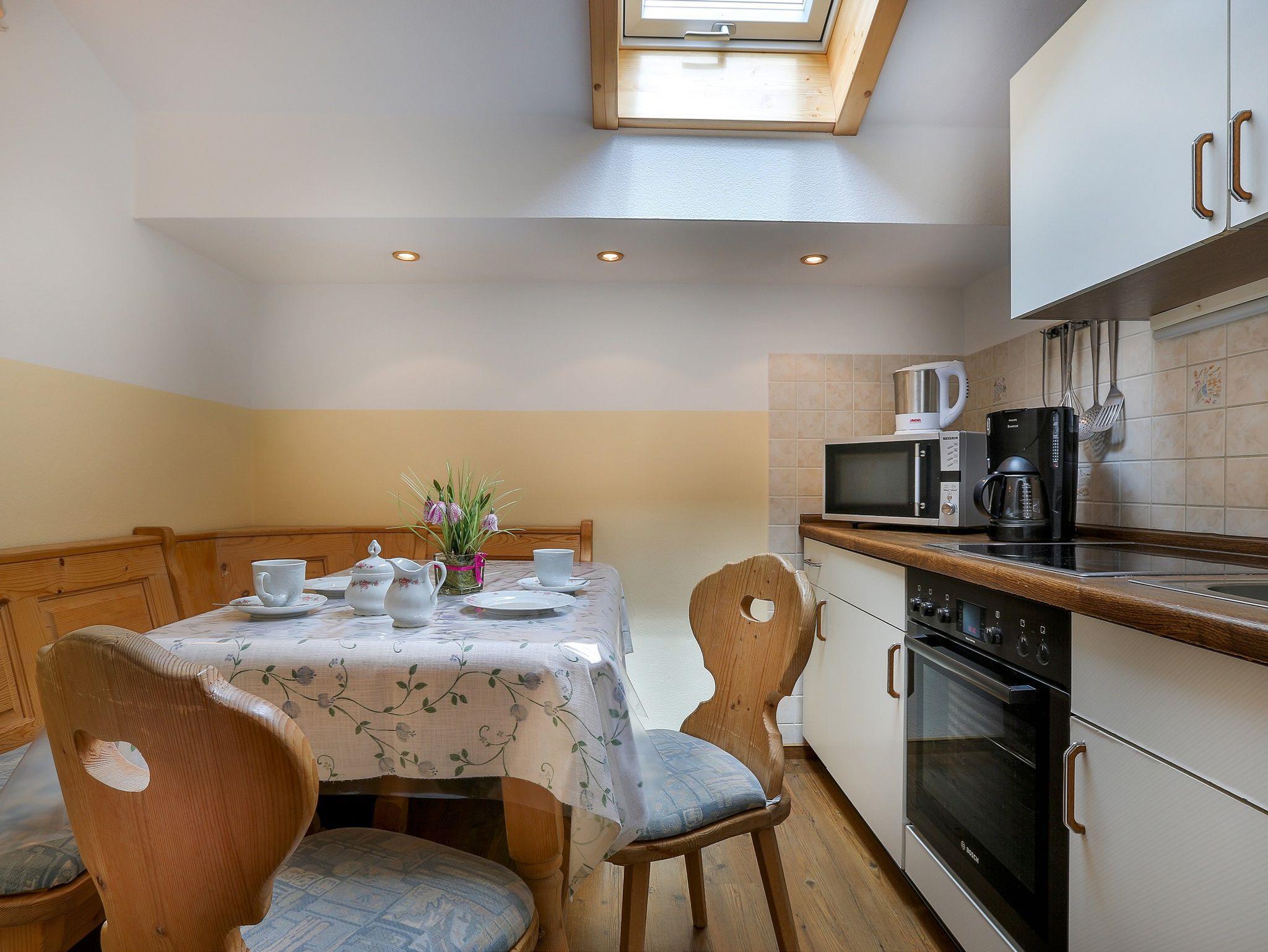 Appartment mit Altholz, 40qm, Doppelbett 1,80 x 2,00, eine Schlafcouch mit Lattenrost und Matratze ist in der Wohnküche vorhanden, Breite 1,60 Küche, Bad, Fön, Terasse mit Bergblick.