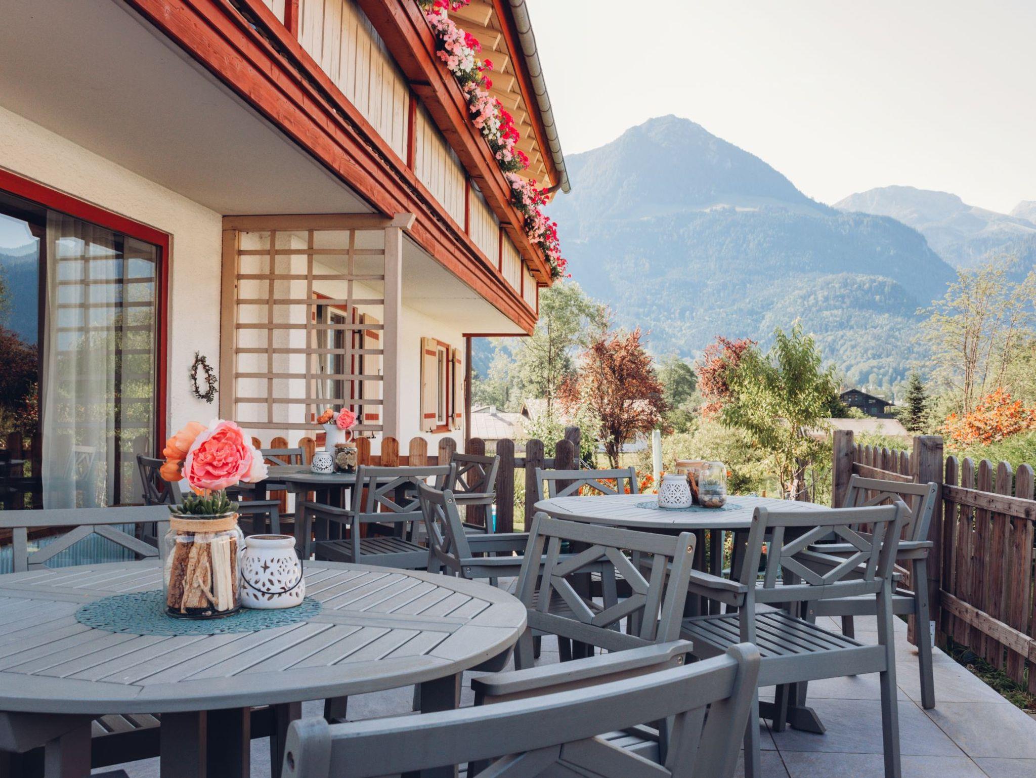 Auf der möblierten Gemeinschaftsterrasse genießen Sie einen wunderbaren Ausblick auf die Bergwelt.