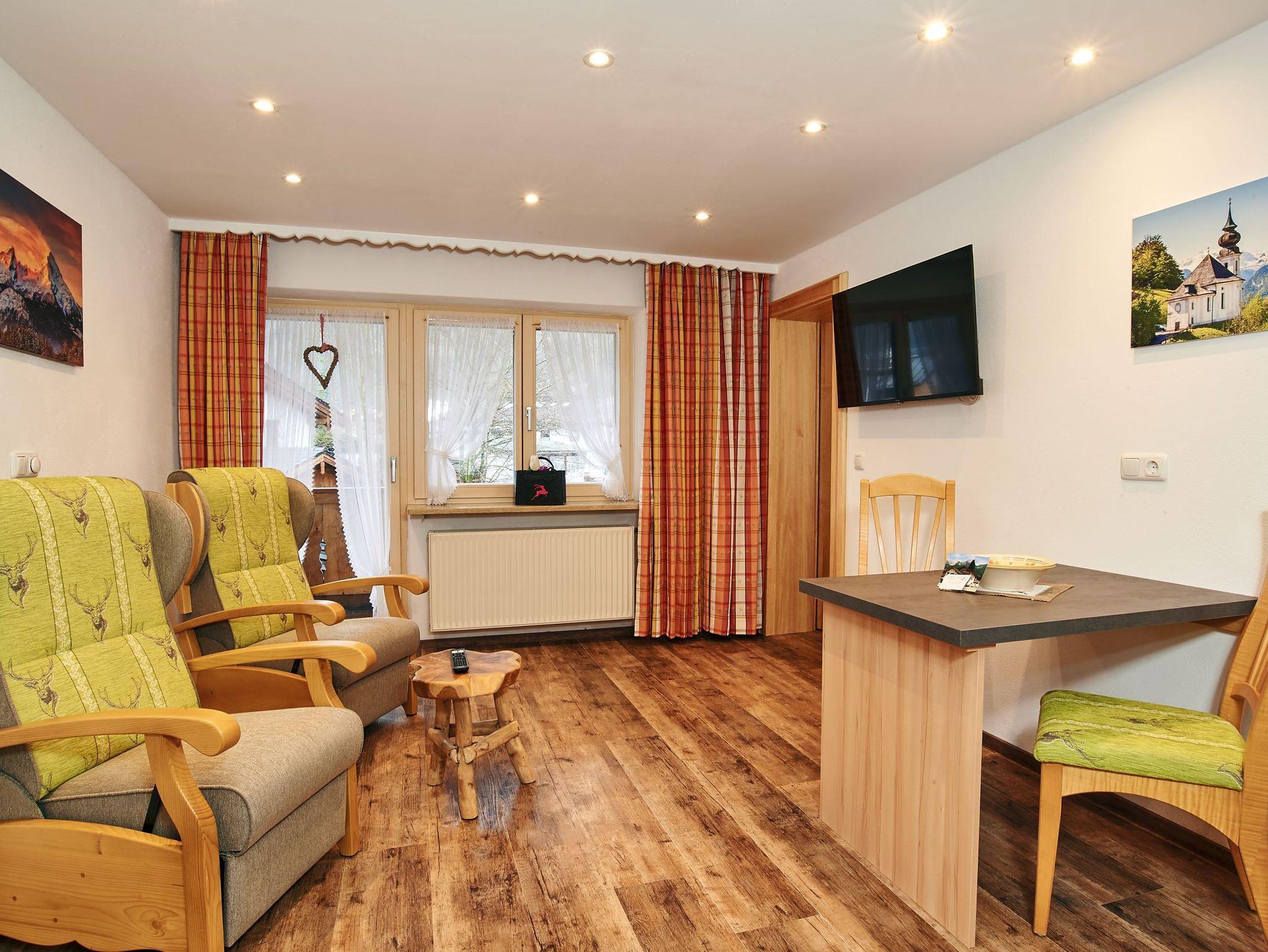 Die Ferienwohnung bietet Platz auf 35 qm und ist ausgestattet mit einem separaten Schlafzimmer, einem Wohnzimmer mit Esstisch, Kochzeile (Herd, Mikrowelle, Kühlschrank mit Tiefkühlfach), 2 Flachbildfernseher mit Kabel TV, WLAN, sowie einem Bad mit Dusche/WC. Der möblierte Balkon bietet Ihnen einen wunderbaren Bergblick. Bettwäsche und Handtücher sind vorhanden.