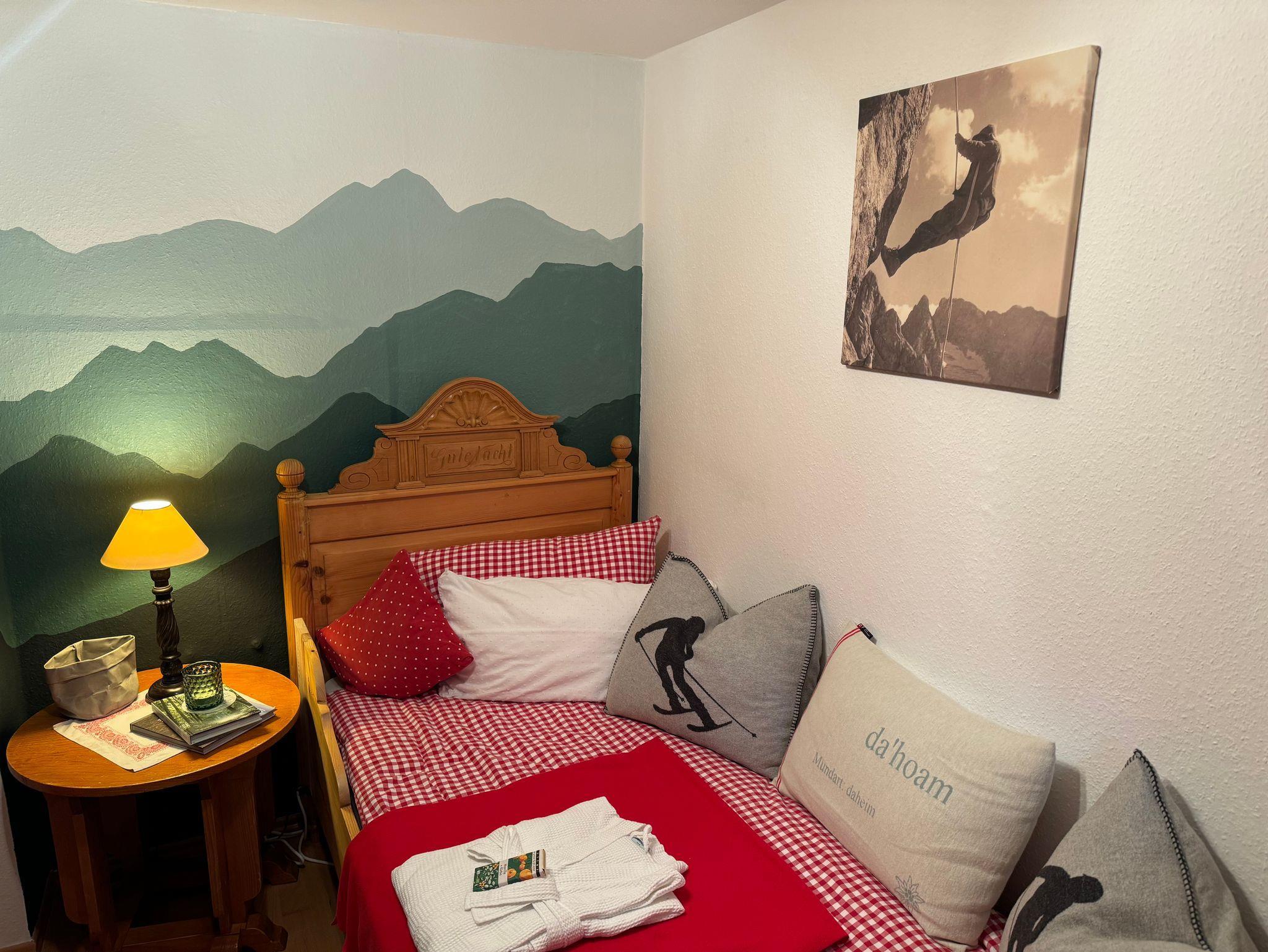 Unser spezieller Freiraum mit altem Holzbett, gemütlichen Kissen und Schaffell ist für Ihre Entspannung da. Nutzen Sie diesen kleinen Extraraum, wenn Sie ungestört schlafen möchten oder für Ihre kleinen Wellnessmomente nach den Bergtouren. Aromatherapie, Arnikaöl, Latschenkiefereinreibung, Akupressurmatte, vielseitige Lektüre: Wanderfüher, Zeitungen, Romane etc.