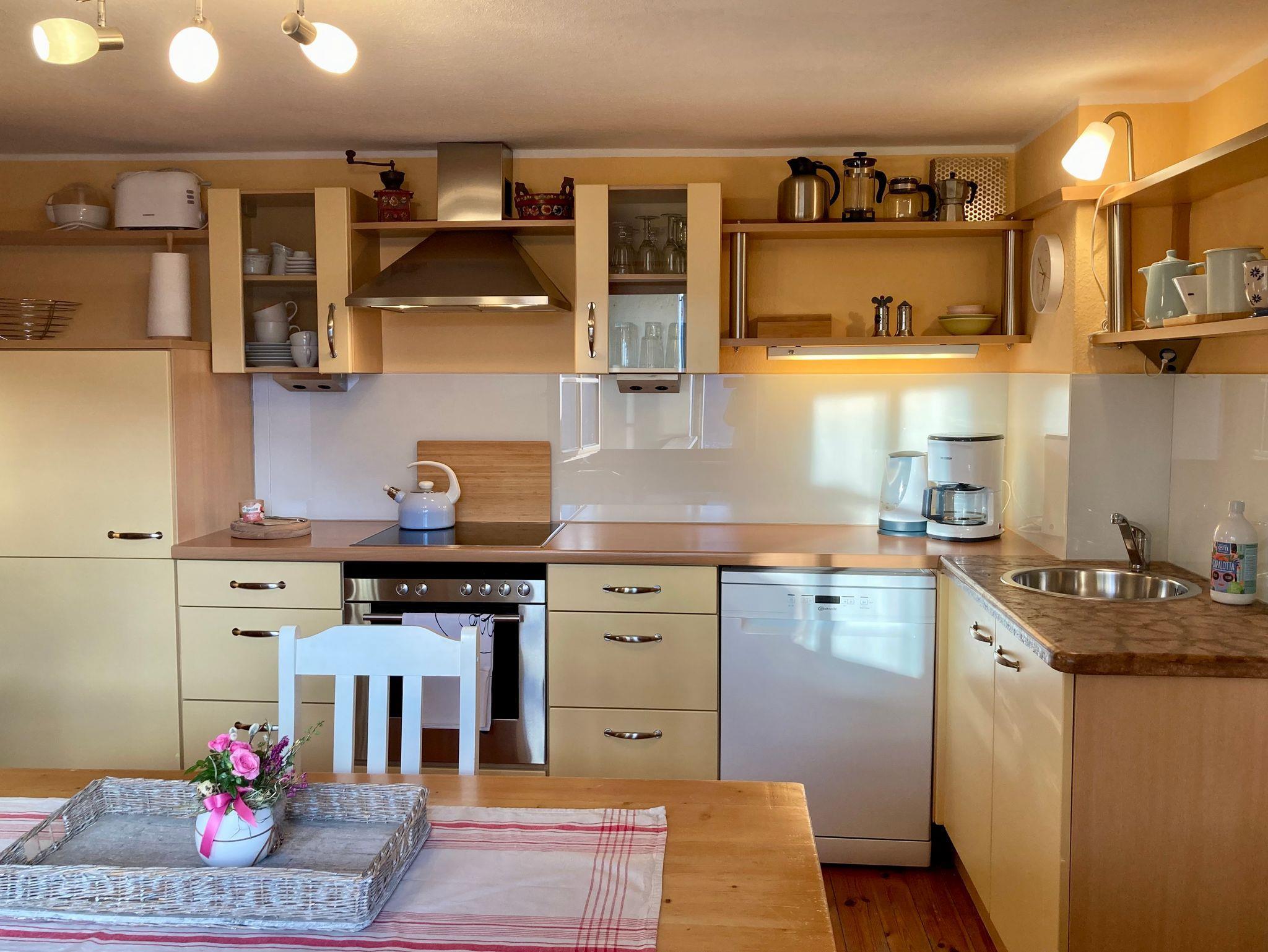 Küche – Vollausstattung. Esstisch mit Küchenbank, Küchenzeile, rundes Spülbecken mit Marmoreinfassung, Küchenutensilien, Kaffeemaschine, Espressomaschine, Teeauswahl, Wasserkocher, Taster, Eierkocher, Brotzeitbrett, Kühl– Gefrierkombination... es ist alles da!