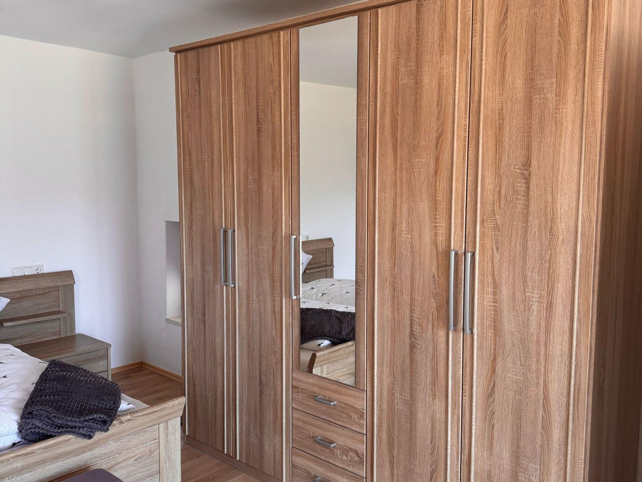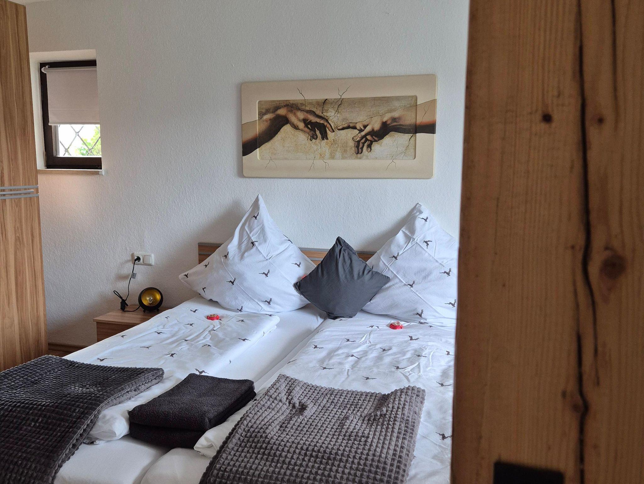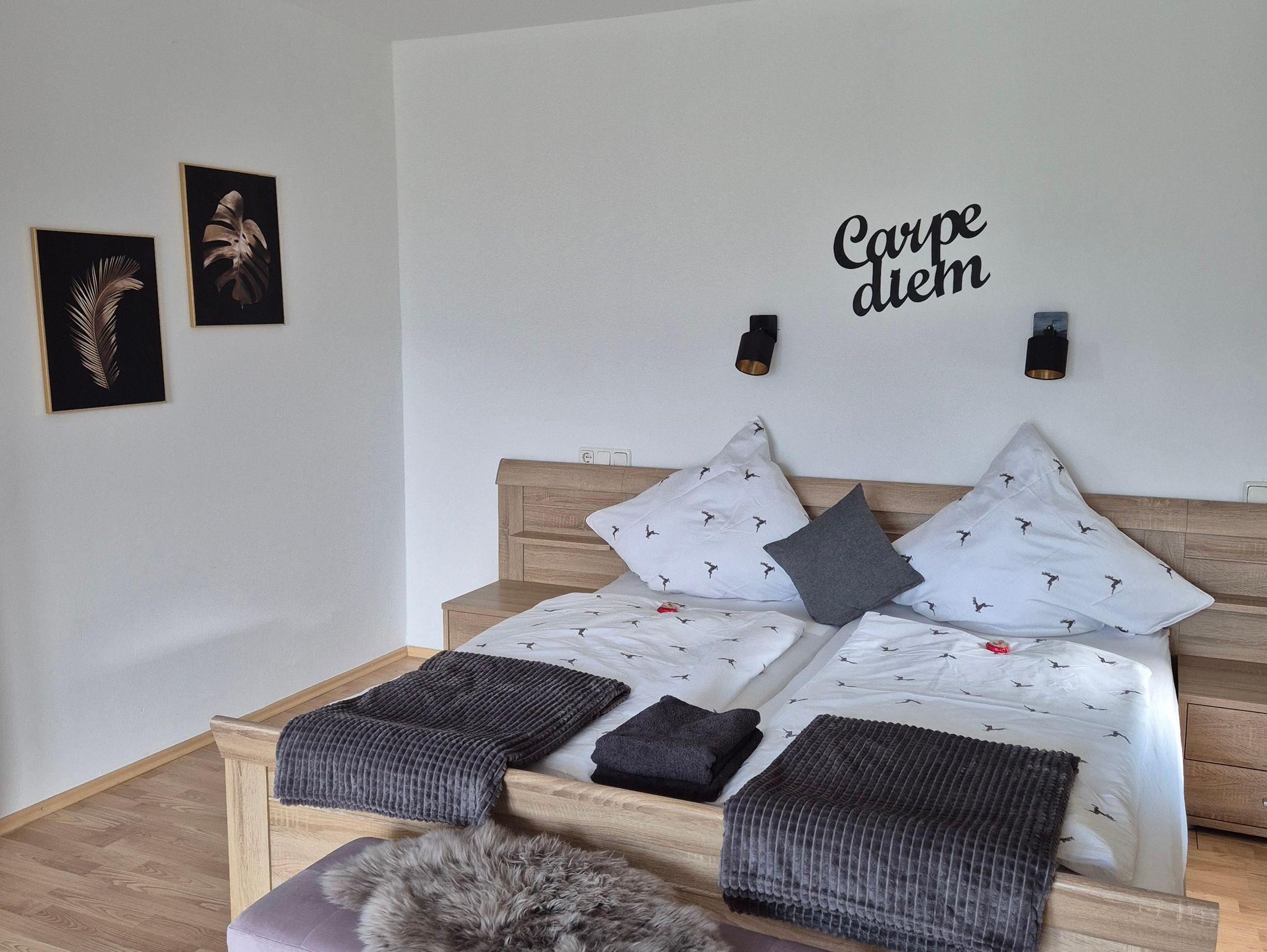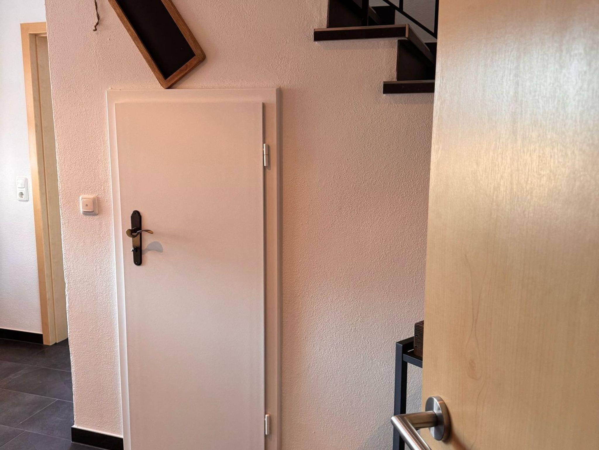 Sie umfasst zwei Schlafzimmer mit Doppelbett. In dem größeren Schlafzimmer könnte man bei Bedarf auch noch Beistellbetten unterbringen (nur auf Anfrage). Im EG befindet sich der Wohn-/Essbereich und die Küche, sowie ein Flur und das Badezimmer. Das Bad ist mit einer Dusche ausgestattet. Im OG sind die beiden Schlafzimmer. Die komplette Ferienwohnung wurde neu eingerichtet und renoviert.