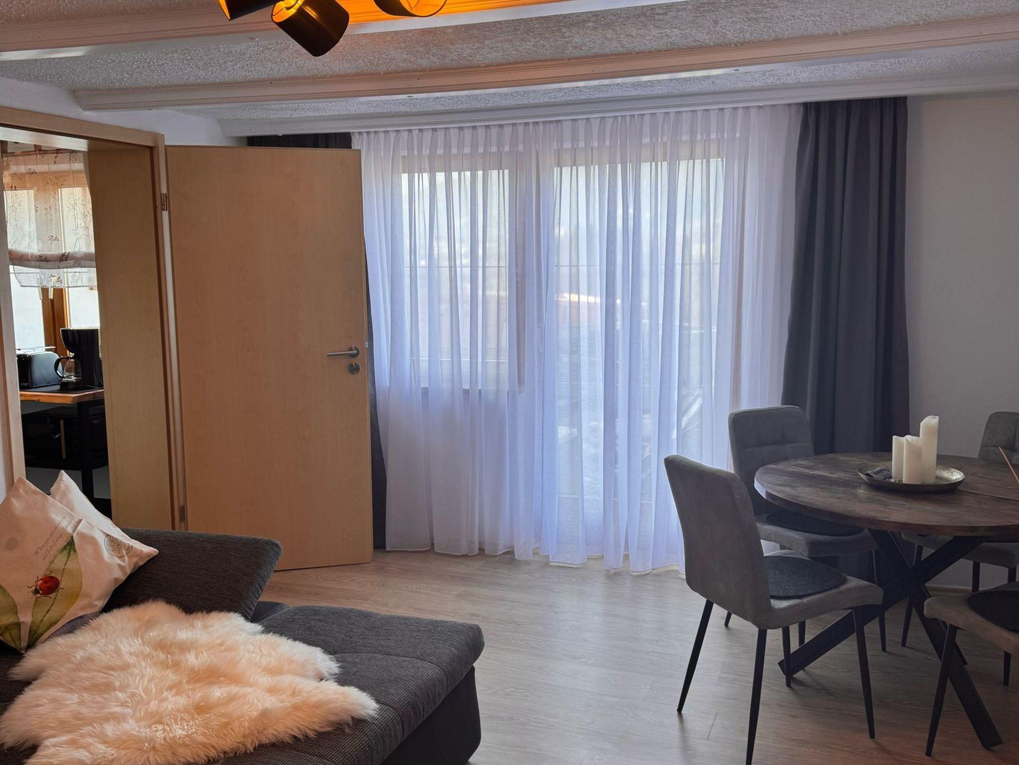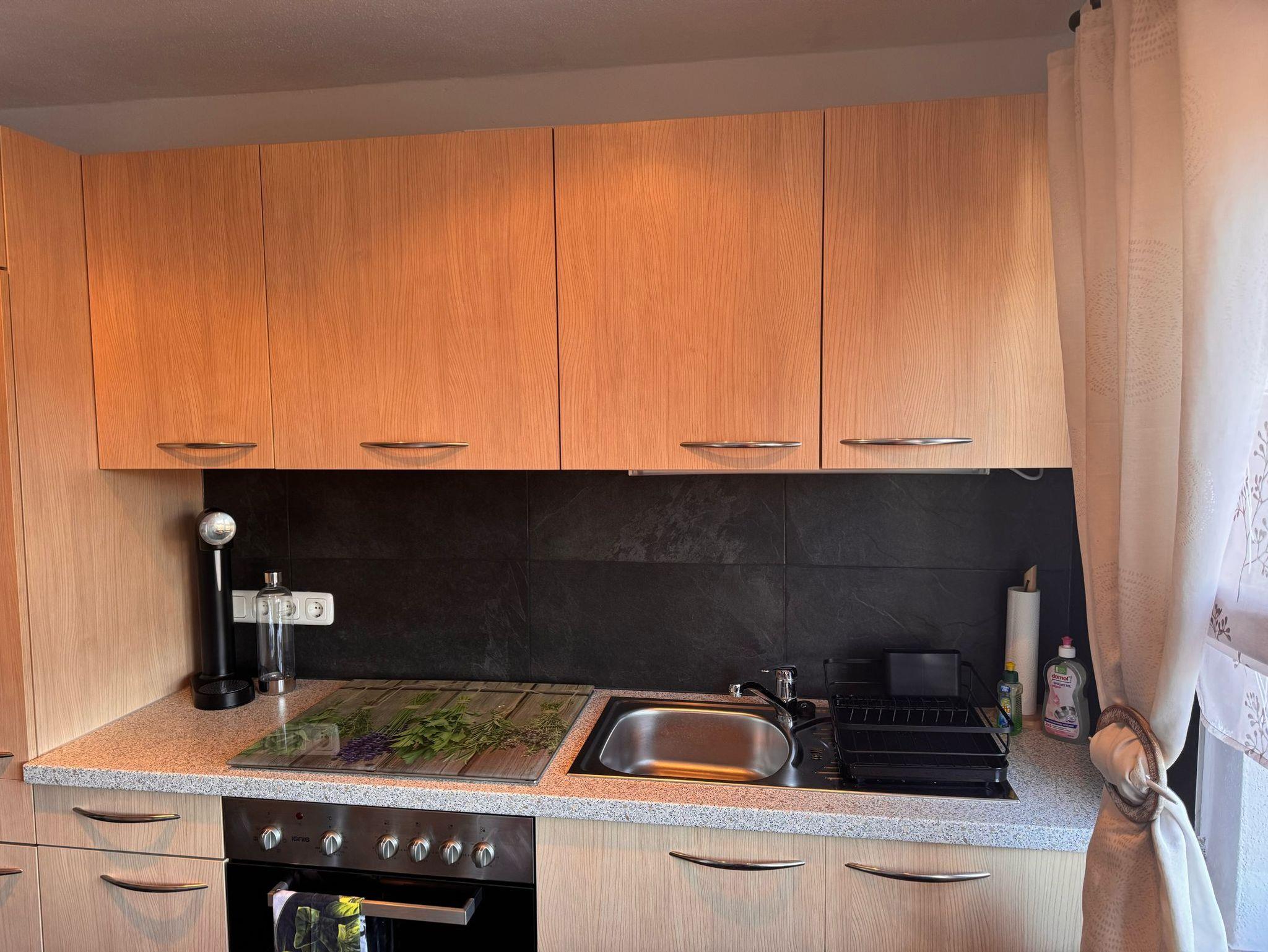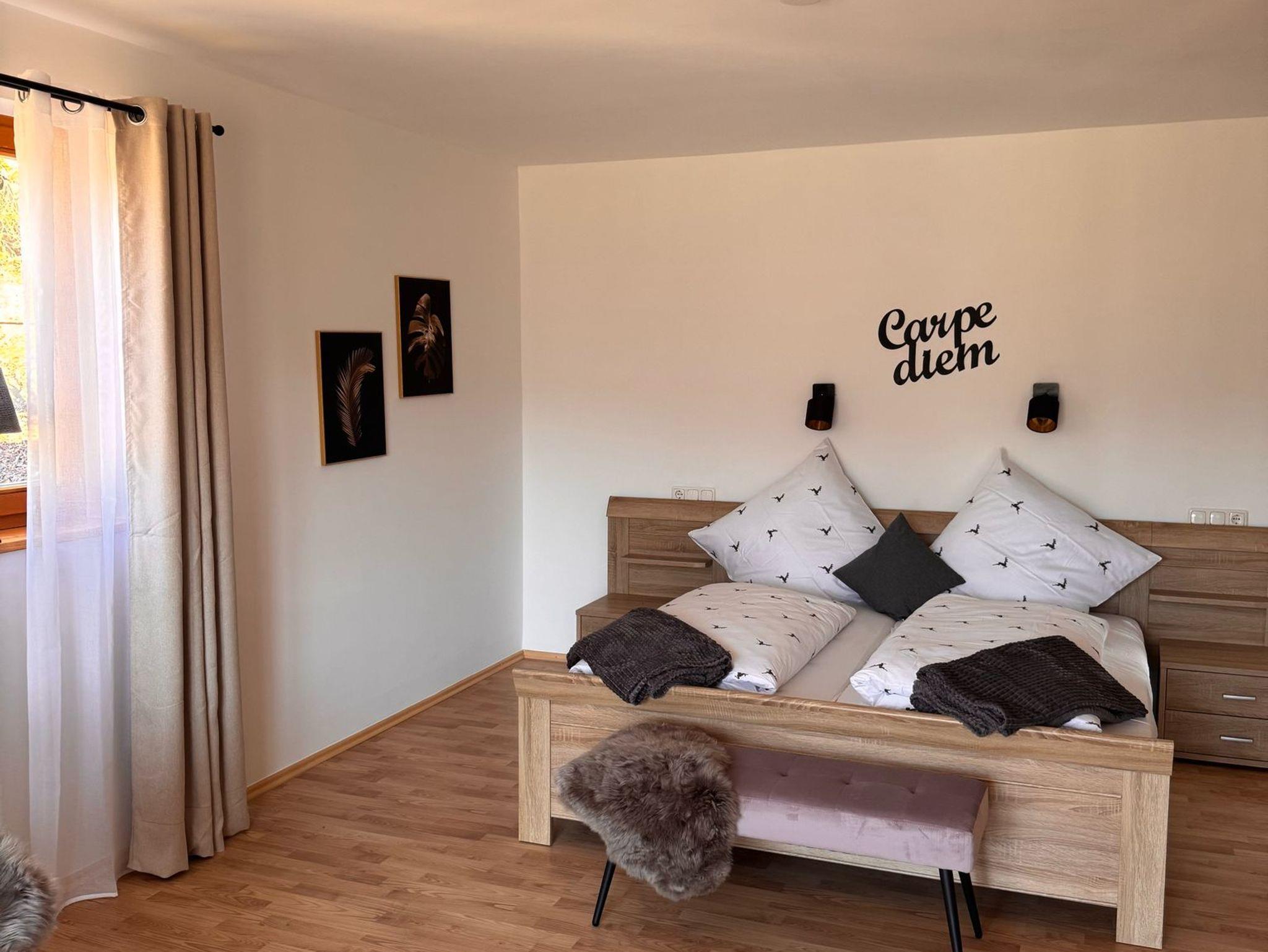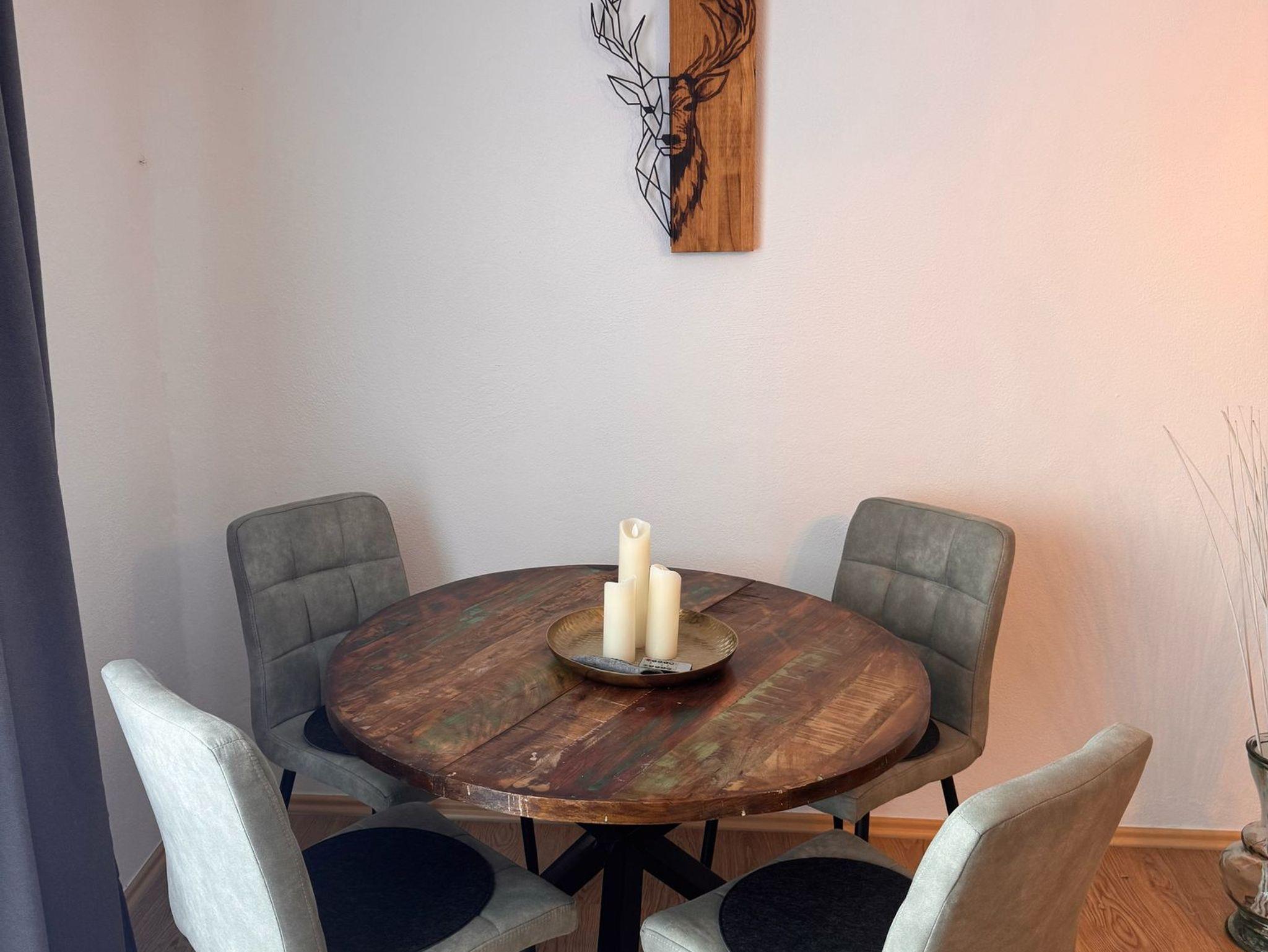 Sie umfasst zwei Schlafzimmer mit Doppelbett. In dem größeren Schlafzimmer könnte man bei Bedarf auch noch Beistellbetten unterbringen (nur auf Anfrage). Im EG befindet sich der Wohn-/Essbereich und die Küche, sowie ein Flur und das Badezimmer. Das Bad ist mit einer Dusche ausgestattet. Im OG sind die beiden Schlafzimmer. Die komplette Ferienwohnung wurde neu eingerichtet und renoviert.