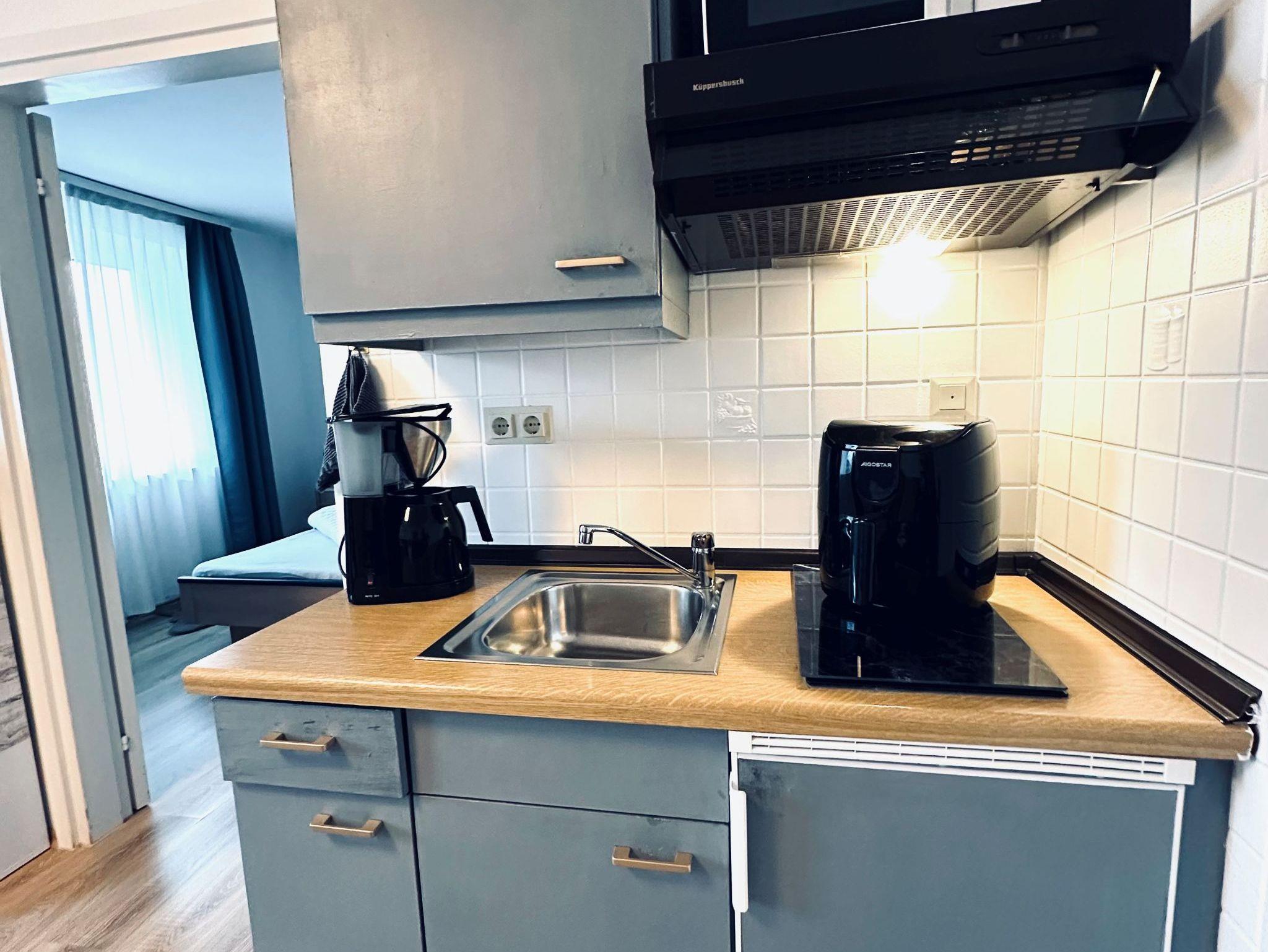 Die Ferienwohnung bietet Platz auf 50 qm und liegt im Erdgeschoß. Sie ist ausgestattet mit einem separaten Schlafzimmer, einem Wohn- Schlafraum mit Küchenzeile (2-Plattenherd, Kühlschrank, Tiefkühlfach, Kaffeemaschine, Wasserkocher, Airfryer uvm.), Essecke, Sitzgruppe, TV, WLAN und Zimmersafe. Im Bad mit Dusche/WC stehen Fön und Handtücher für Sie bereit. Die Gemeinschaftsterrasse ist möbliert und über das Kaminzimmer erreichbar.