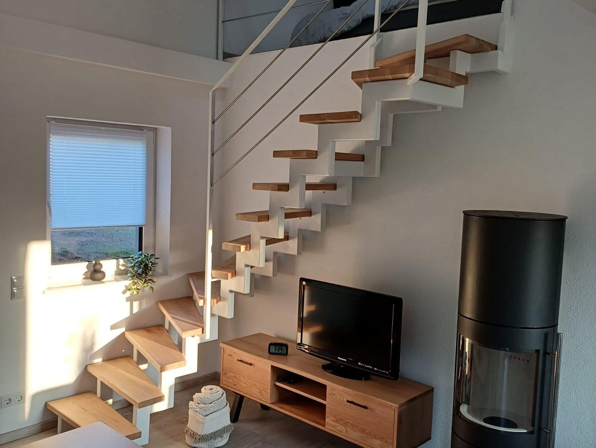 • Treppenaufgang zur Galerie mit Schlafbereich (ca. 14 m²), Doppelbett und Kommode