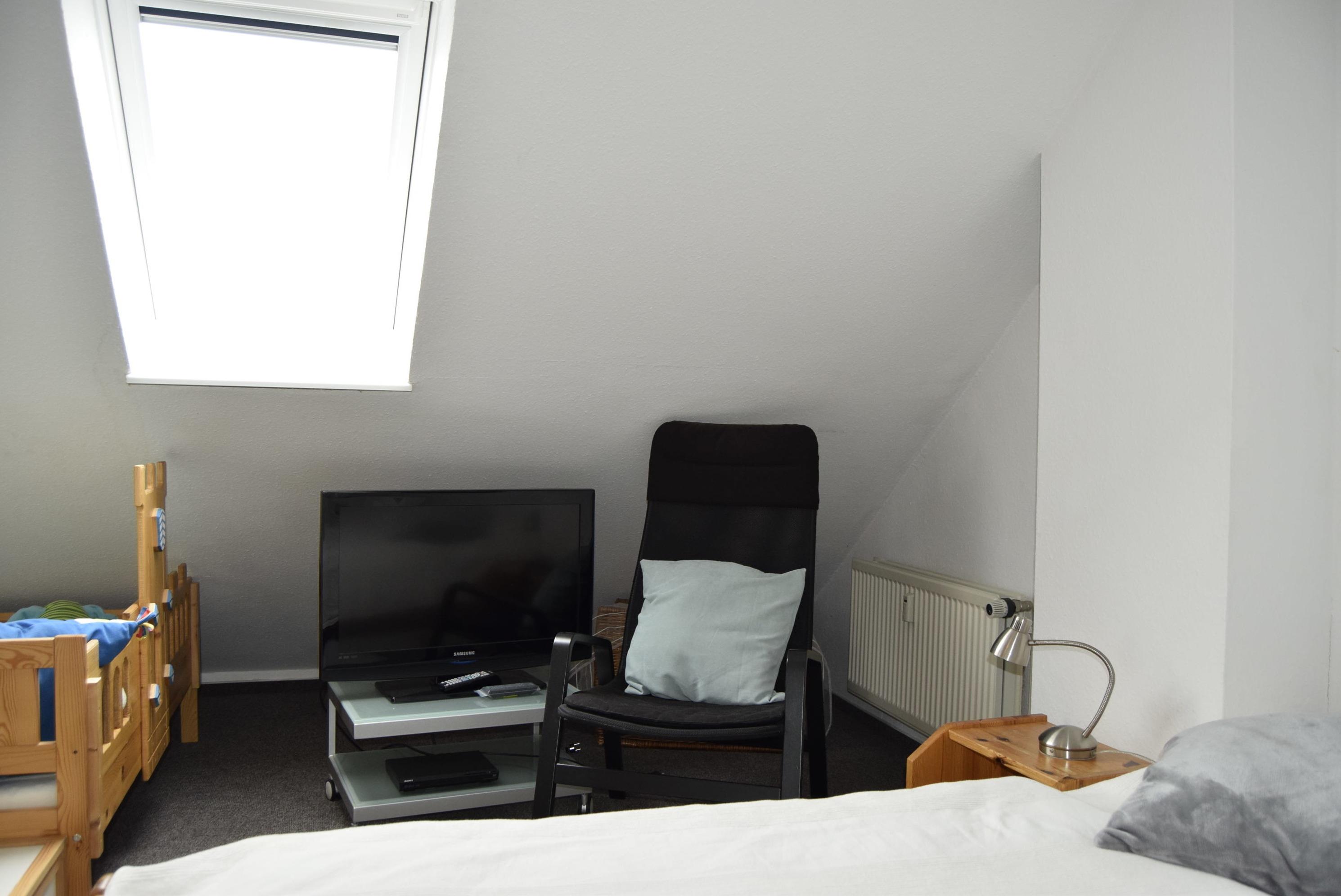 Über eine Raumspartreppe ("Sambatreppe") gelangen Sie in den oberen Bereich der Wohnung. Hier steht Ihnen ein komplettes Schlafzimmer mit einem Doppelbett zur Verfügung und im gleichen Raum die Kinder-Spiel- und Schlafecke mit Schlafmöglichkeiten für ein großes Kind (auf der Matratze) und ein Kind bis ca. 7 Jahre (im Kinderbett). Außerdem ist hier ein DVD-Player mit Bildschirm vorhanden.