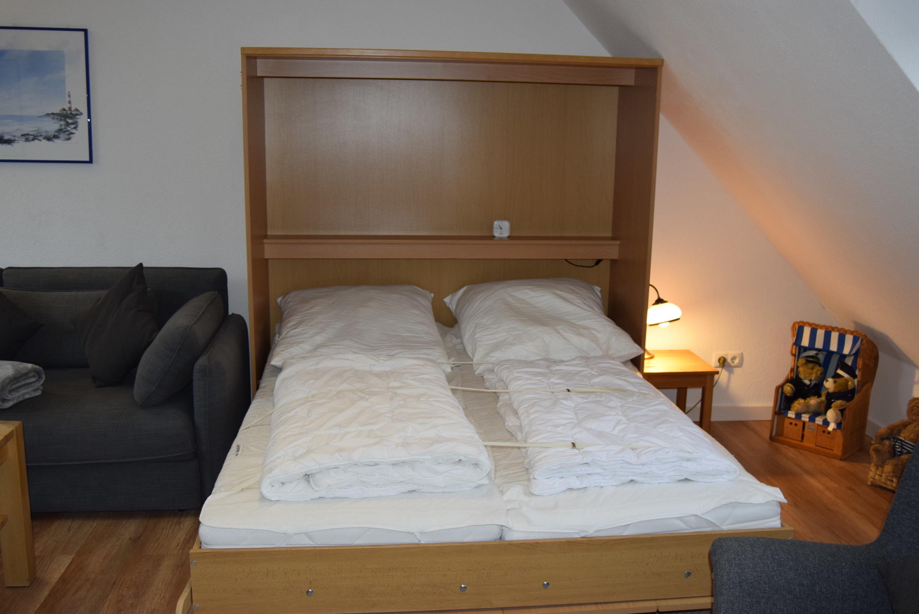 2.OG: Ein kombiniertes Wohn-Schlafzimmer mit Schrankbett im Dachgeschoss (über eine Wendeltreppe von der Küche aus erreichbar). Panoramafenster mit Seeblick und breiter Sitz-Fensterbank. Dieses Zimmer ist nicht abschließbar, somit offen zur Küche.