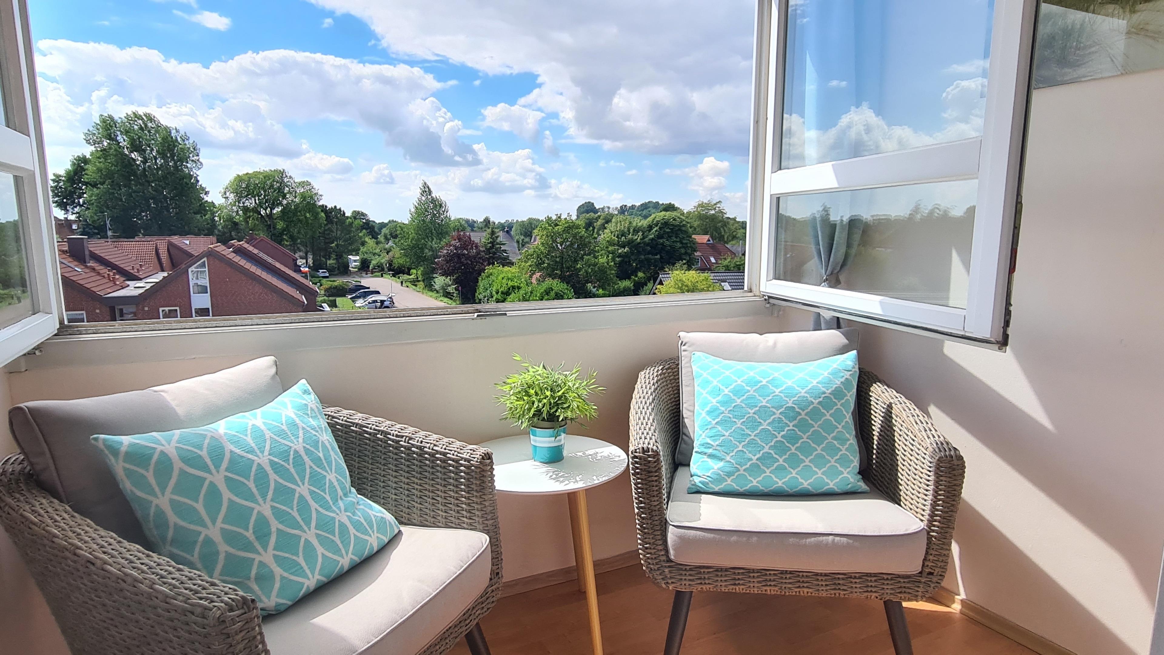 Das Appartement besitzt 2 voll verglaste Balkone (Ost- und Westseite): Morgens genießen Sie auf der Ostseite ihr Frühstück und blicken hierbei aus der 3 Etage auf die Ostsee und die Seebrücke von Schönberg, abends erholen Sie sich vielleicht bei einem Glas Sekt, mit Blick auf die untergehende Sonne, auf der nach Westen gerichteten Seite.