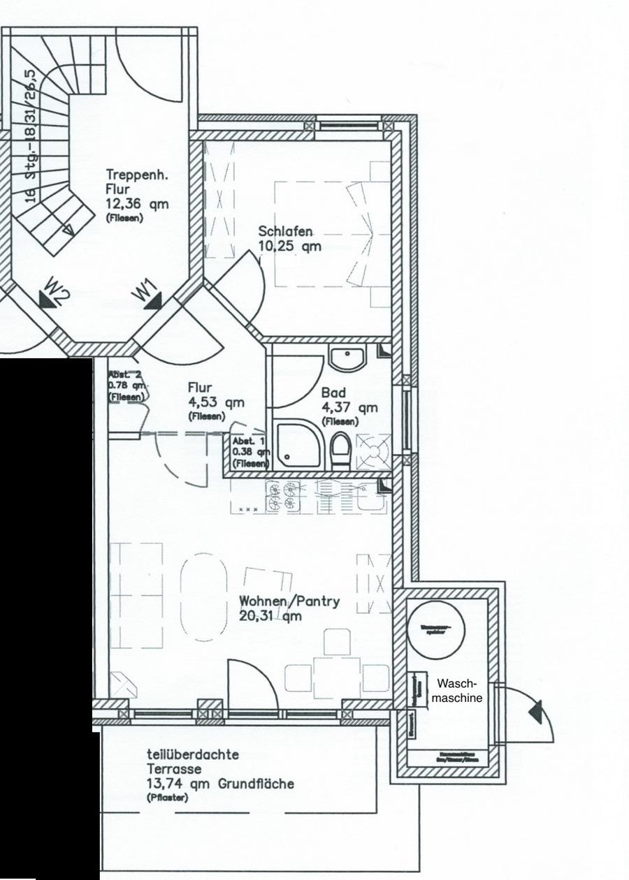 Außenausstattung: PKW-Stellplatz, große, möblierte Terrasse mit Strandkorb.