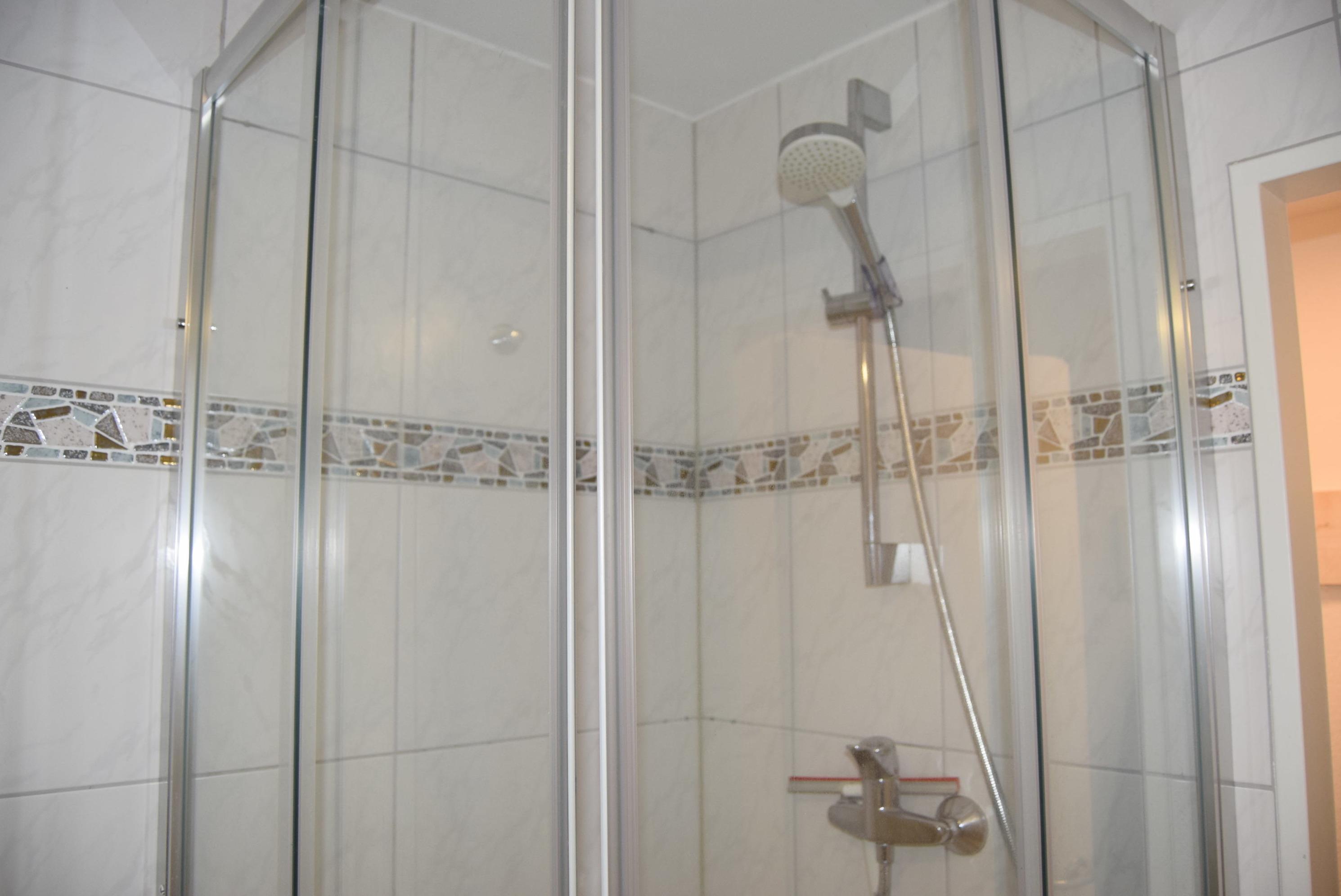 Das Badezimmer ist mit einer Dusche sowie WC ausgestattet. Die Waschmaschine, sowie Bügeleisen und Brett sind im Küchenbereich mit untergebracht.