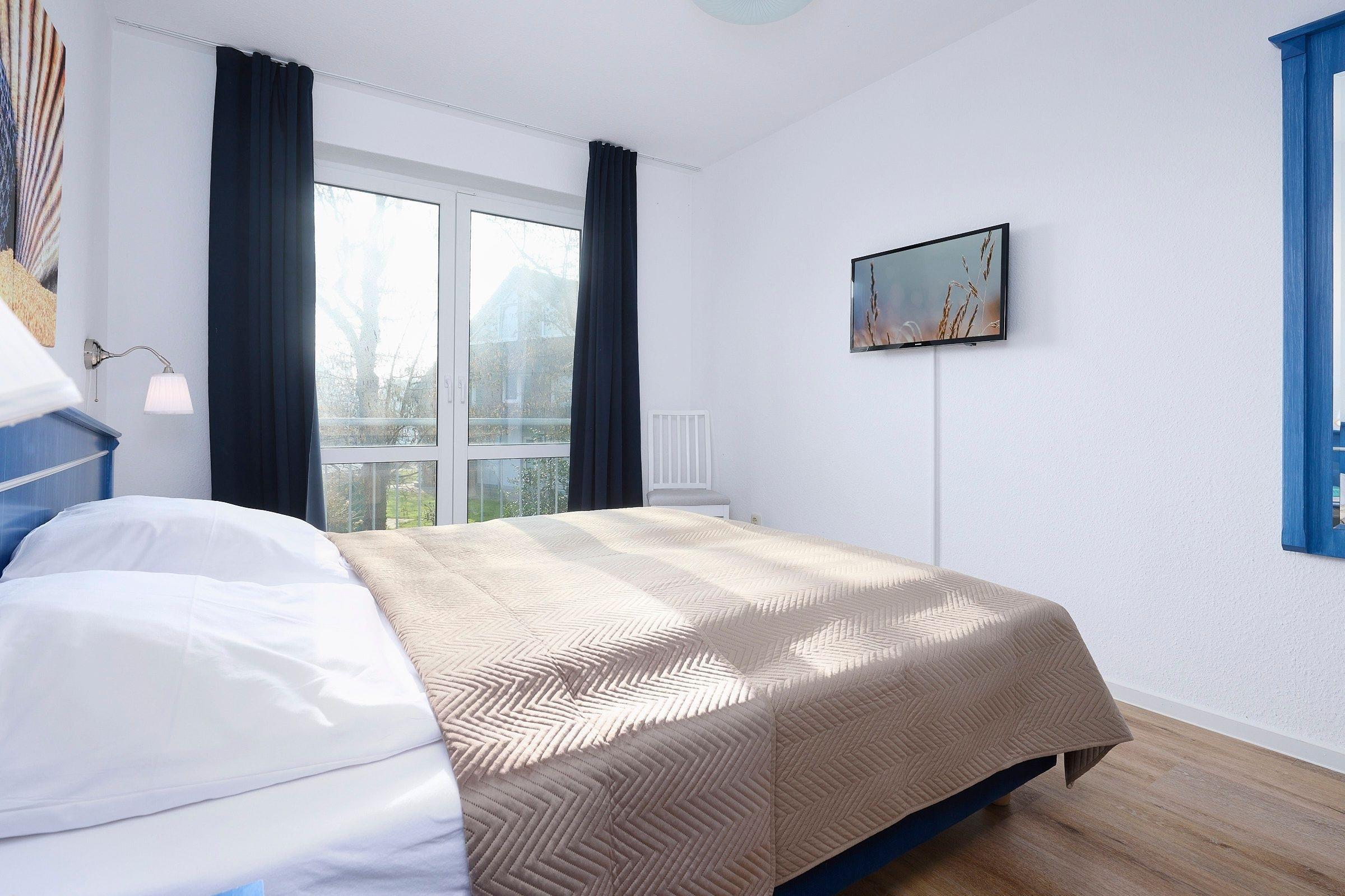 Schlafzimmer: 1 Doppelbett (2x 90x200 cm), Kleiderschrank, TV, Verdunkelungsmöglichkeit