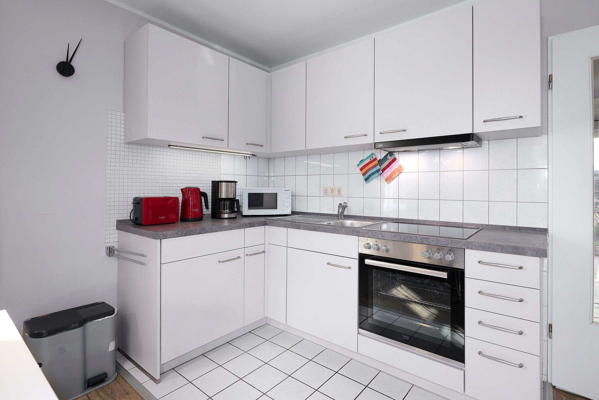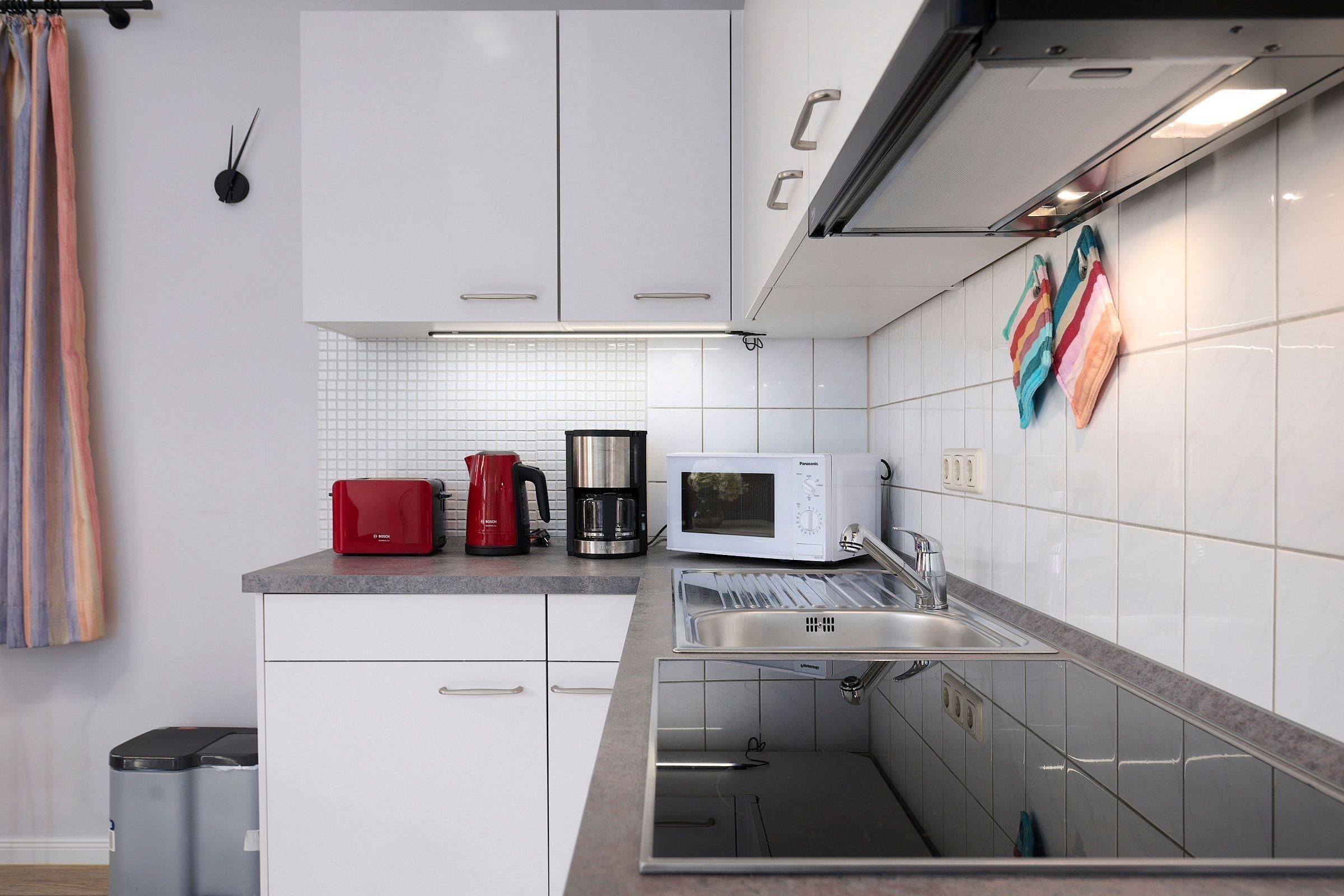 Verbringen Sie gemütliche Stunden im Wohnzimmer und bereiten Sie leckere Mahlzeiten in der offenen Küche zu, die mit allem Komfort ausgestattet ist. Vom Wohnbereich aus haben Sie einen direkten Zugang auf die sonnige Terrasse.