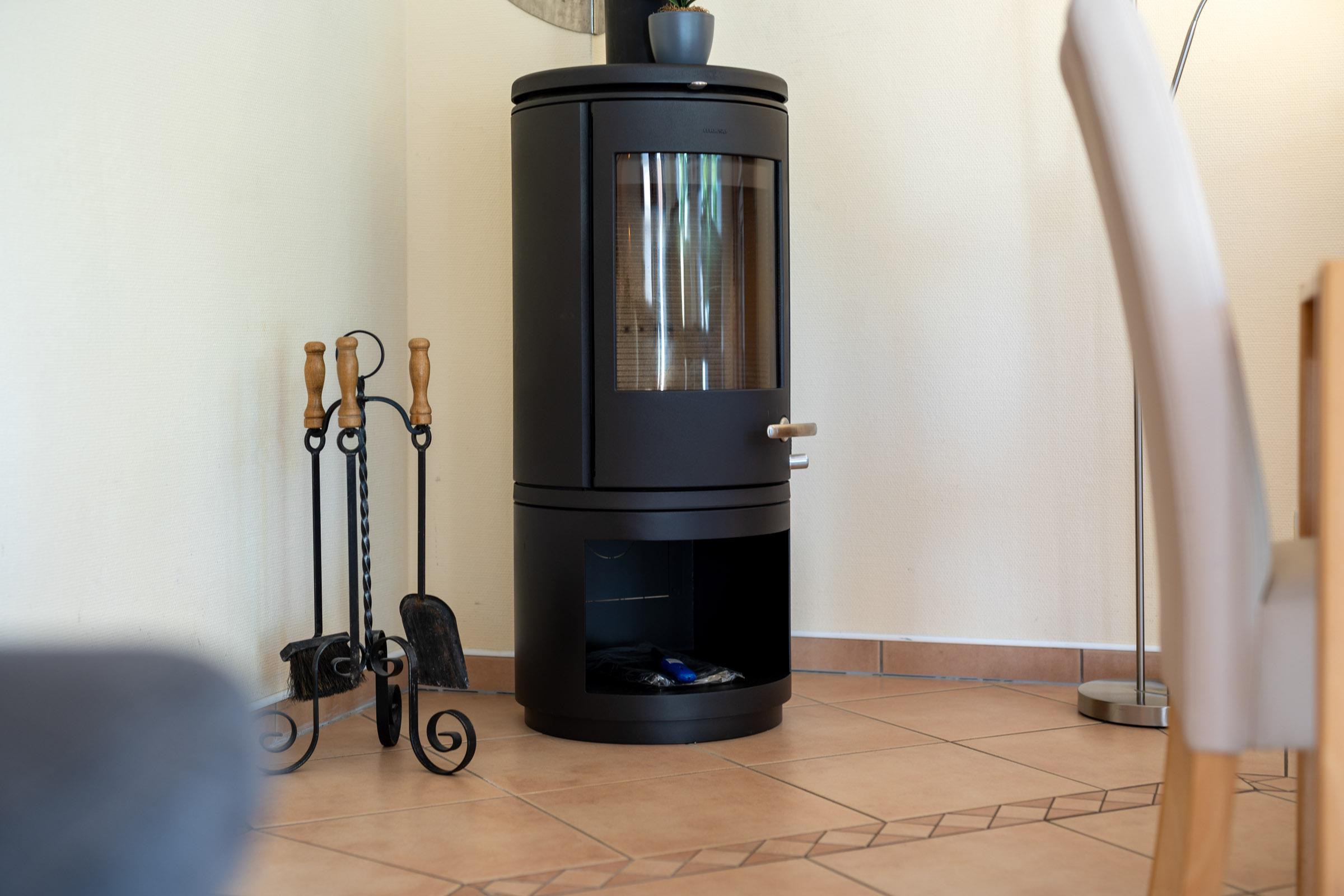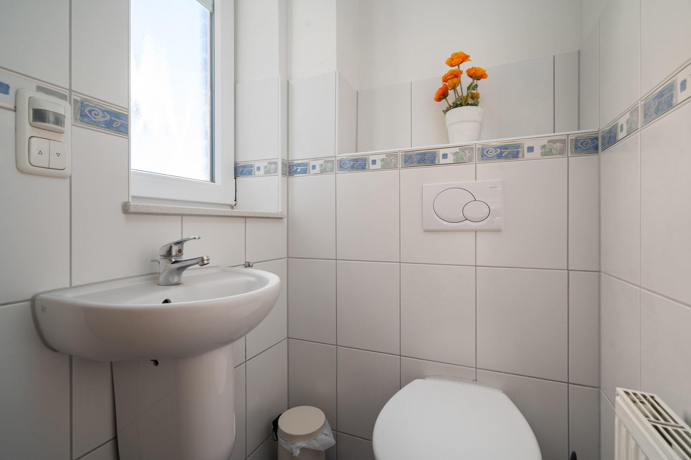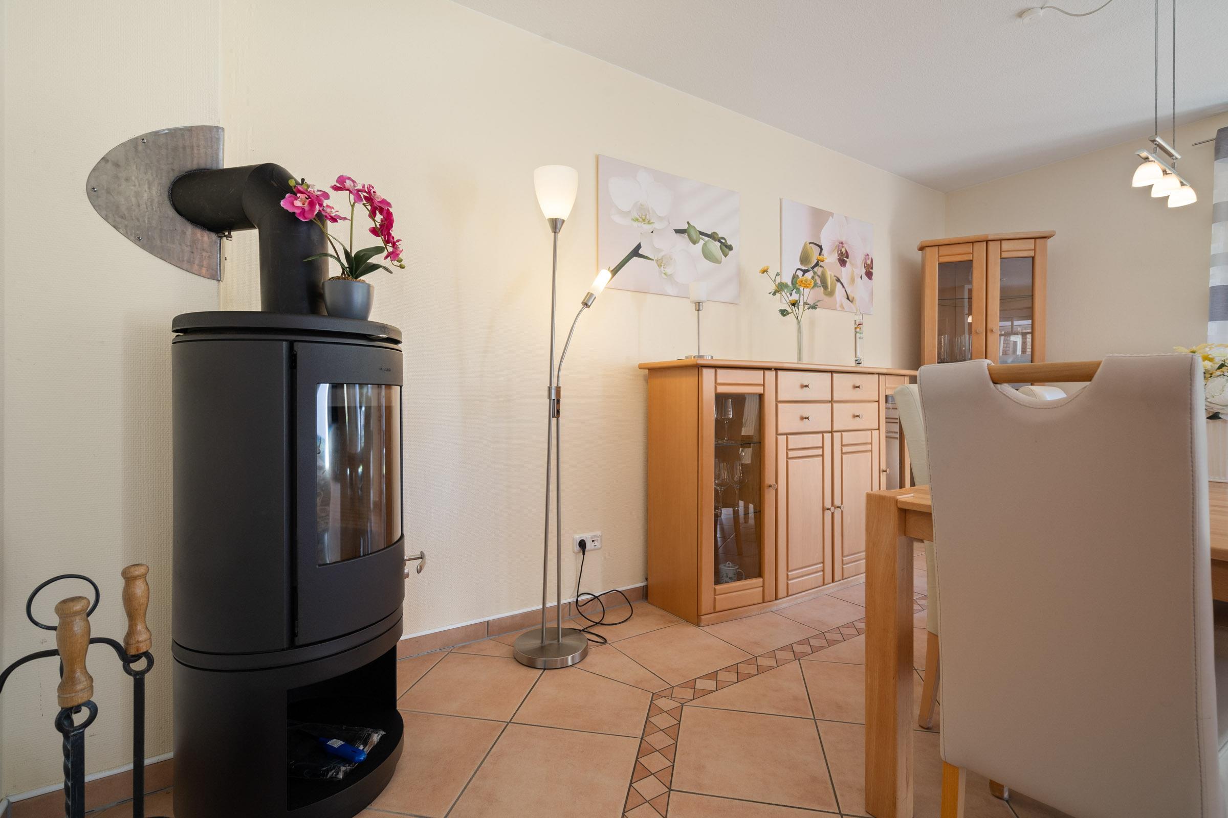 Im Erdgeschoss sind Wohn-/Essbereich mit großem Ecksofa und Zugang auf die Terrasse, Gäste-WC, die Küche und der Hauswirtschaftsraum untergebracht. Machen Sie es sich auf der Couch am Kaminofen gemütlich oder genießen Sie die Sonnenstunden bei schönem Wetter auf der möblierten Terrasse.