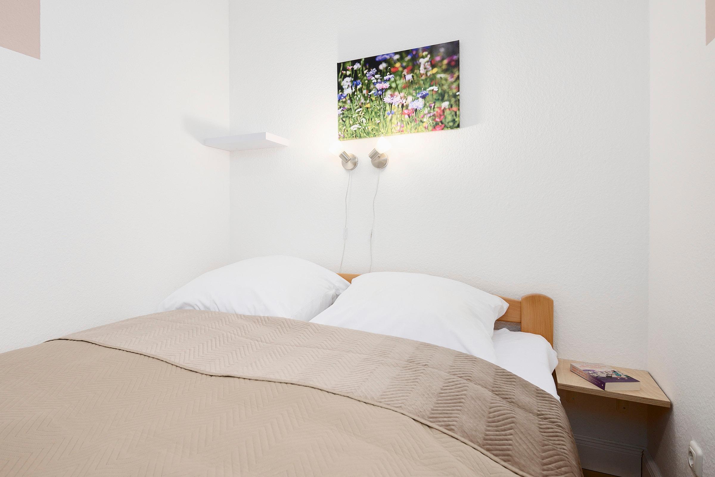 Schlafzimmer 1: kleines Doppelbett (160x200 cm), Kleiderschrank, Verdunkelung: Rollo