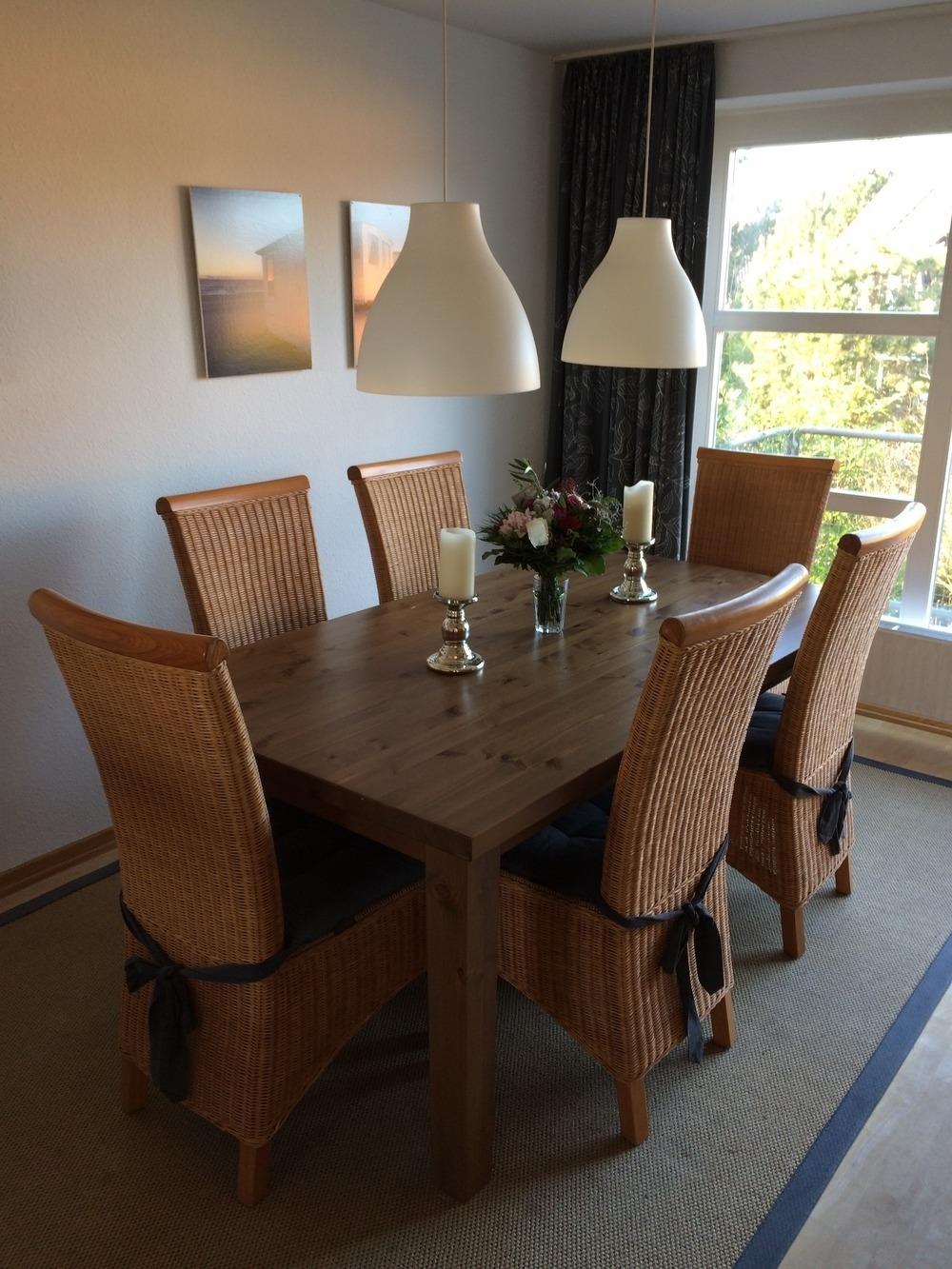 In der ersten Etage liegt das Schlafzimmer mit 2 Einzelbetten (90 x 200 cm), das Bad mit Dusche/WC sowie das Esszimmer mit offener Küchenzeile und dem großen Esstisch. Von hier aus gelangt man auch auf den Balkon.