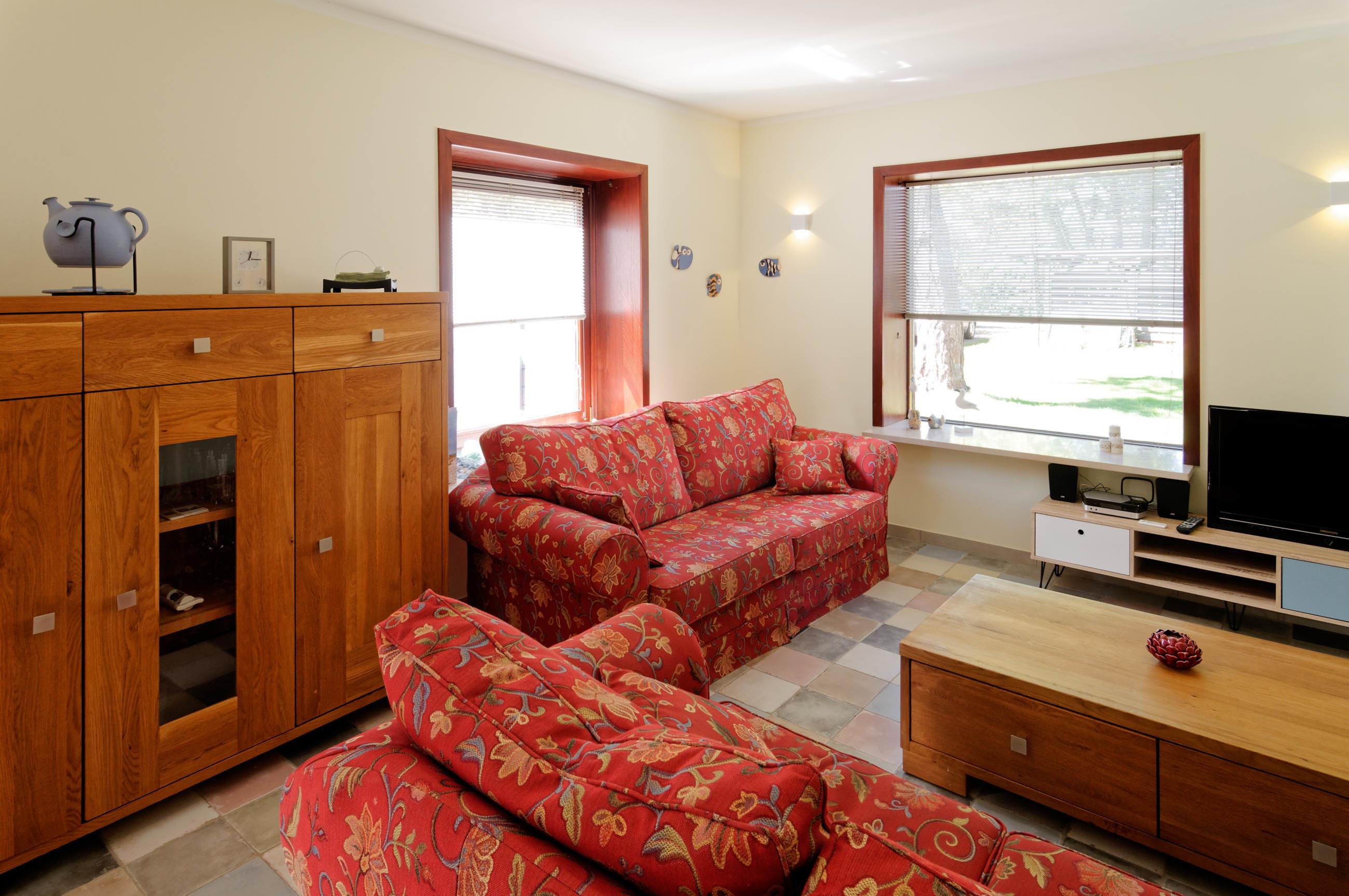 Es verfügt über 2 Bäder (einmal mit Wanne, einmal mit Dusche, jedes mit Fön) mit 2 WCs; Komforteinbauküche; 3 Schlafräume: einer mit einem Doppelbett und Farb-TV, DVD-Player und Leseecke; einer mit 2 Einzelbetten und ein Kinderzimmer mit Etagenbett; einem Wohnzimmer mit Farb-TV, DVD-Player, Stereoanlage und Kaminofen; ein sonniges Esszimmer; einen Wintergarten und großer Südterrasse. Kleines, gemütliches Ruhe- und Lesezimmer mit Schlafsofa. Eine Blockhaussauna findet sich im Garten und für den Weg zum Haus können Bademäntel gemietet werden.