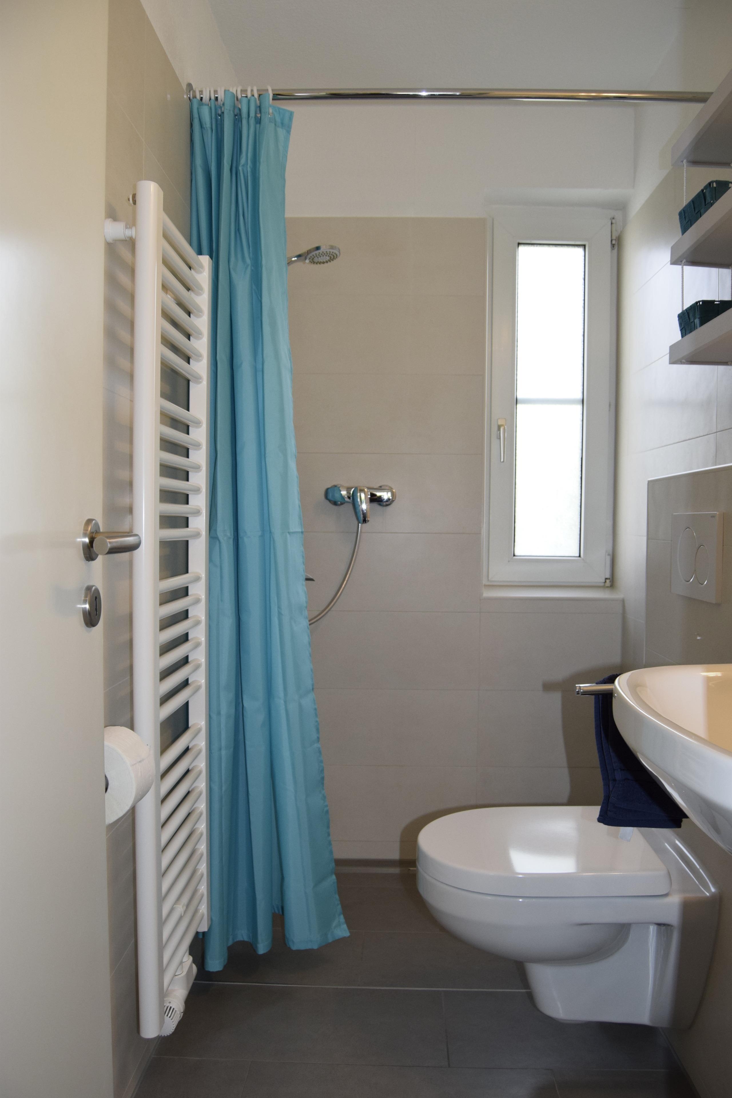 Das Badezimmer ist 2,8 m² groß und mit einer ebenerdigen Dusche sowie einem WC ausgestattet. Es gibt einen Handtuchwärmer sowie genügend Ablagefläche .