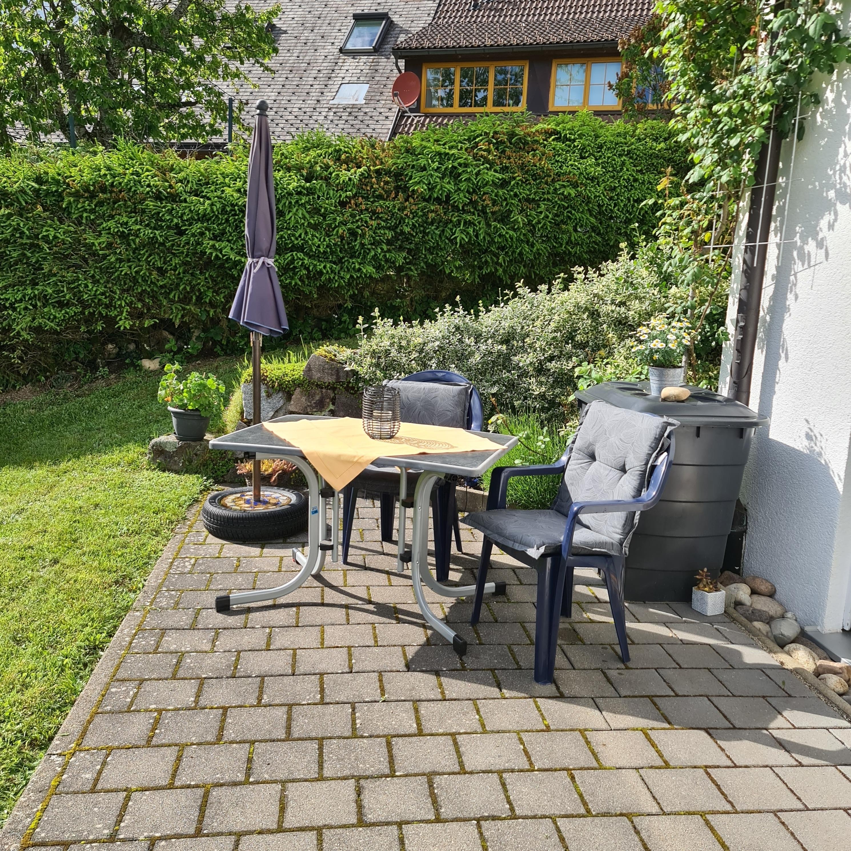Vor der Wohnung lädt auf der Sonnenterrasse eine Sitzgruppe mit wunderschöner Aussicht zum draußen verweilen ein.