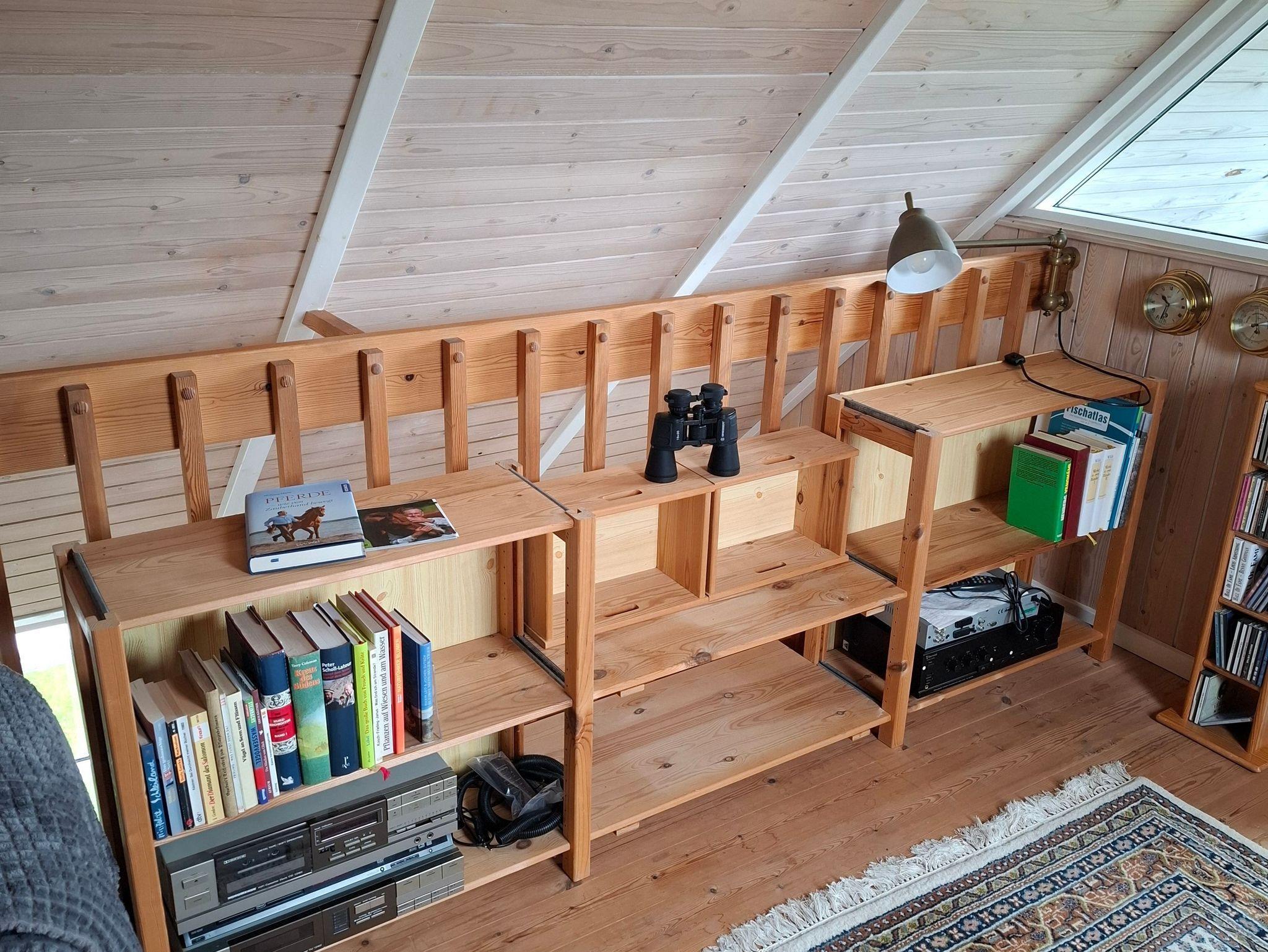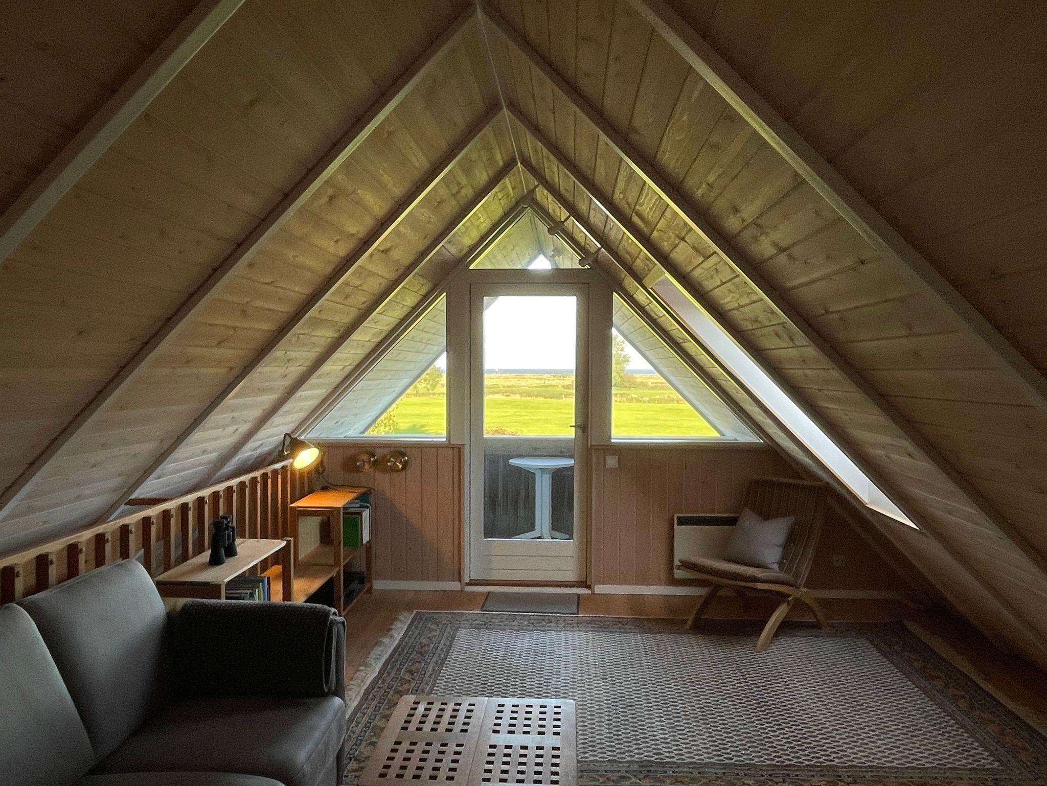 Vom Wohnbereich führt eine offene Treppe ins Obergeschoß. Dort erwartet sie ein zweites Schlafzimmer mit zwei getrennt stehenden Betten sowie zwei Kommoden und ein weiteres Wohnzimmer, von dem Sie auf den kleinen, möblierten Balkon gelangen. Dort genießen Sie die Ruhe und einen fantastischen Blick über die Felder zur Ostsee. In dem 2. Wohnbereich gibt es ebenfalls ein TV-Gerät.