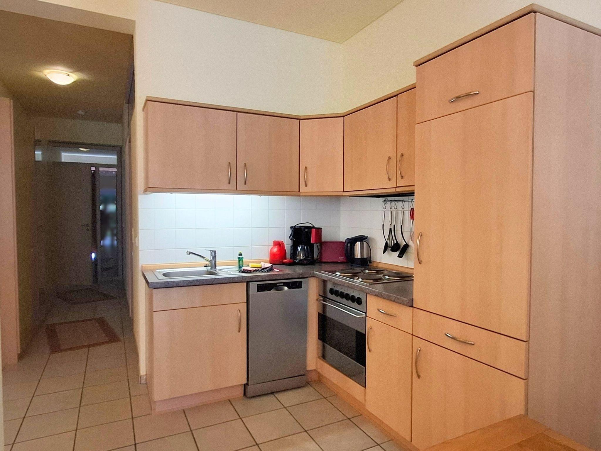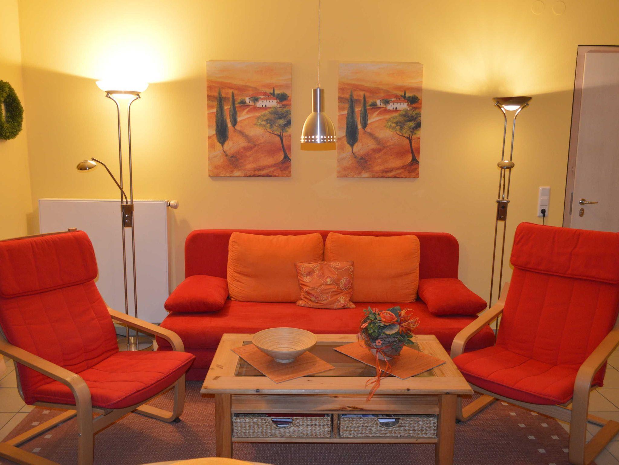 Die 2-Zimmer-Ferienwohnung mit ca. 63 m² Wohnfläche ist aufgeteilt in: Wohnzimmer mit Schlafcouch (1,40 breit) und Essecke; Schlafzimmer mit Doppelbett und Kinderreisebett; Küchenzeile mit Backofen, Geschirrspüler und Mikrowelle; Wanne/Dusche/WC; möblierte Terrasse; kostenfreies WLAN; PKW-Stellplatz; abschließbarer Fahrradraum. Nichtraucher!