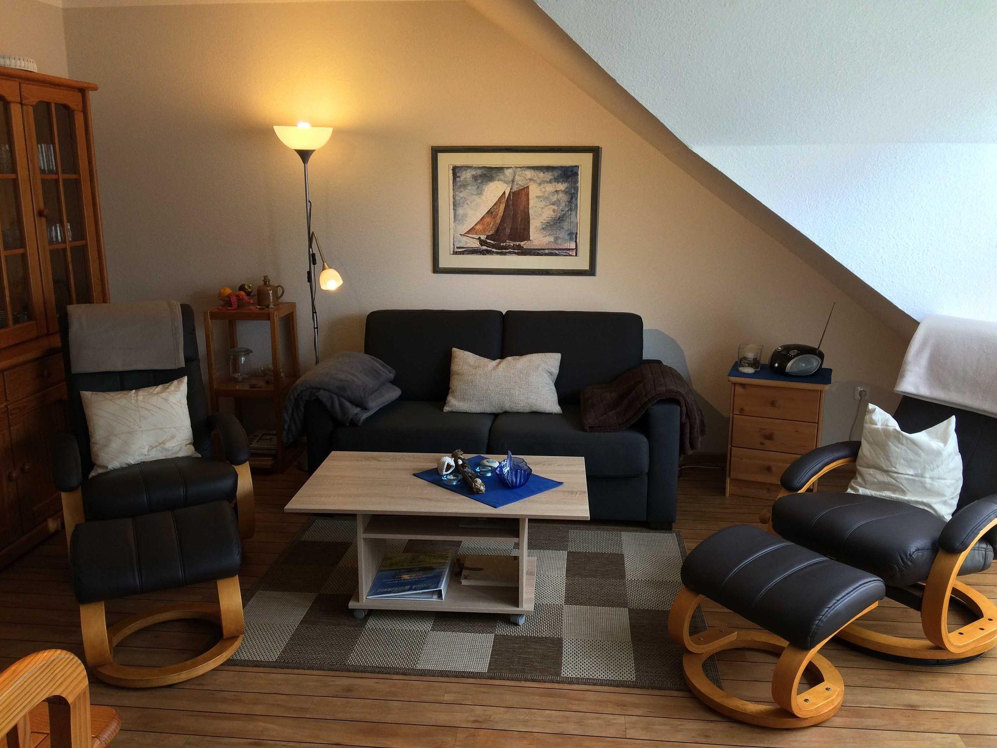 Die gemütliche Maisonette-Ferienwohnung Heuer hat eine Wohnfläche von ca. 60 m² und ist für 2-3 Personen geeignet. Sie befindet sich innerhalb einer kleinen Ferienanlage im Reihenhauscharakter in unmittelbarer Nähe der Reha-Klinik und ist ca. 950 m vom Strand entfernt. In der 1. Etage befindet sich das Wohnzimmer mit Essecke und der kleinen, modernen Einbauküche, das Bad mit Wanne/WC und der möblierte Balkon. Über eine Treppe gelangen Sie in das Dachgeschoß, wo sich das gemütliche Schlafzimmer mit einem Doppelbett und einem Einzelbett befindet. WLAN sowie ein reservierter PKW-Stellplatz vor dem Haus stehen den Gästen zur Verfügung.