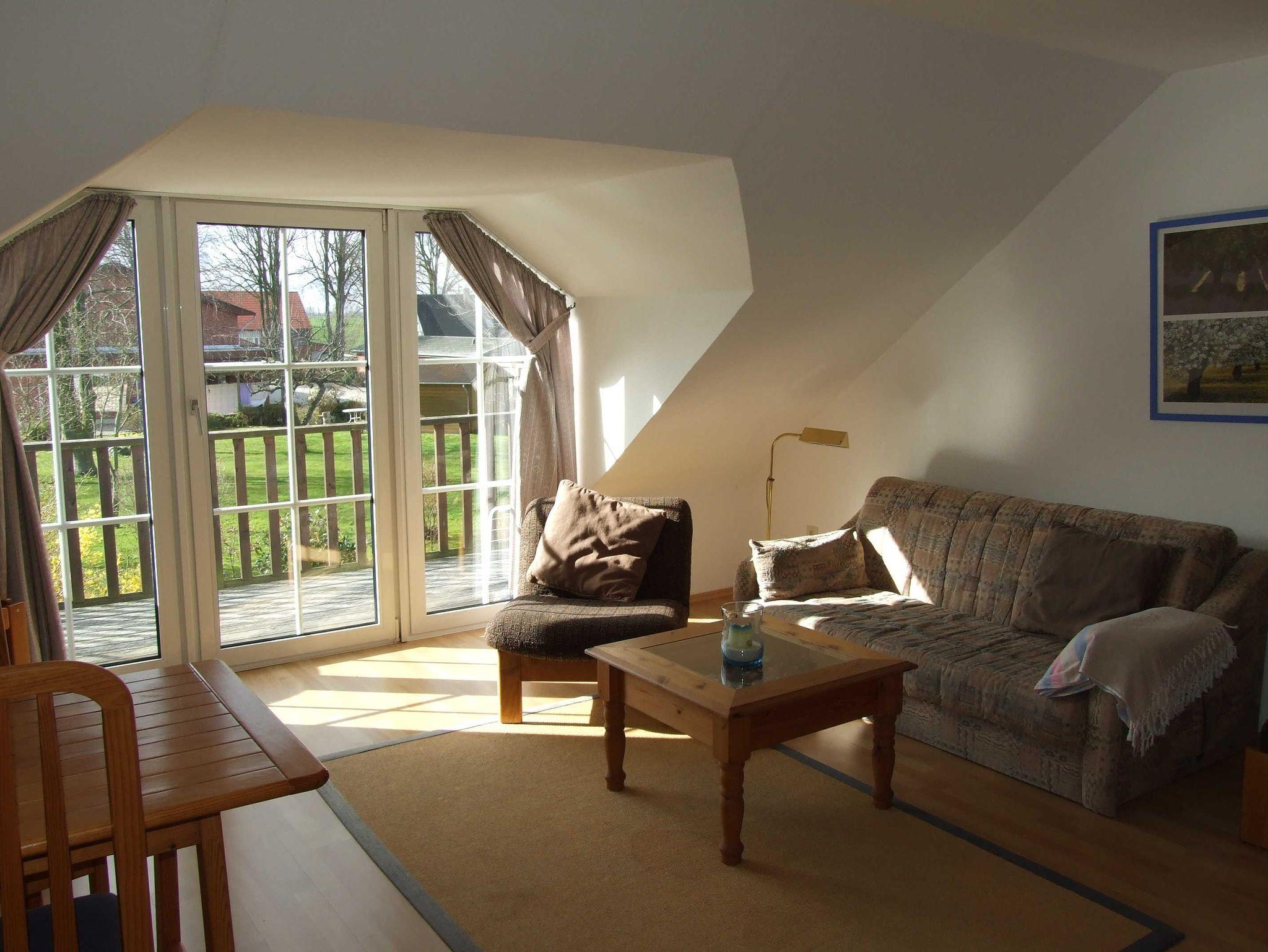 Die Ferienwohnung Holst liegt innerhalb einer kleinen Ferienanlage im Reihenhauscharakter und ist für 2-4 Personen geeignet. Die ca. 60m² große Maisonette-Wohnung verfügt in der 1. Etage über ein Wohnzimmer mit Schlafcouch, eine neue, offene Küchenzeile mit Backofen und Geschirrspüler sowie ein Badezimmer mit Wanne und WC. Das Schlafzimmer befindet sich im Dachgeschoss und ist ausgestattet mit einem Doppelbett und einem Beistellbett. Vom Wohnzimmer aus gelangen Sie auf den möblierten Balkon zur Westseite. Ein reservierter PKW-Stellplatz ist vorhanden.