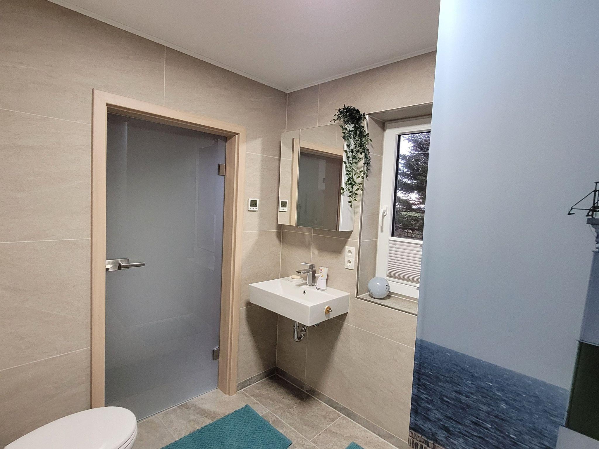 Außerdem befindet sich im Erdgeschoss noch ein Bad mit einer ebenerdigen Dusche, einer Infrarot-Sauna und Fußbodenheizung sowie ein Abstellraum, in dem sich eine Waschmaschine befindet.