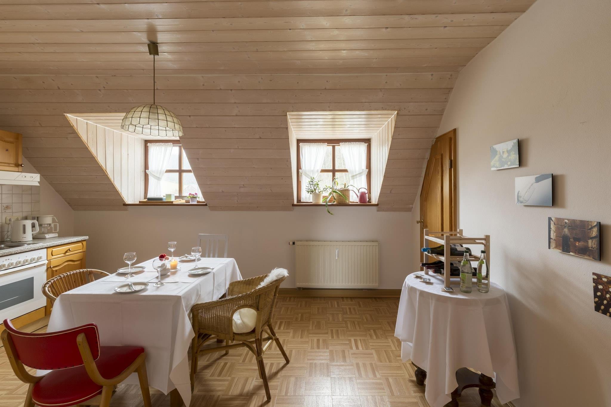Denne romslige 4-roms leiligheten, en kombinasjon av to enheter, ligger nær den bayersk-tsjekkiske grensen i den rolige landsbyen Lindau, og er ideell for store familier eller grupper på opptil 10 gjester. Hjemmet er omgitt av den naturlige skjønnheten til Øvre Pfalz-skogen, og tilbyr fantastisk utsikt over sine egne økologiske akvakulturdammer, hvor gjestene kan kjøpe fersk fisk. Innvendig har leiligheten et fullt utstyrt kjøkken, komfortable oppholdsrom og en balkong som er perfekt for morgenkaffe eller utsikt over solnedgangen. Den møblerte hagen inviterer til uteservering og grilling, mens rikelig med parkering for 15 biler sørger for bekvemmelighet for gruppereiser. Naturelskere vil nyte grenseoverskridende tur- og sykkelstier, mens attraksjoner i nærheten inkluderer Øvre Pfalz Lake District, Friluftsmuseet, Treetop Walk Neuschönau og Dyreparken Lohberg. Dagsturer til Regensburg, Pilsen og Praha gir kulturell stil til oppholdet ditt. Enten du søker eventyr eller ro, leverer dette tilfluktsstedet på landsbygda.