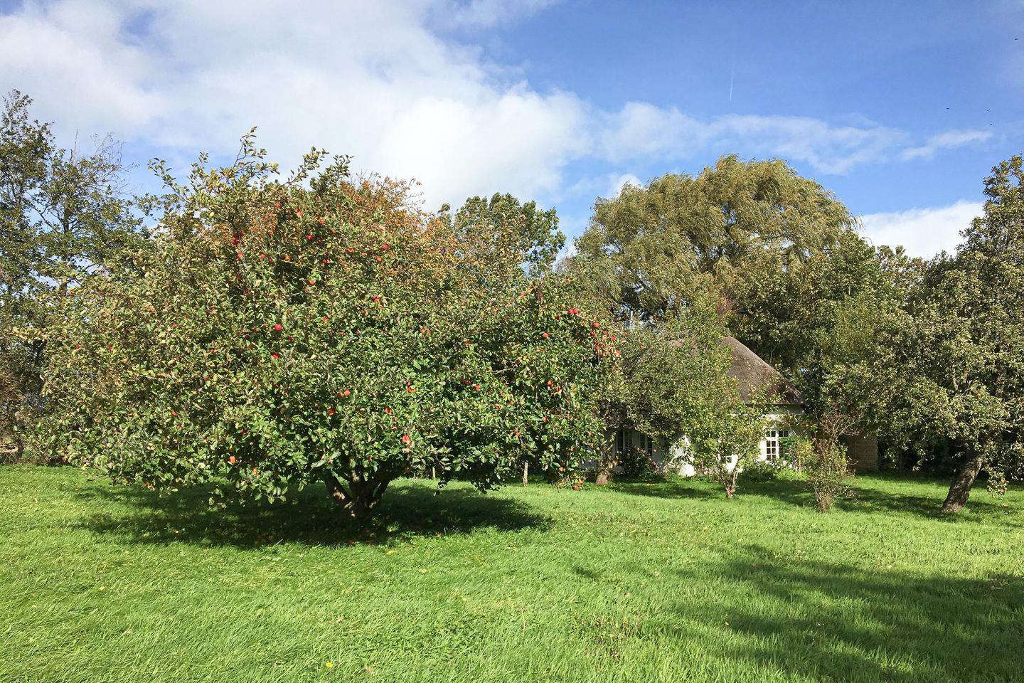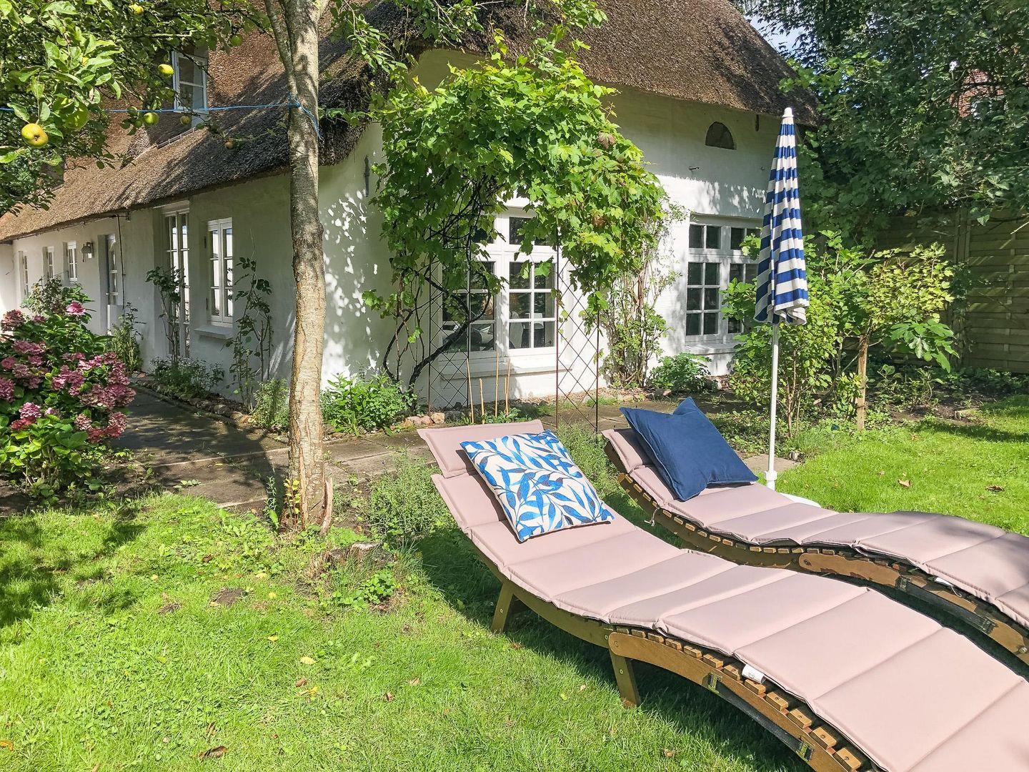 Durch die großen Fenster und die Terrassentür im Wohnzimmer hat man einen unverstellten Blick in den großen Garten. Der naturbelassene Garten mit 2.500 qm und zahlreichen alten Obstbäumen – u. a. Apfel-, Birnen-, Kirsch-, Mirabellen- und Pflaumenbäumen – ist ein wahres Bullerbü für Groß und Klein. Kinder haben viel Platz zum Spielen und Austoben. Zwei Terrassen mit Gartenmöbeln bieten genügend Platz, um den ganzen Tag frische Nordsee-Luft und Ruhe zu genießen.