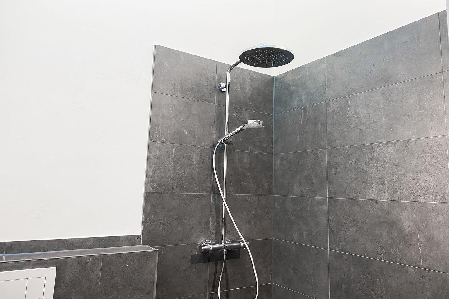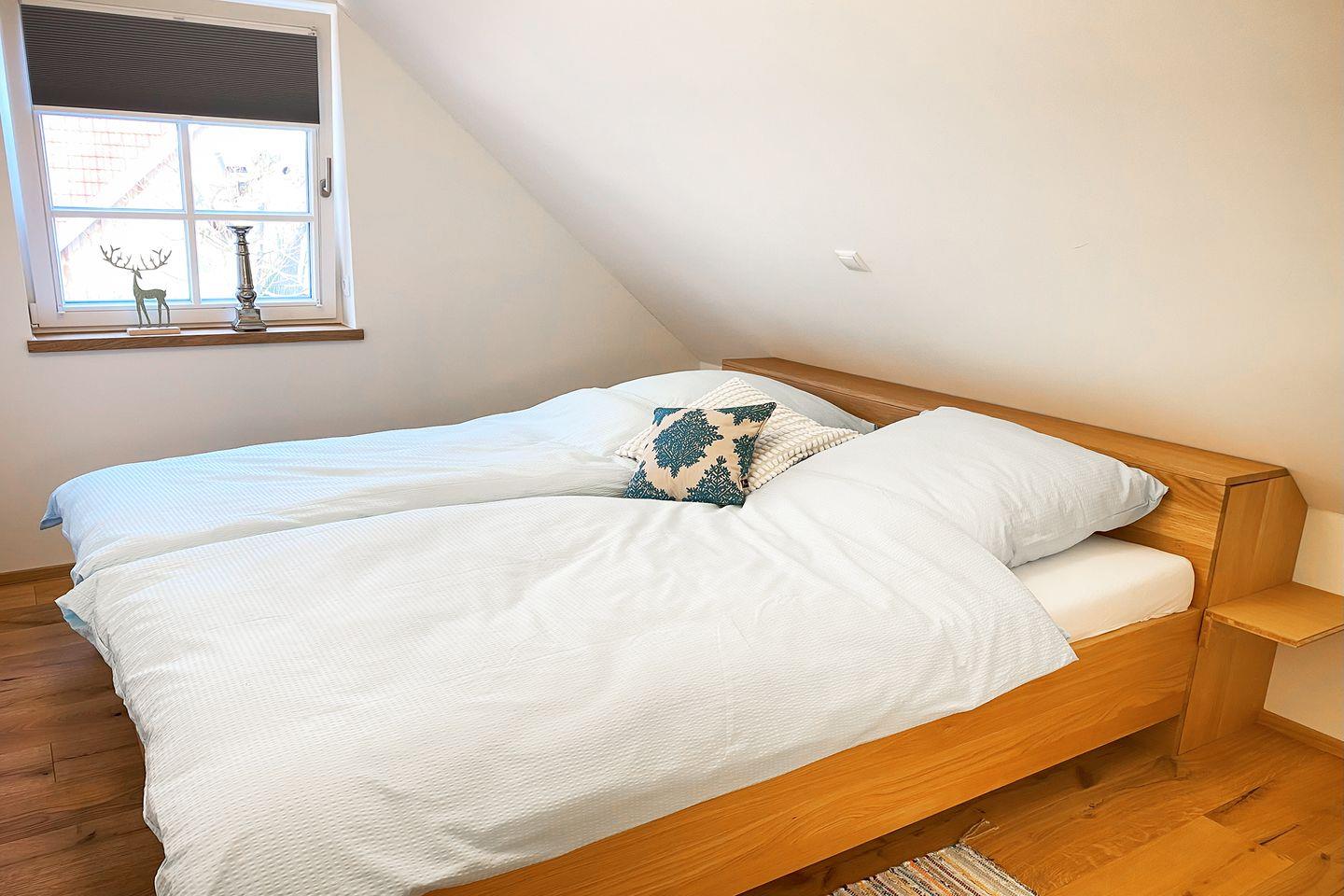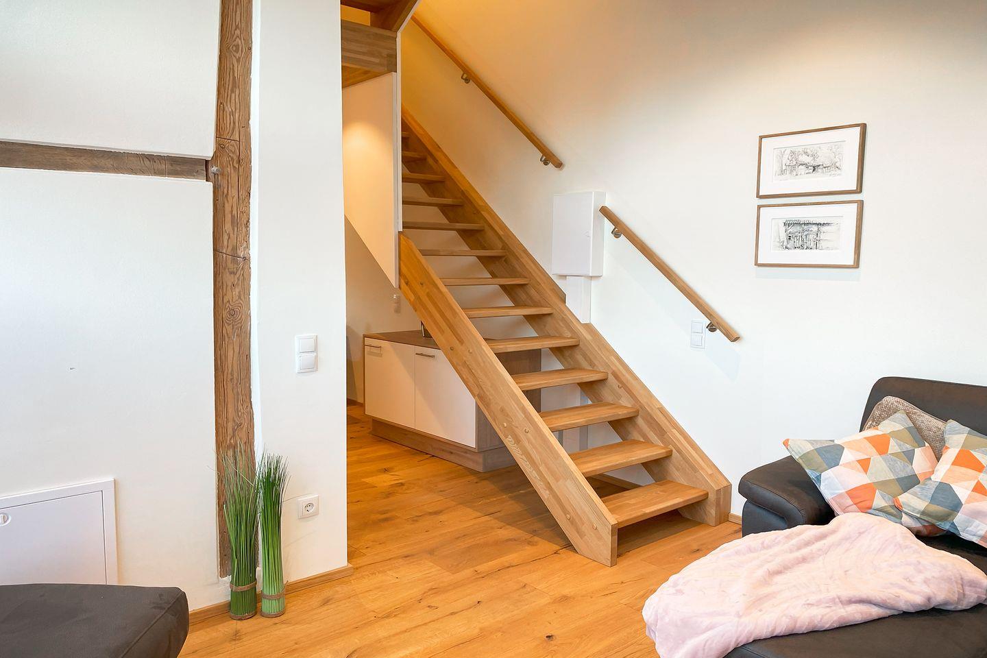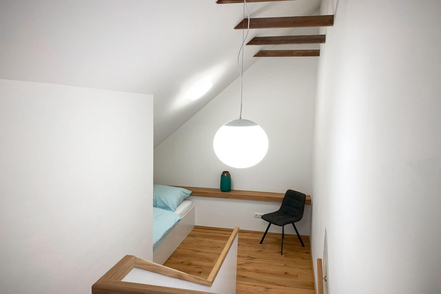 Die Schlafbereiche sind auf zwei Ebenen verteilt: Auf der offenen Zwischenempore befindet sich ein Einzelbett, eine halbe Treppe weiter oben wartet ein gemütliches Doppelbett. Offen, hell und dennoch behaglich – ideal für Paare oder kleine Familien.
