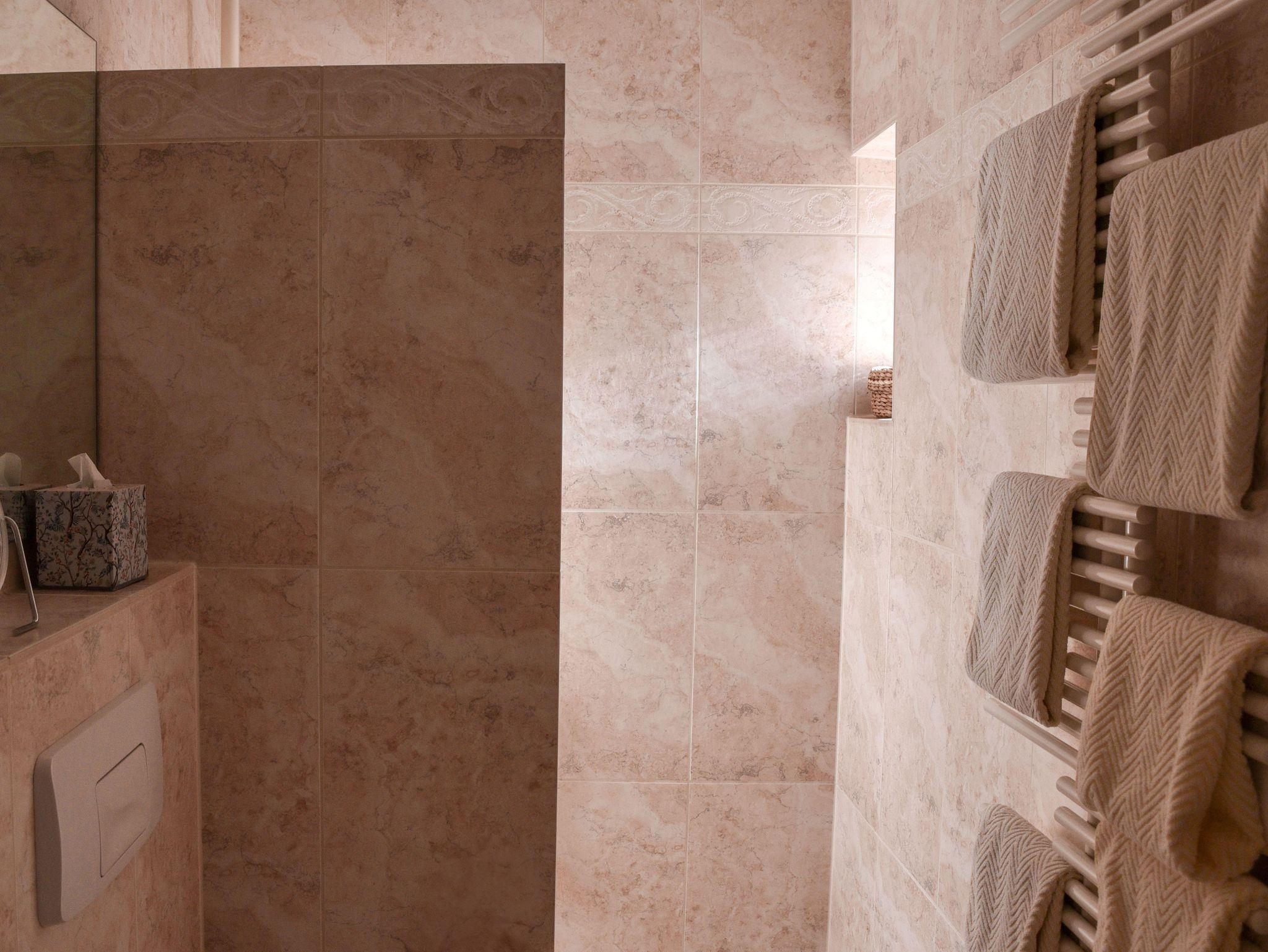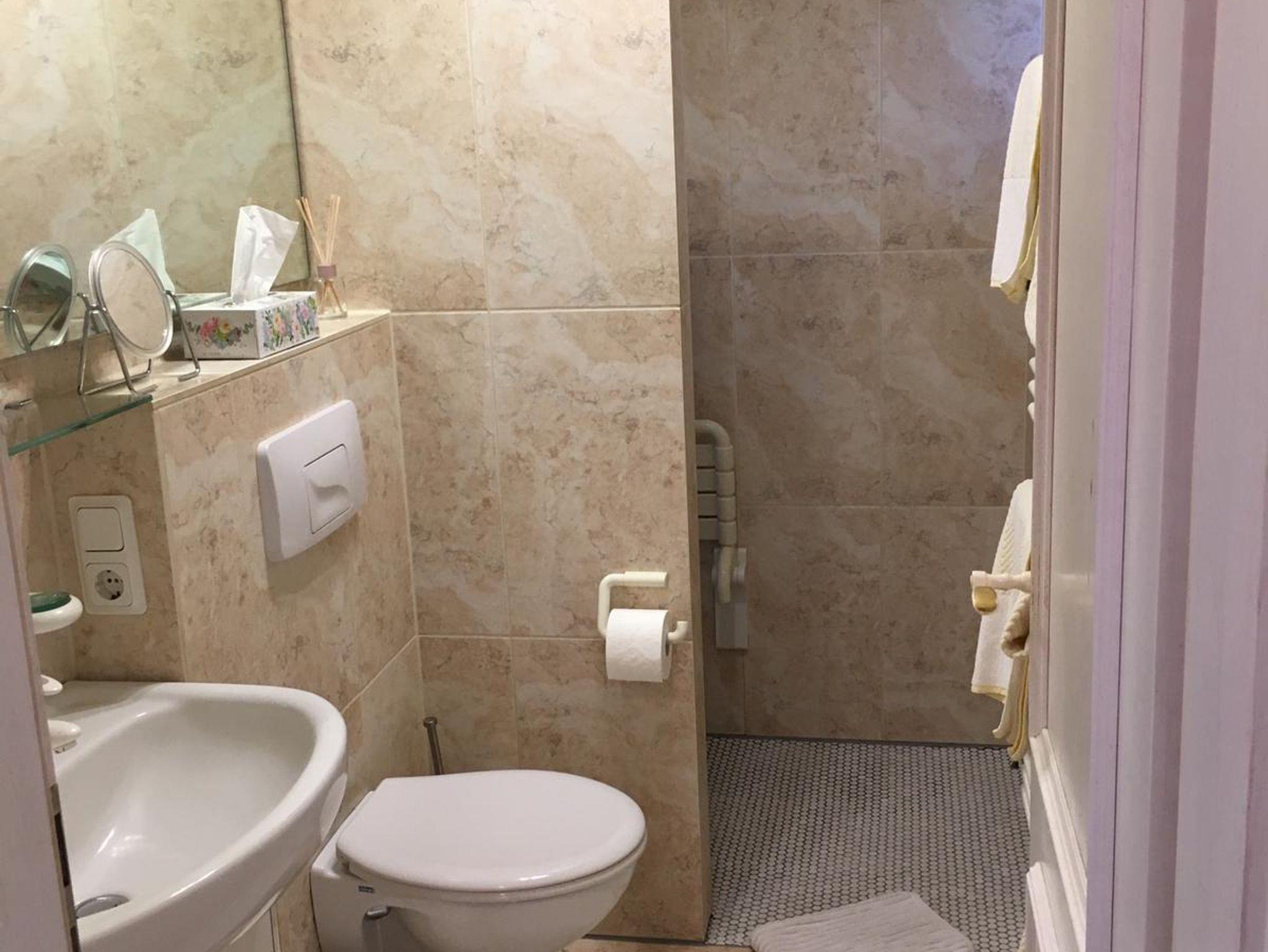 • Badezimmer mit ebenerdiger Dusche und WC und kleinem Fenster, Föhn – pro Person ein Badetuch, 2 Handtücher, Gästetuch und Waschlappen