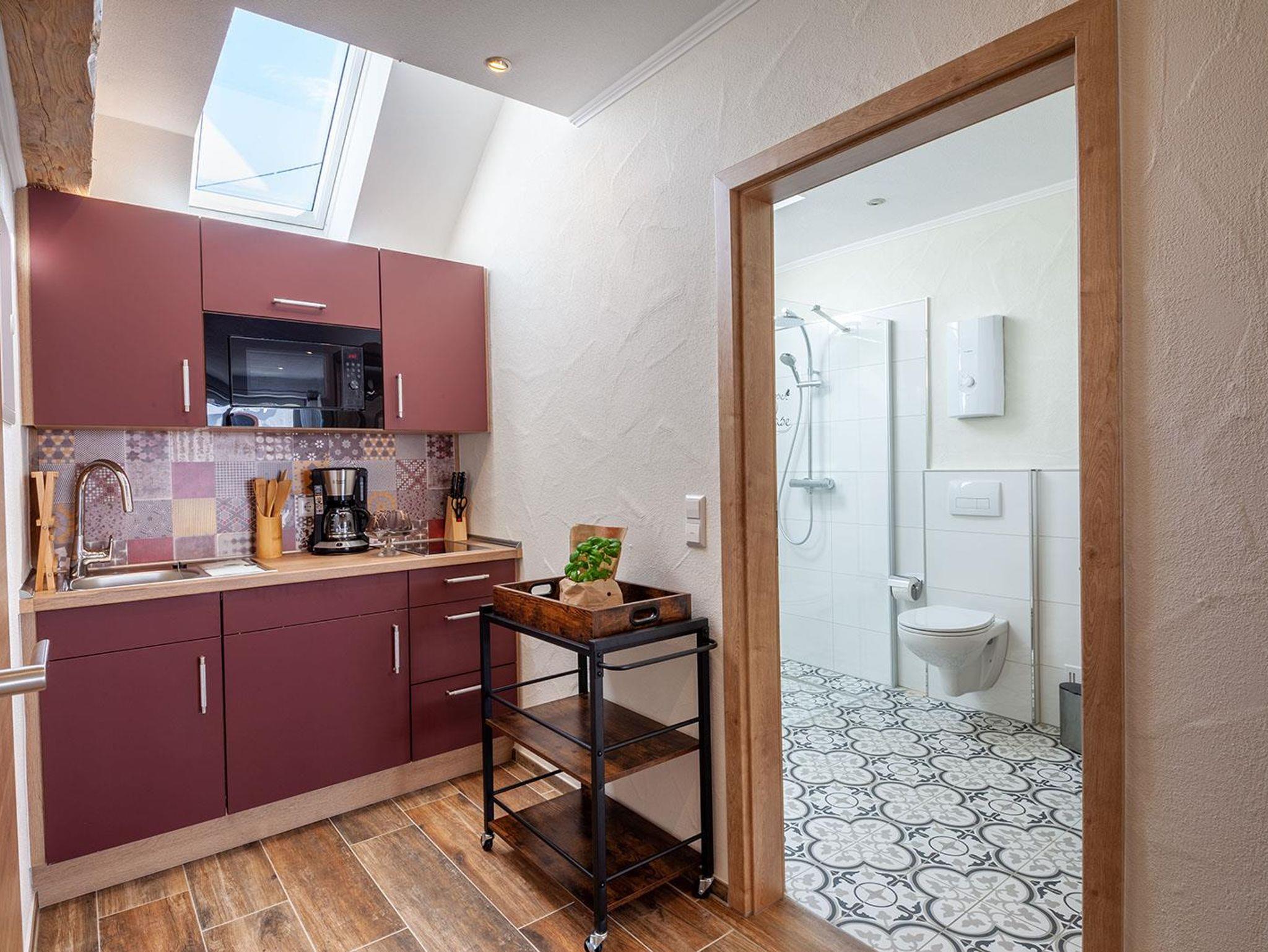 Alle drei Appartemens mit Maarblick (1x Erdgeschoss barrierefrei mit Terrasse und 2x im 1.Stock) bieten eine Küchenzeile inkl. Induktionskochfeld , Mikrowelle mit Backfunktion, Kühlschrank mit Gefrierteil, Toaster, Kaffeemaschine, WasserkocherGeschirr und Gläser und Besteck sowieGrundgewürze wie Salz-Pfeffer-Zucker-, Kaffeefilter, Geschirr – und Handtücher, Küchenrolle.