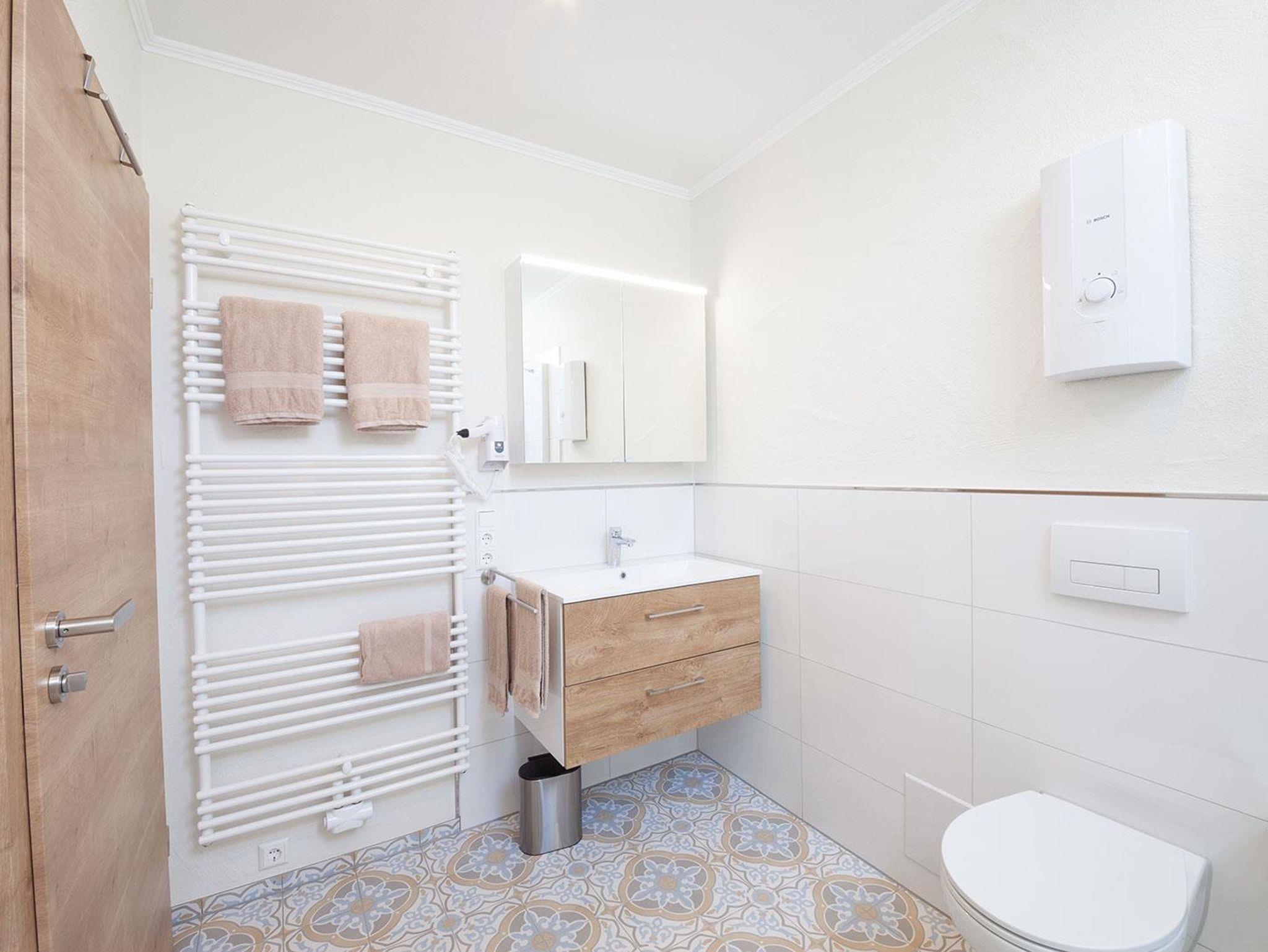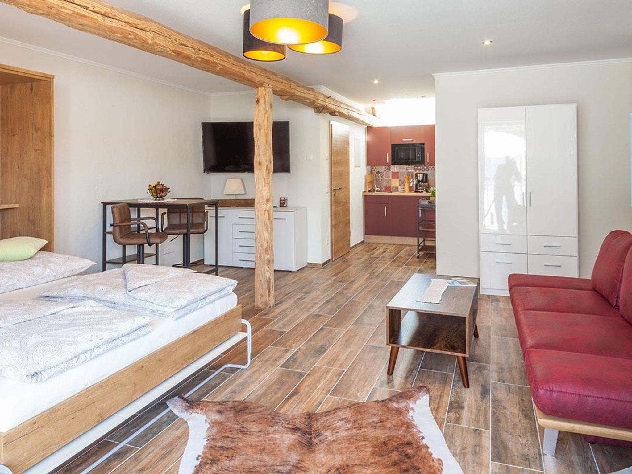 Das Wohn-Schlafzimmer hat ein gemütliches Bett, eine Couch, weitere Sitzgelegenheiten, Flachbildfernseher uvm.Das Bad ist mit Dusche, WC und Föhn ausgestattet und hält Bademäntel und pro Person jeweils 2 Badetücher und Handtücher bereit.Ebenfalls stehen Wlan, Waschmaschine und Trockner zur Verfügung.
