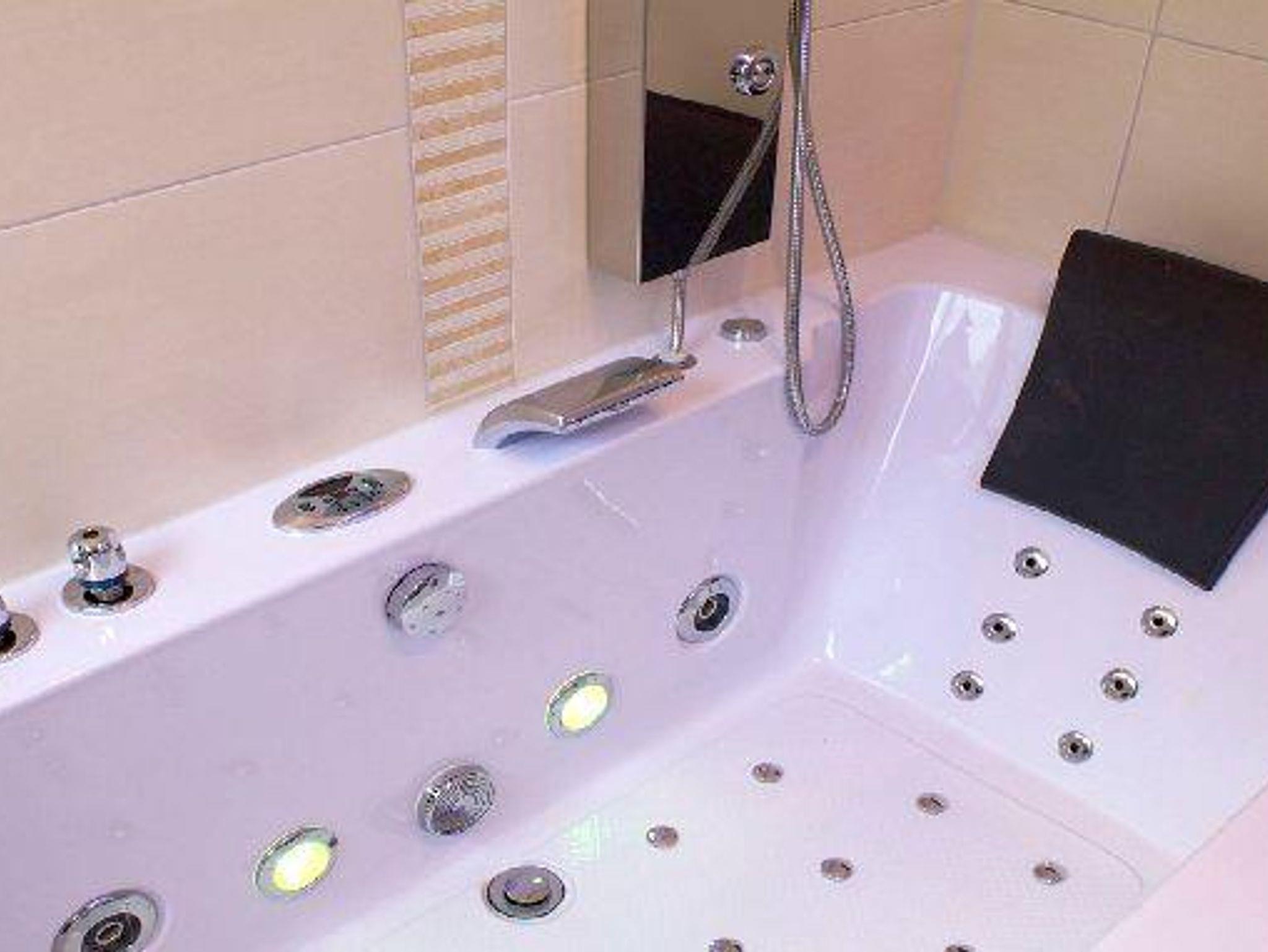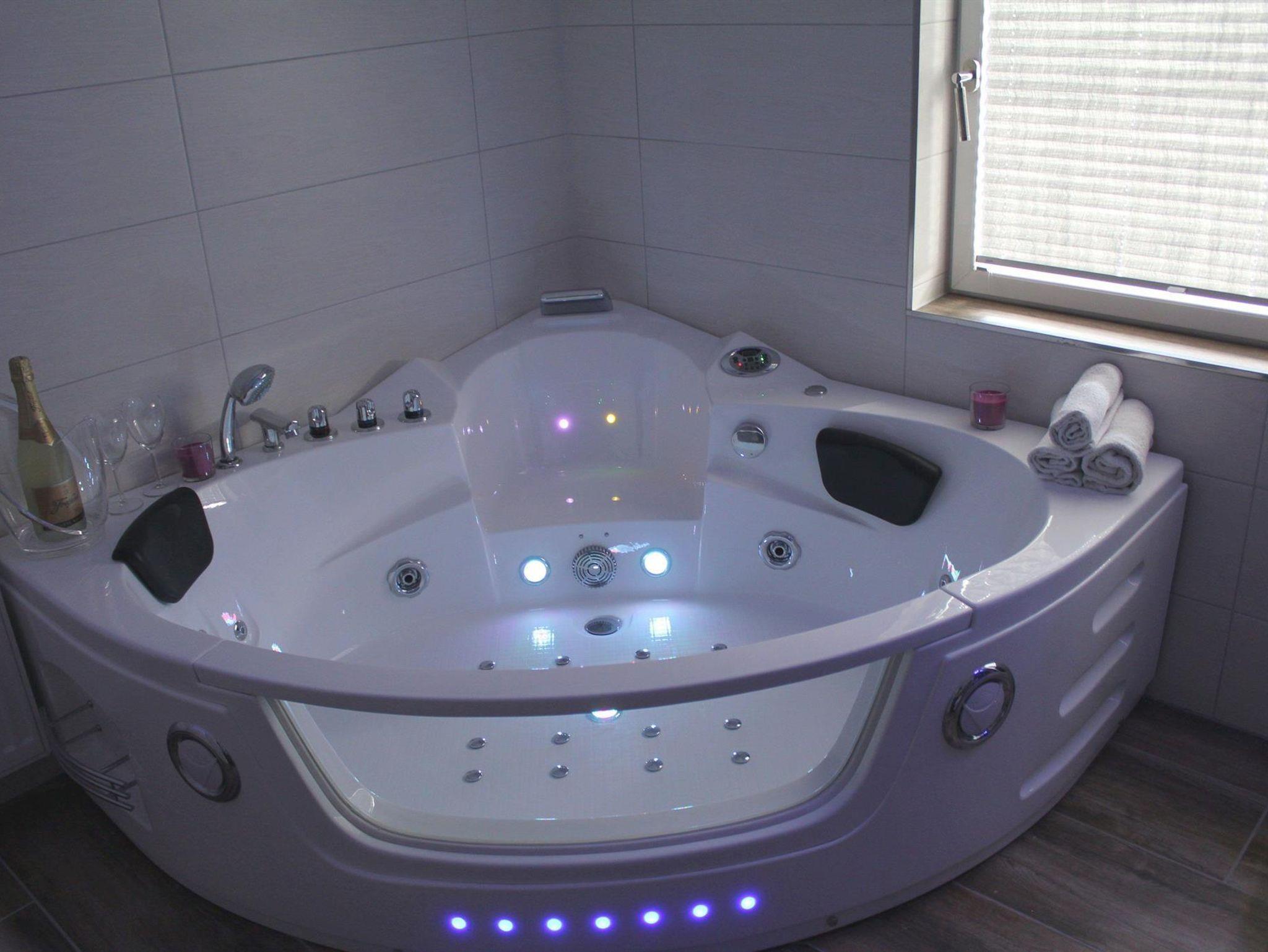 Im hellen Bad finden Sie einen 2 Personen-Whirlpool. Verwöhnen Sie sich selbst im Whirlpool mit einer Lichttherapie, der Whirlpoolfunktion und vielen weiteren Funktionen. Auch ein Radio ist integriert.
