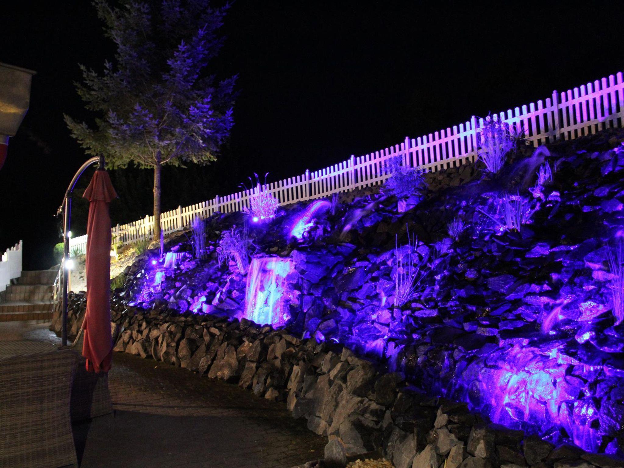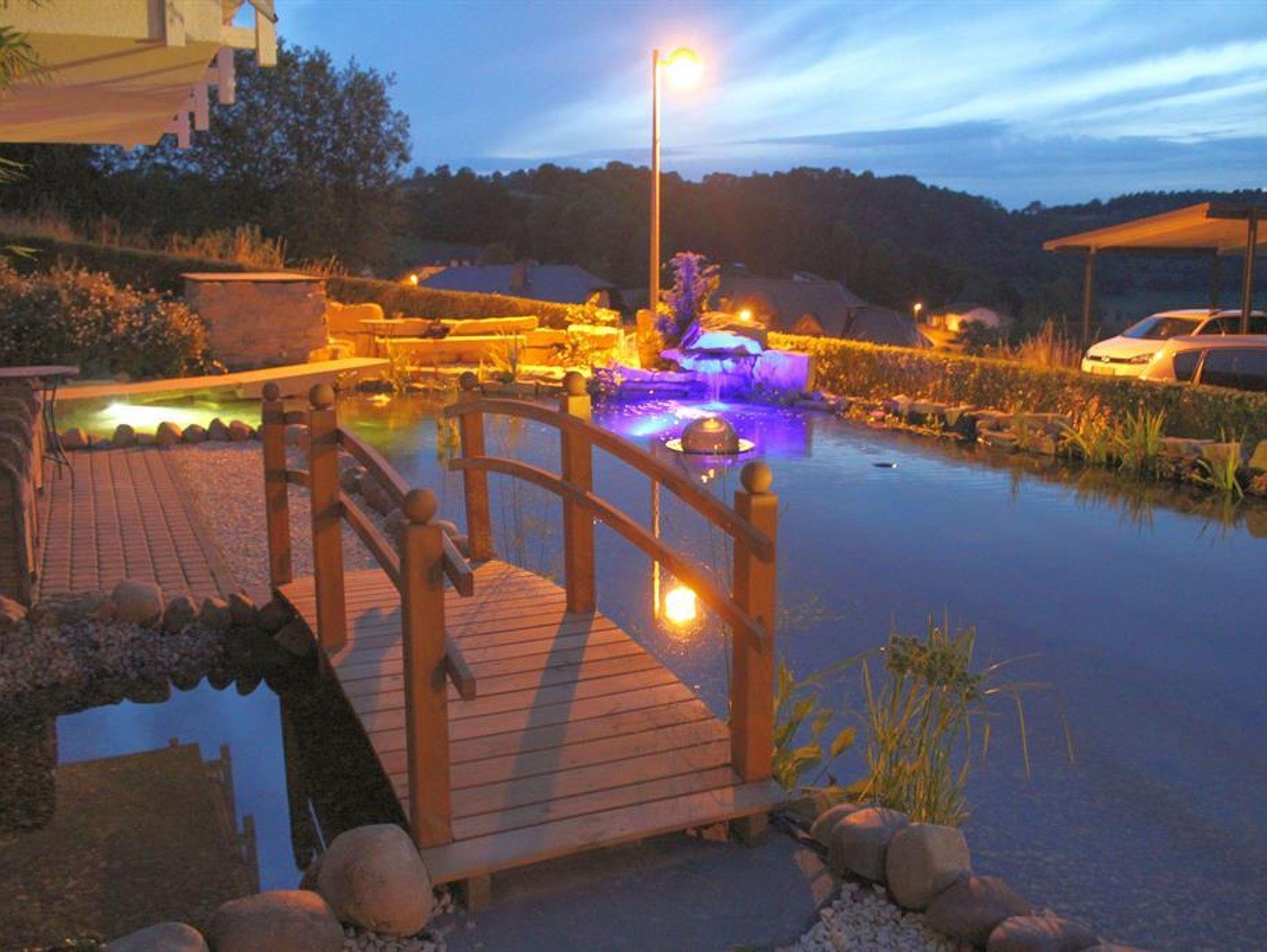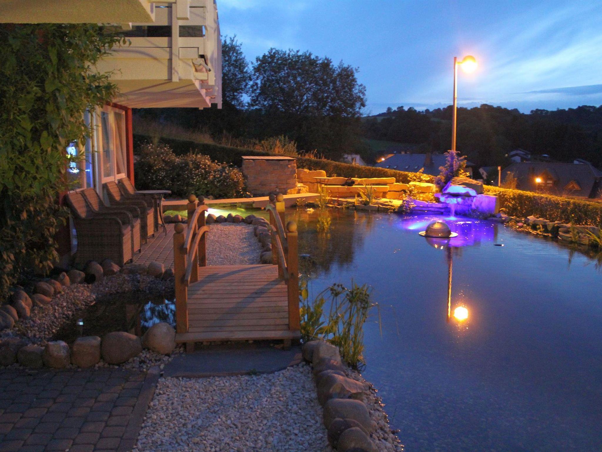 Zwei wundervoll und aufwendig angelegte Zierteiche mit Kois und anderen Fischen, 2 Wasserfälle, 2 Bachläufe und eine gepflegte Zierkiesanlage gehören zur Anlage. Die Aussenanlagen sind abends romantisch angestrahlt. In den Teichen befinden sich auch Schildkröten. Sitzen Sie gemütlich bei einem Kaffee oder einem Cocktail auf dem Balkon oder der Terrasse und schauen Sie den Fischen und den Schildkröten zu. Oder blicken Sie ins Tal auf den See.