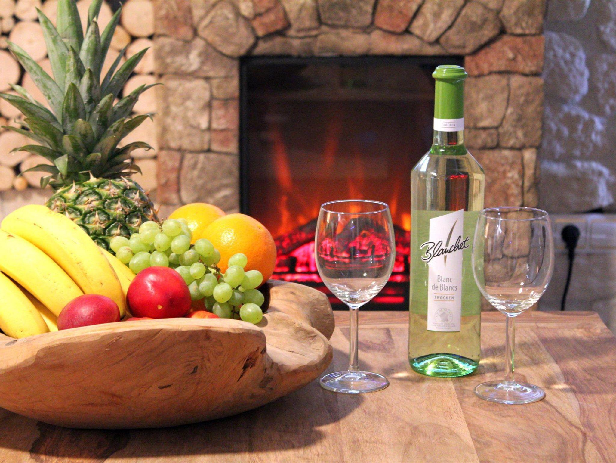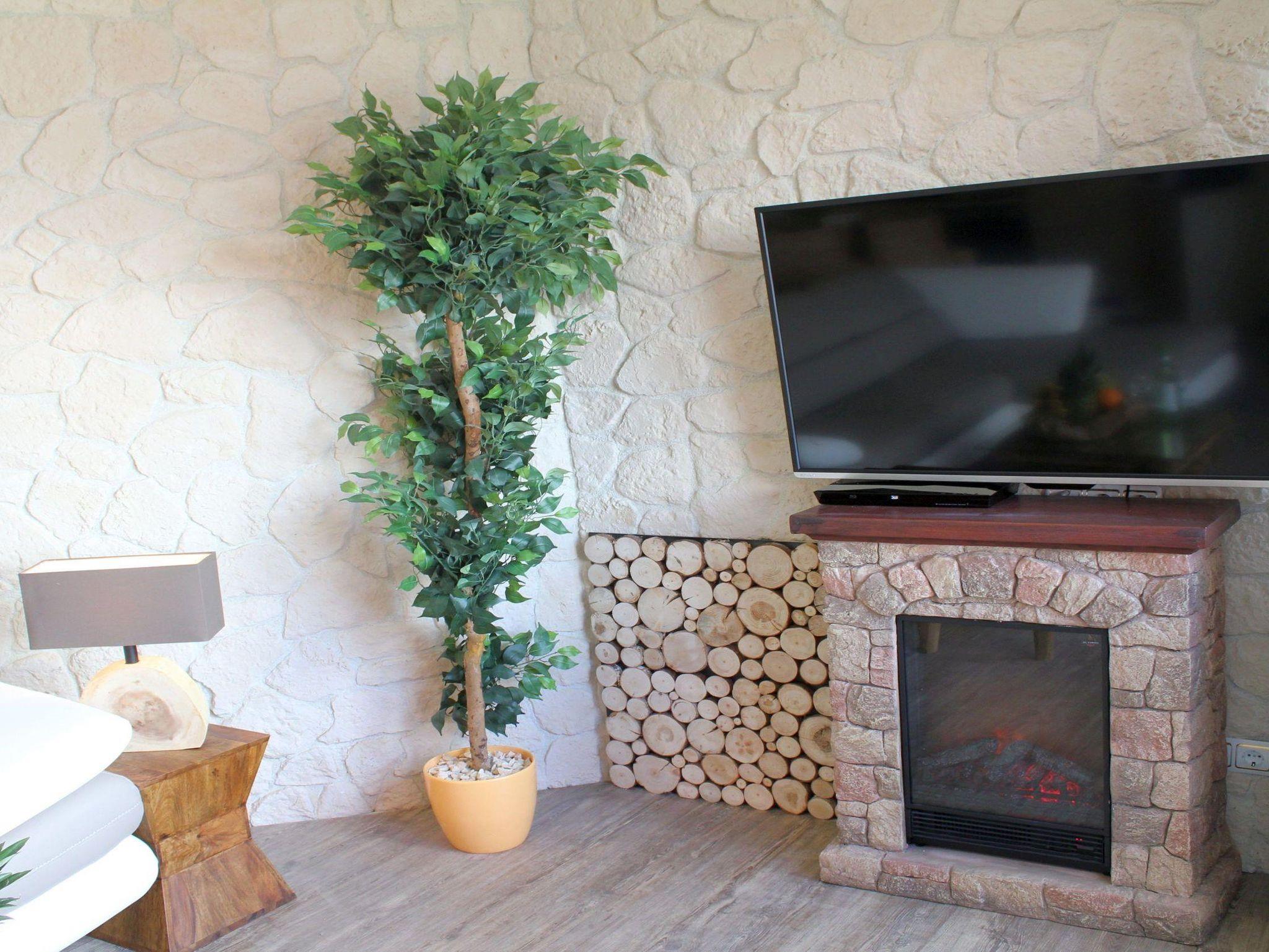 Die hell und freundlich eingerichtete Wohnung vermittelt einen naturverbundenen Flair mit viel Holz und Stein. Zudem verbreitet der Elektrokamin und ein eleganter Deckenventilator eine besondere, gemütliche Atmosphäre.
