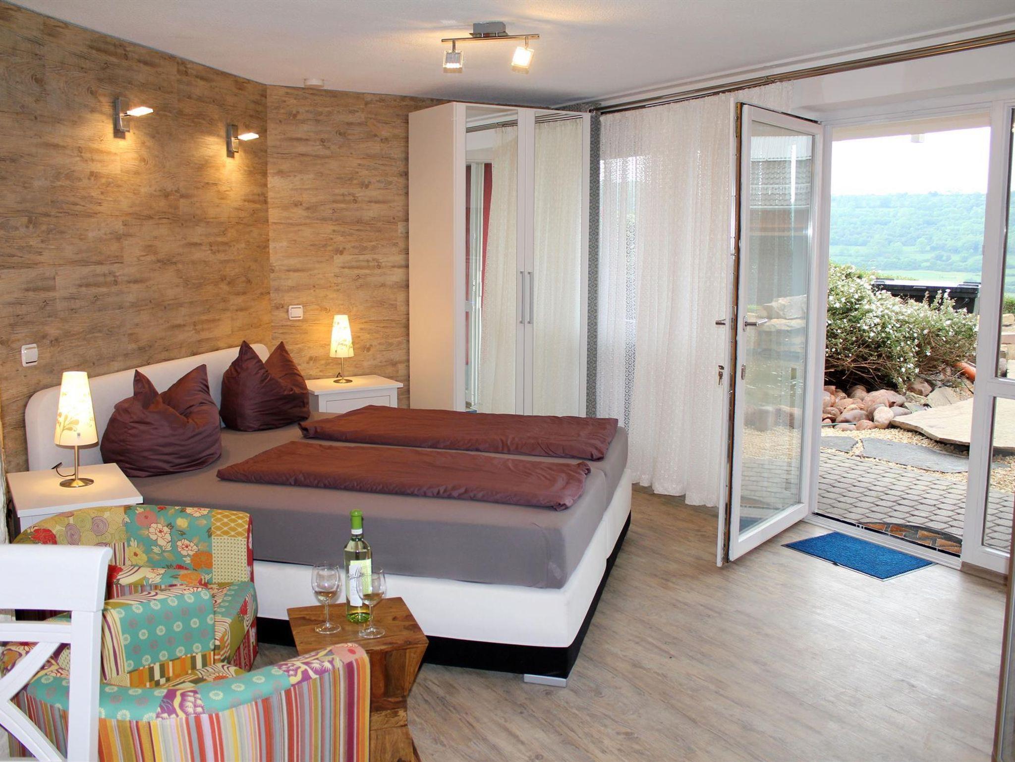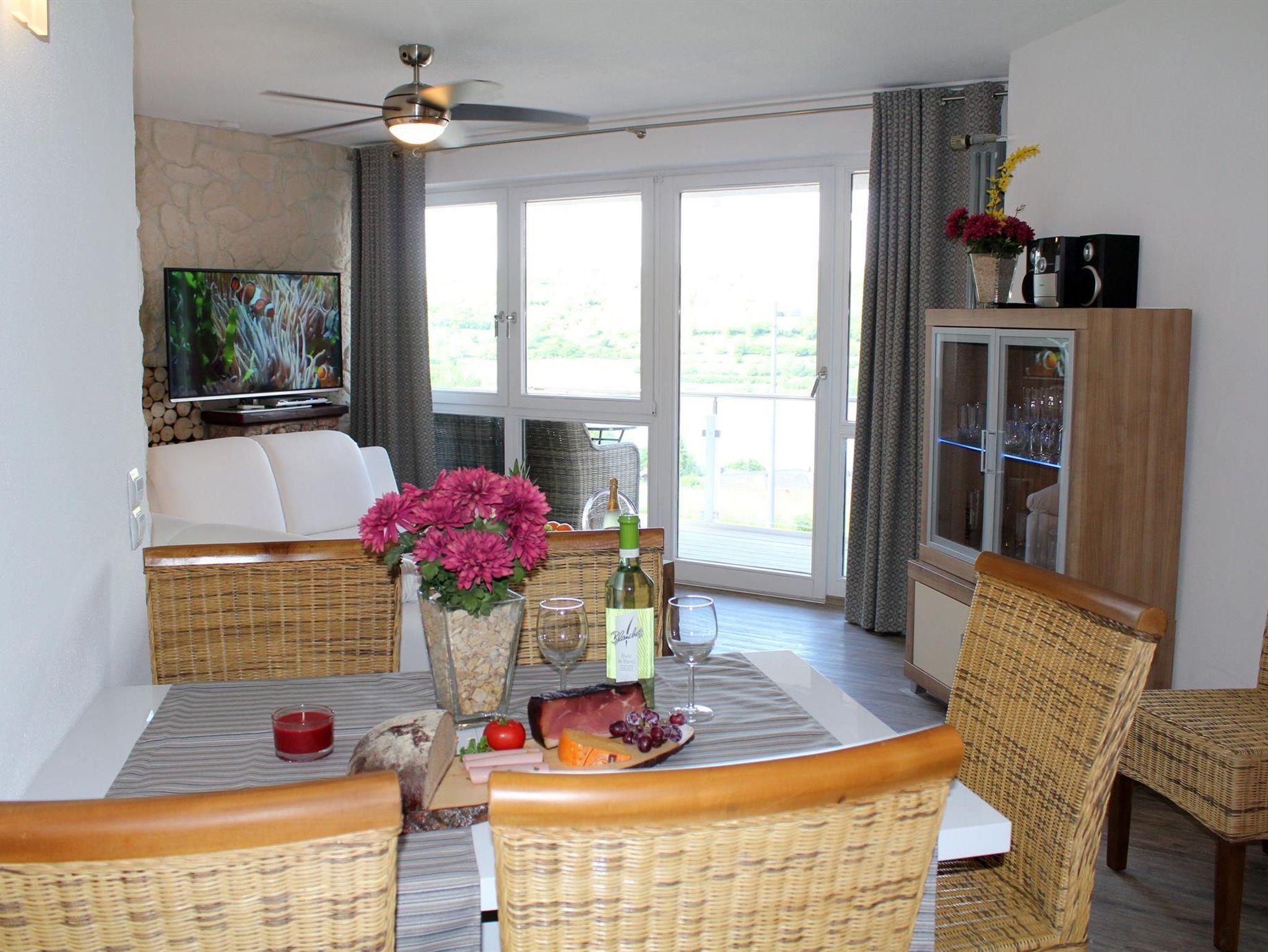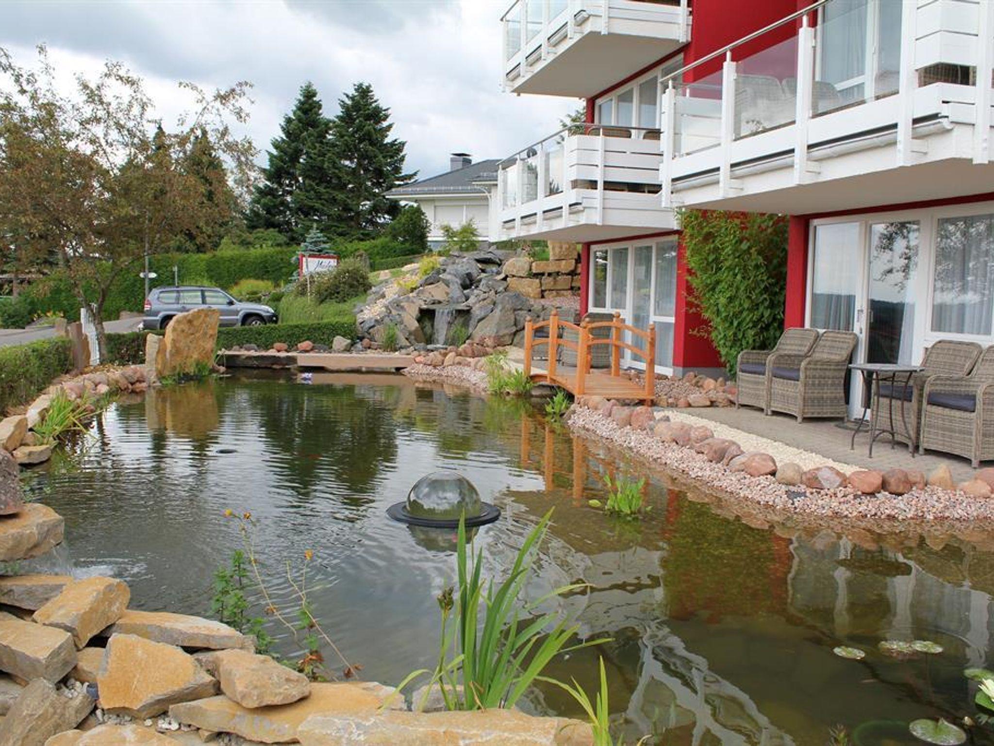 Ferienwohnung Maarpanorama im Maarberg Resort: Elegante, komplett neu eingerichtete Ferienwohnung für 2 bis 6 Personen. ca. 58 qm Wohnfläche, Balkon Richtung See und Zierteich.
