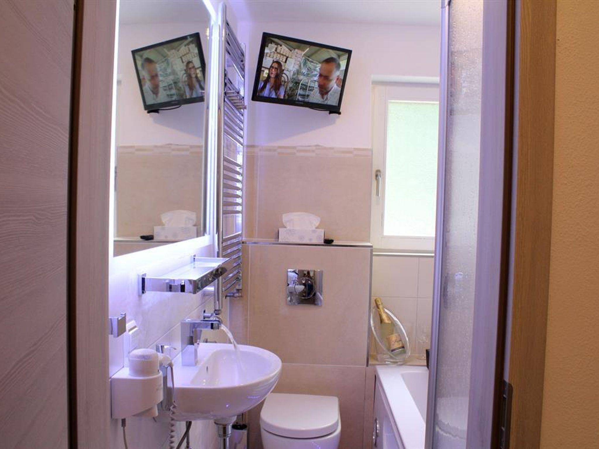 Ein großer, beleuchteter Spiegel, ein Hotelfön und eine Personenwaage sind vorhanden. Moderne Heizung mit Handtuchwärmer.