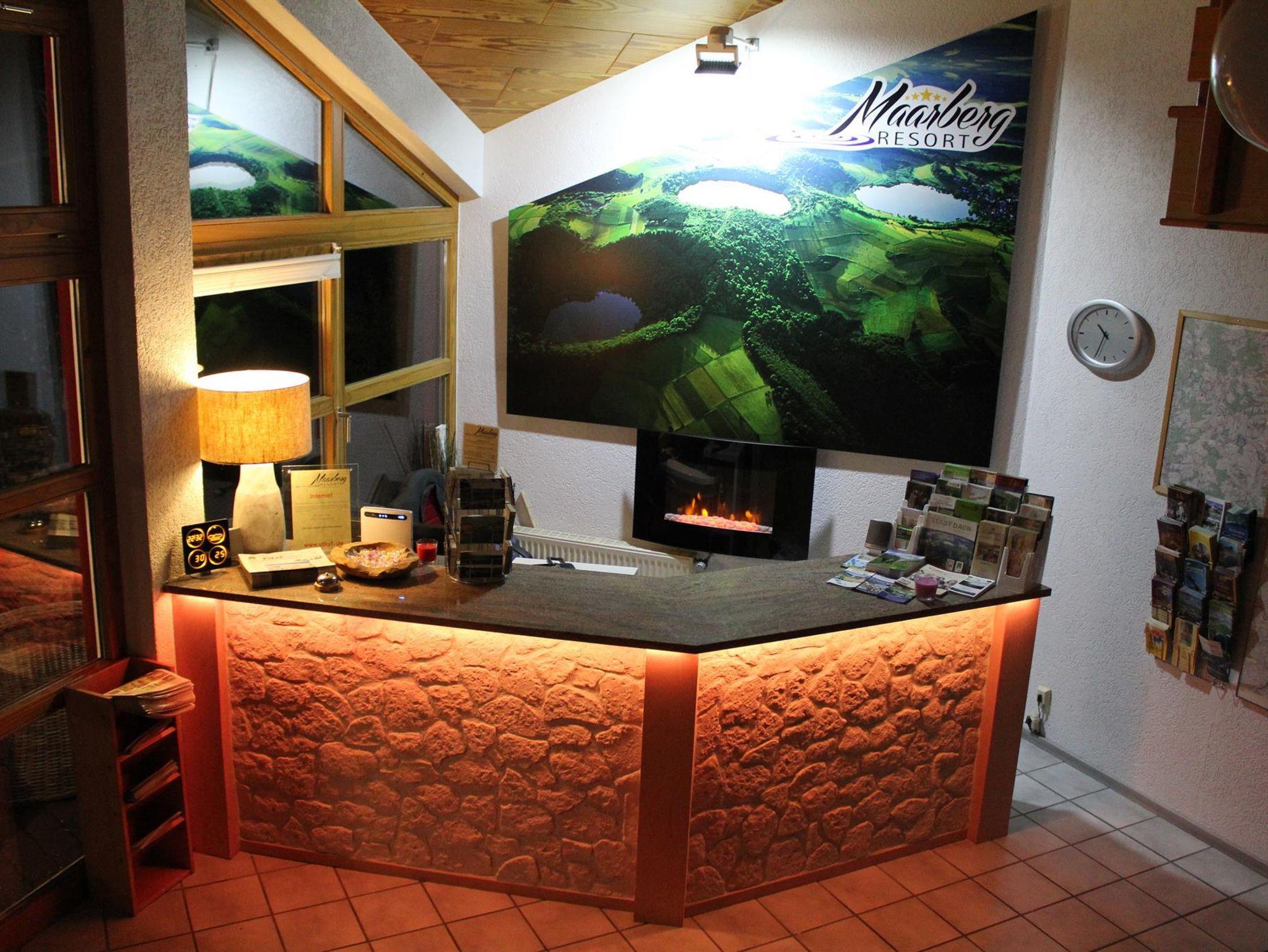 Im Haus: Empfangshalle mit Reception. Sauna und Solarium finden Sie im Untergeschoss des Maarberg Resorts. Sie können die Sauna auch alleine nutzen (abschließbar). Zudem im Untergeschoss ein Raum mit Waschmaschine, Wäschetrockner, Bügeleisen und Bügelbrett.